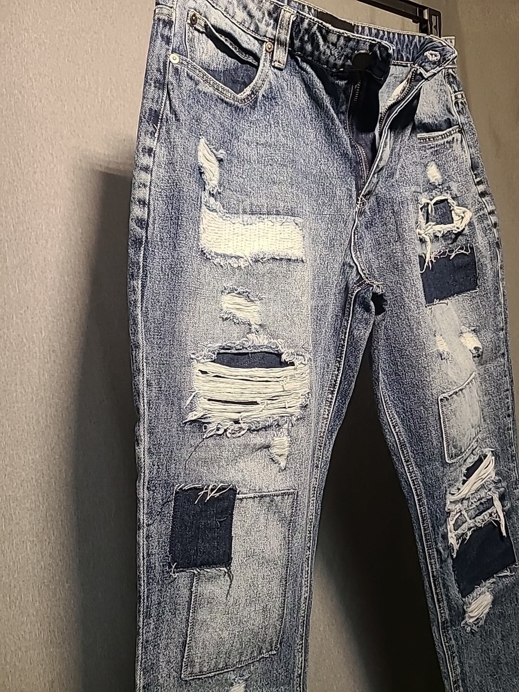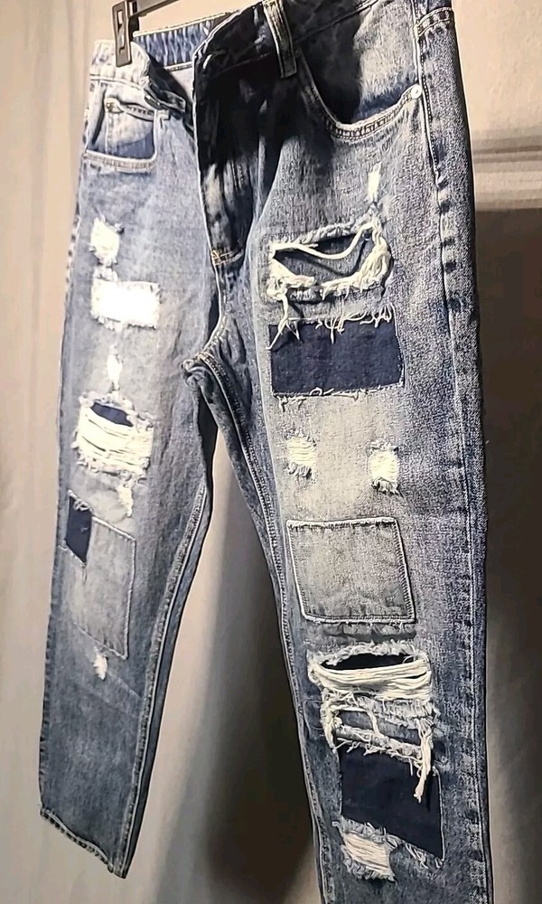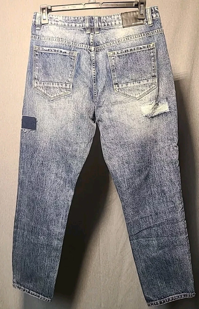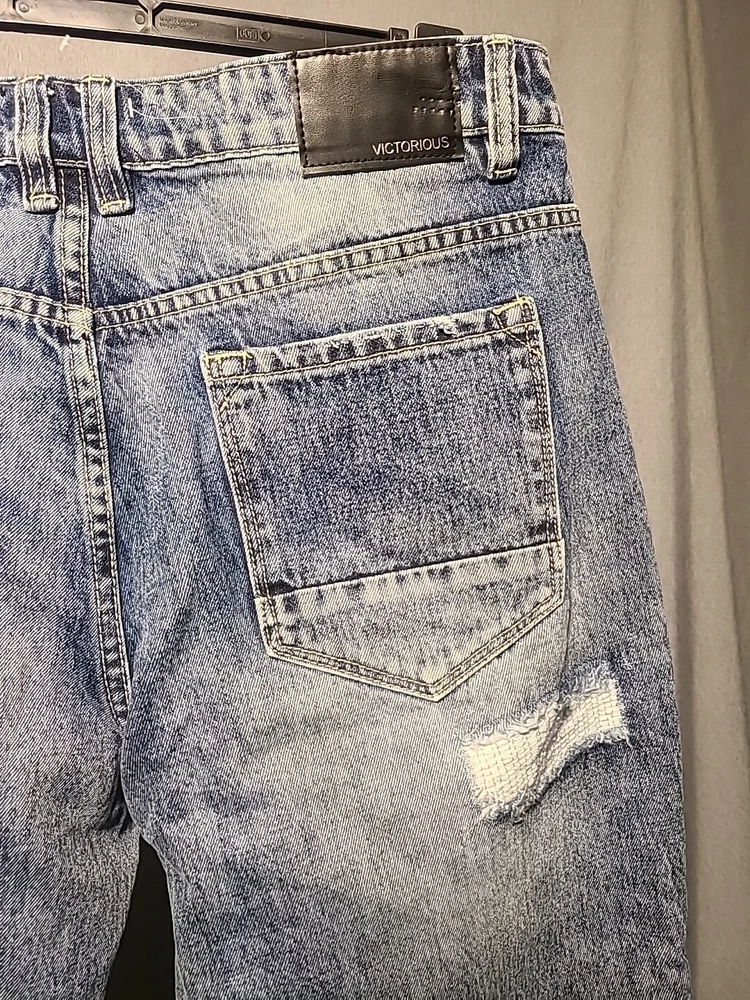Elevate your style with these baggy jeans from VICTORIOUS. These relaxed fit jeans are perfect for skaters and hip hop enthusiasts. Made from durable denim, these jeans feature a wide-leg style, a high rise, and a 5-pocket design. The distressed patches add a unique touch to the vintage look, making them perfect for any season. These medium wash jeans are machine washable and have a waist size of 34 inches with a 30-inch inseam. Excellent pre-owned condition. Stored in AC pet smoke free facility. Thanks for shopping by. Packed and ready to ship!