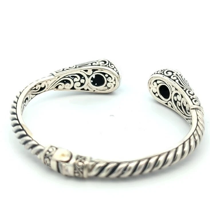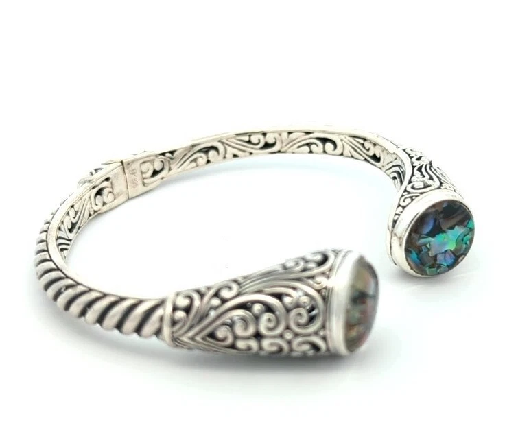 This is a gorgeous natural mother of pearl hinged cable bangle bracelet set in solid sterling silver 925. The timeless classic design by Samuel B Behnam is a true statement of incredible artisanship. The bracelet features the beautiful mother of pearl has beautiful color and clarity. The bracelet is a closeout from an upper end boutique with a retail tag of $375.00. The bracelet is stamped 925 with the designers trademark. Metal: Sterling Silver Metal Purity: 925 Gemstone: Mother of Pearl Bracelet Size: 6.5 / 7.0 inch Bracelet Dimensions: 12.5 mm by 5.5 mm Bracelet Weight: 28 grams