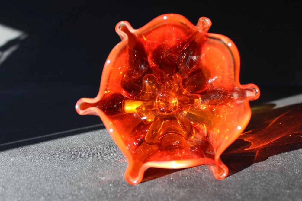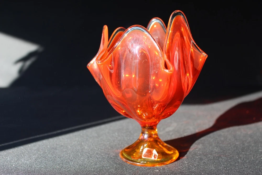 The Viking Epic Amberina Swung Glass Handkerchief Vase is a stunning piece of Mid-Century Modern art glass. Standing at 7.5 inches tall, this vase features a unique 6 petal pedestal design in a vibrant orange color, typical of the Amberina glass style. Hand-blown in the United States during the 1960s, this abstract art piece by Epic is a beautiful representation of the era's artistic style and craftsmanship. Perfect for collectors of vintage glassware or those looking to add a touch of retro beauty to their home decor.