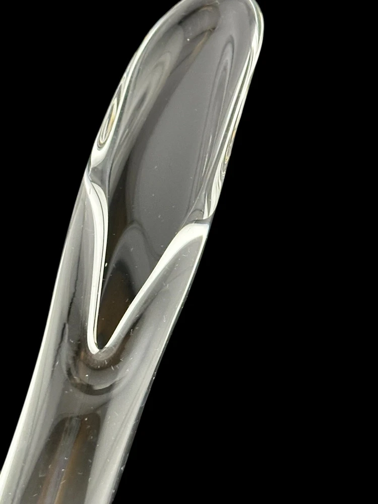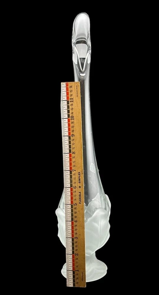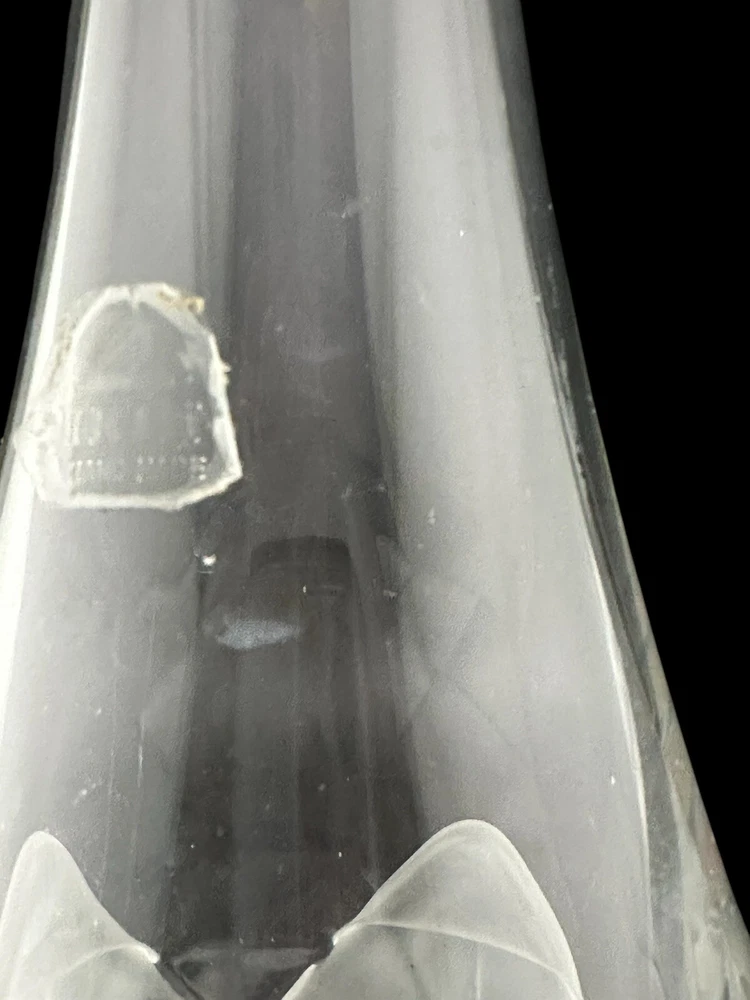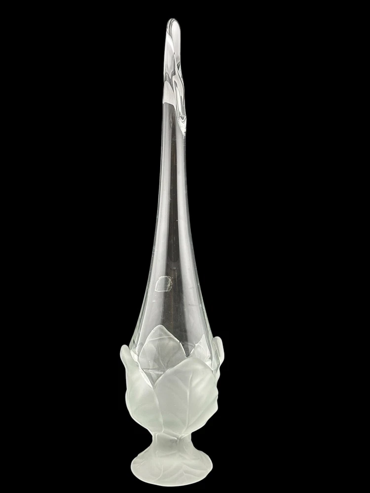 Viking Epic Leaf Cabbage Swung Vase Clear Satin Glass Stretch 15 3/4” Tall Vtg The original sticker has rolled edges. There are water spots on the inside. If you have the right cleaning products and equipment that lets you get inside the vase, you should be able to get them cleared out. Approximate Dimensions: 15 3/4” tall