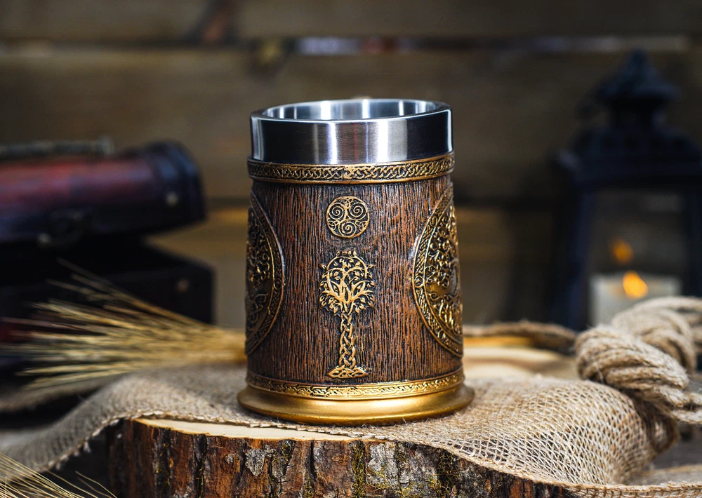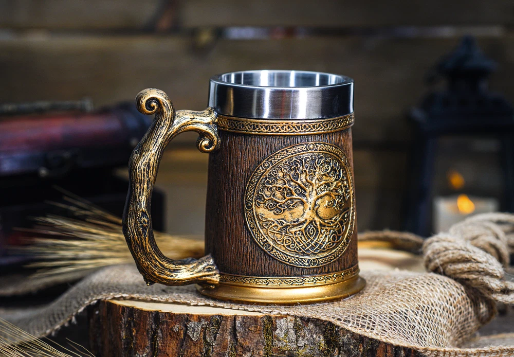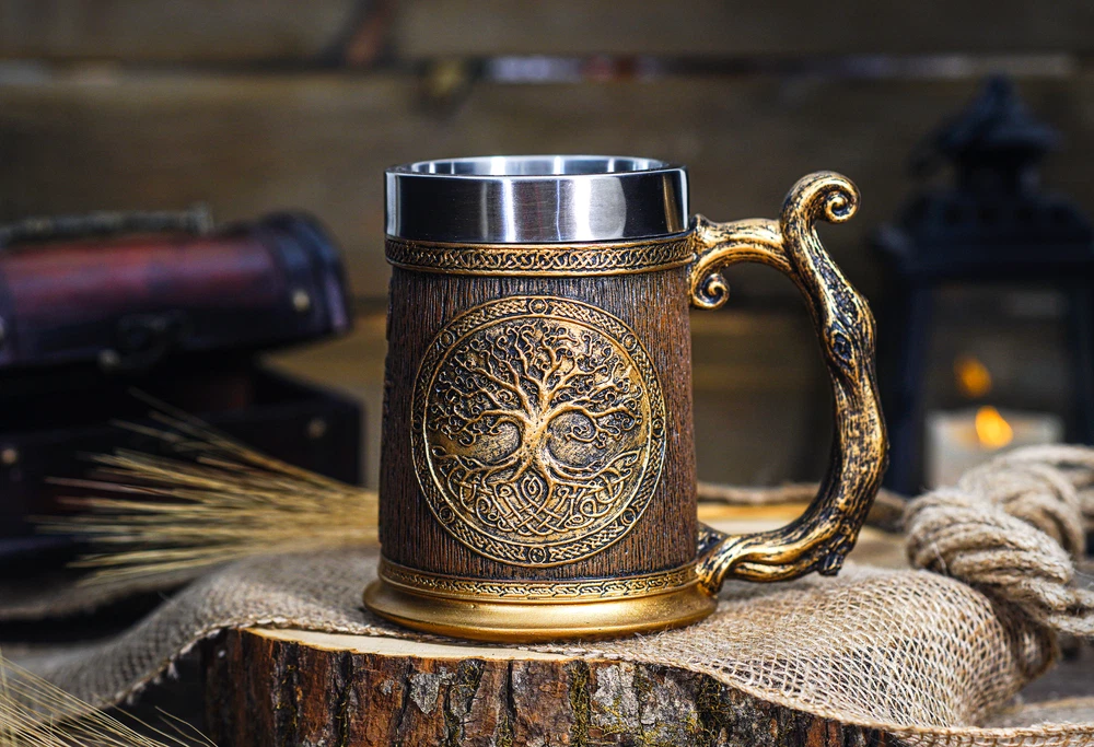 Viking Mug, Tree of LIfe, Thor & Odin, Tankard Nordic Beer Cup Stainless Steel