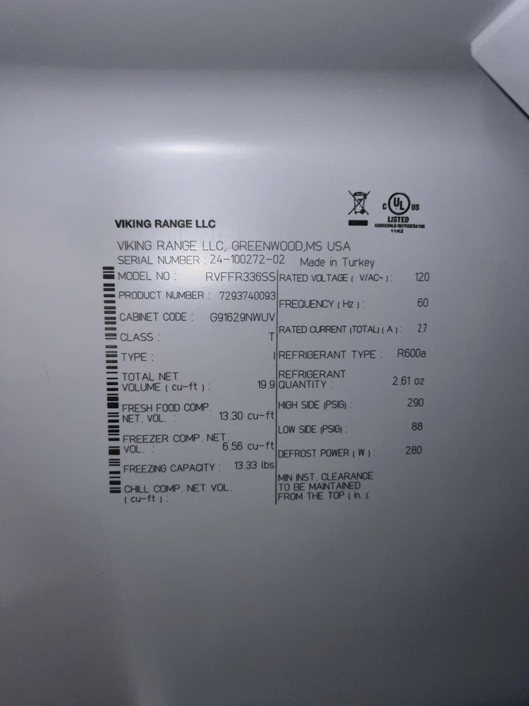 Model:RVRF3361SSInstallation:FreestandingDefrost Method:Frost-Free/Automatic DefrostColor:SilverDoor Style:Opens Left and RightFeatures:LED Lighting, Ice MakerNumber of Doors:2Ice Maker Location:With Ice MakerBrand:VikingItem Height:69.5in., 69.5 inItem Depth:29.5in.Finish:Stainless SteelType:French Door RefrigeratorUPC:0012505646126gtin13:0012505646126Item Width:35.63in., 35.63 in, 36.25in.Number of Drawers:1Capacity:22.1 cu ft.