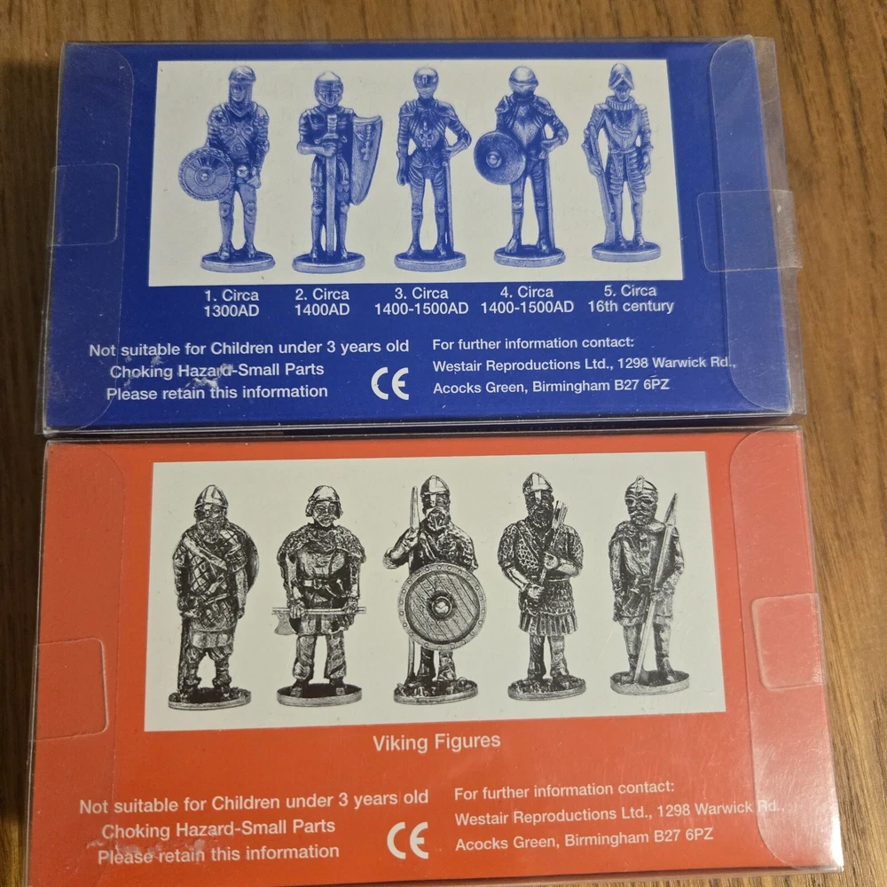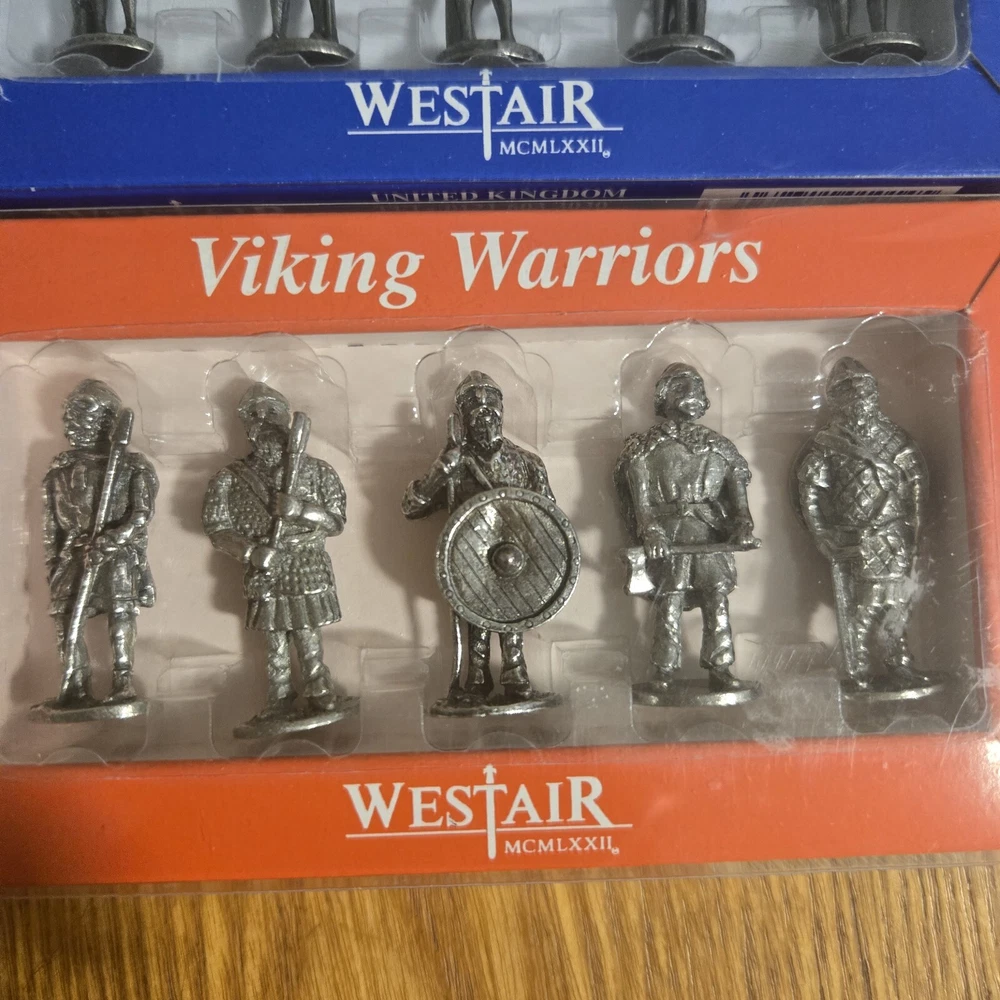 This vintage miniature set by Westair features four detailed pewter figurines of Viking Warriors in armor. Each figure measures 1.5 inches in height and is part of a 1990 collection, making them a unique addition for collectors or historical enthusiasts. The pewter material and intricate design showcase the craftsmanship of these miniature models, which are suitable for ages 3 and up. Made in the United Kingdom, these figures offer a glimpse into the world of militaria and the era of Viking warriors.
