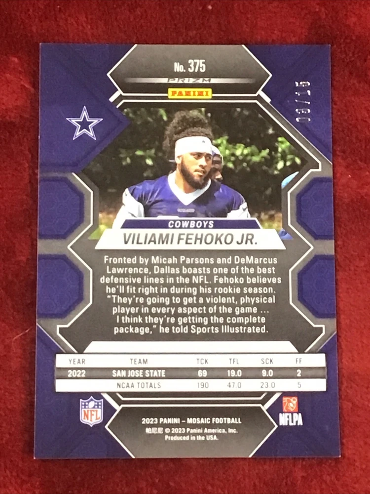 This rare Viliami Fehoko Jr. trading card is a must-have for any Dallas Cowboys fan. With a limited print run of only 15, this blue fluorescent mosaic card is a exclusive collectors edition that features a parallel/variety design. The card is made of high-quality card stock with a thickness of 35 Pt. and is an original release from the 2023 Panini Mosaic set. In addition to being a highly sought-after collectible, this card also commemorates a significant event in Viliami Fehoko Jr.'s career. As a rookie card, it celebrates his potential and talent as a football player. The card is printed in English and manufactured in the United States by Panini. Don't miss out on the chance to own this unique and valuable sports trading card.