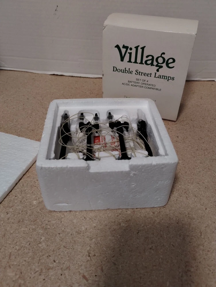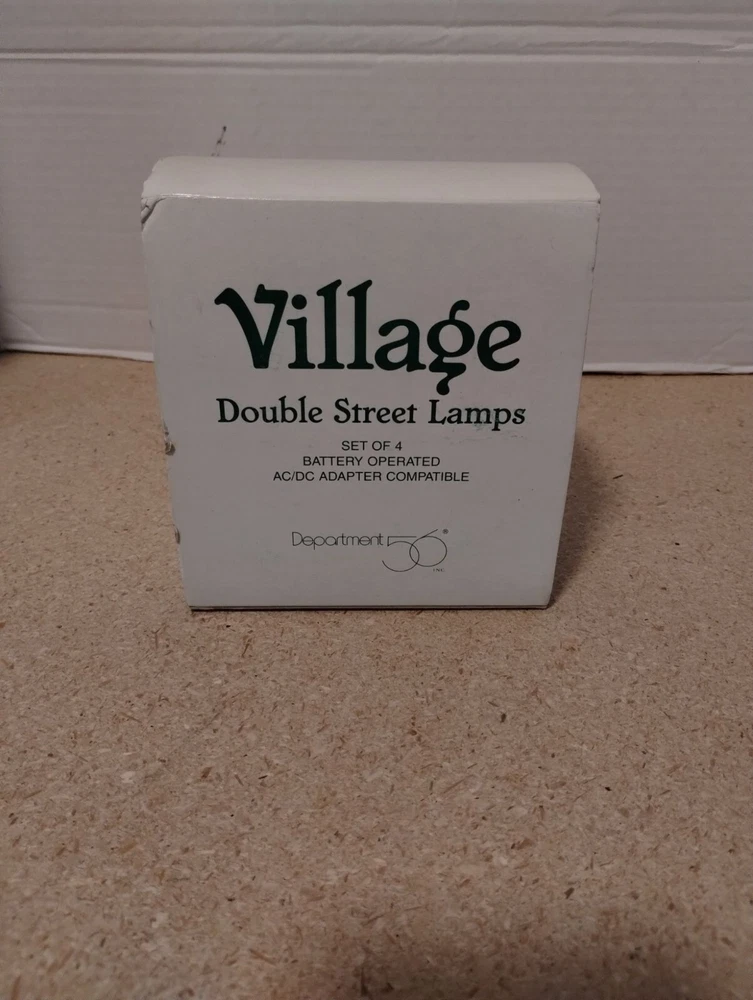 Enhance your holiday village display with these elegant double street lamps. Battery-operated and AC/DC compatible, they add a realistic touch to your decor. • Includes 4 double street lamps • Requires batteries or AC/DC adapter (not included) • Decorative and functional design • Compatible with Department 56 village collections Box shows minor wear, contents appear unused. Box dimensions: 5 x 5 x 3 inches.