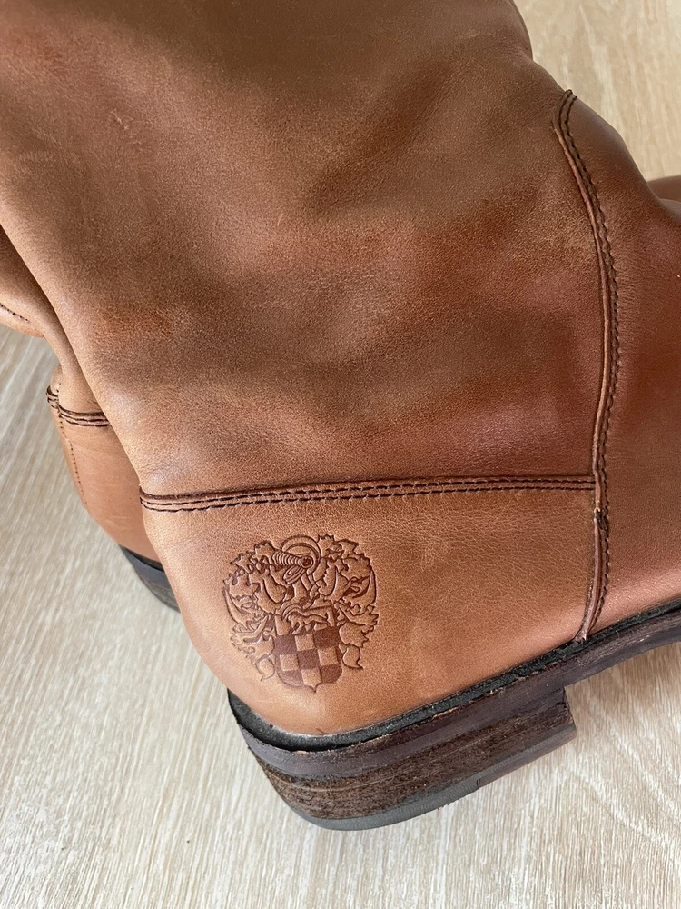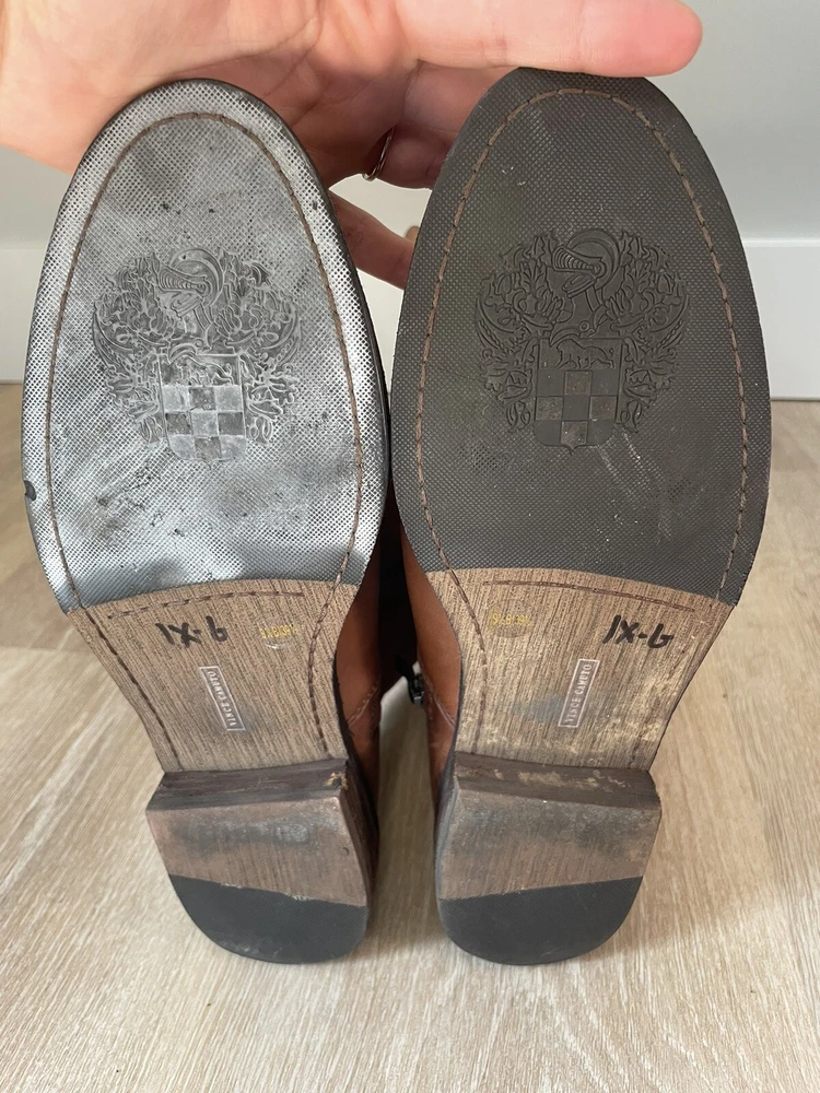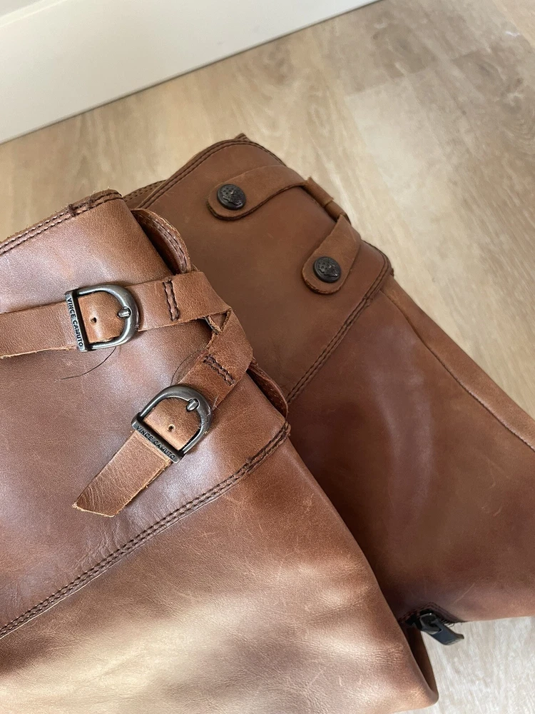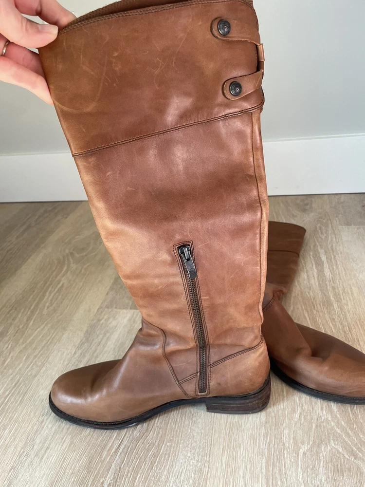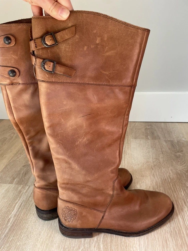 Vince Camuto Keaton Brown Leather Riding boots. Size 9.5. Great equestrian style riding boots for cooler weather. Good condition with some natural wear marks to the leather that you’d expect from preowned. One spot in photos that appears to be a black line mark. One nick on the outer heel in photos. One bottom (see pictures) has a whitish cast? I’m not sure what it is but it’s not seen when wearing. Please see the pictures so there are no surprises. Zippers on the inner ankles to make them easier to side your foot in. Overall a nice pair of boots, some mentioned imperfections, but great quality.