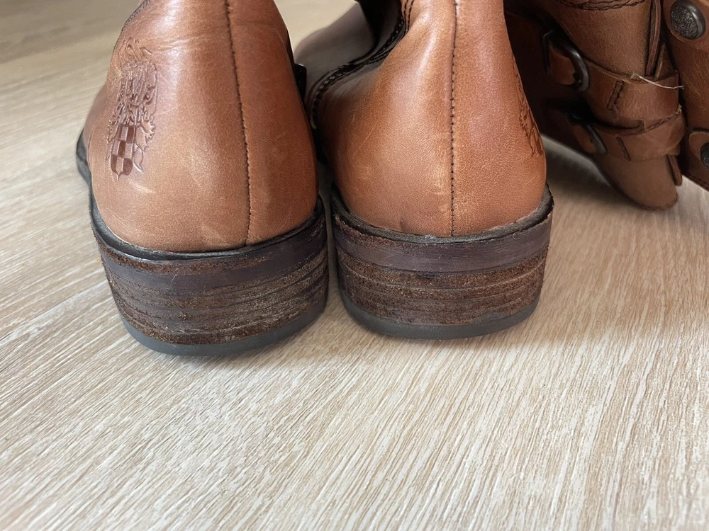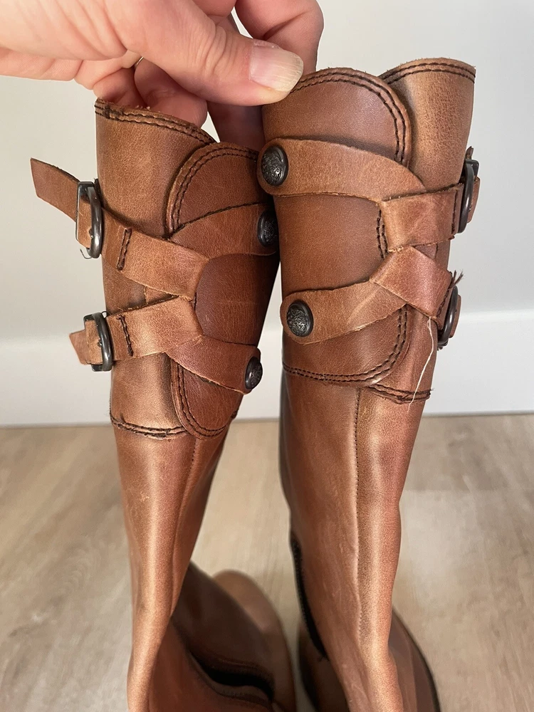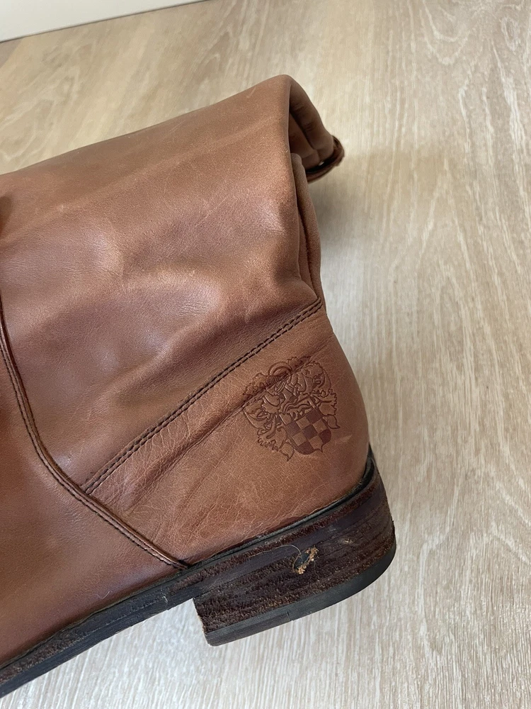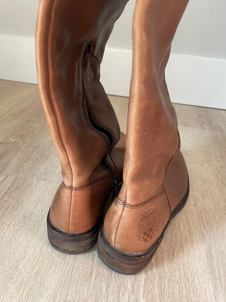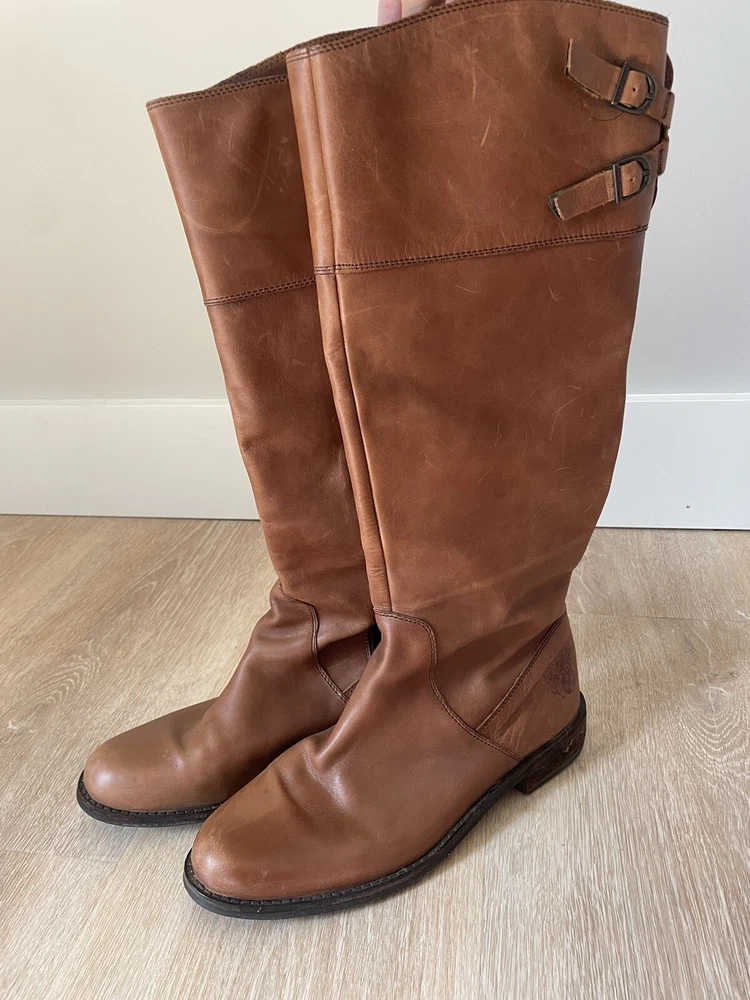 Vince Camuto Keaton Brown Leather Riding boots. Size 9.5. Great equestrian style riding boots for cooler weather. Good condition with some natural wear marks to the leather that you’d expect from preowned. One spot in photos that appears to be a black line mark. One nick on the outer heel in photos. One bottom (see pictures) has a whitish cast? I’m not sure what it is but it’s not seen when wearing. Please see the pictures so there are no surprises. Zippers on the inner ankles to make them easier to side your foot in. Overall a nice pair of boots, some mentioned imperfections, but great quality.