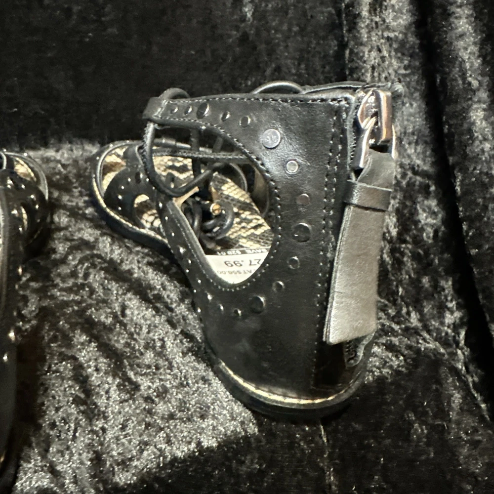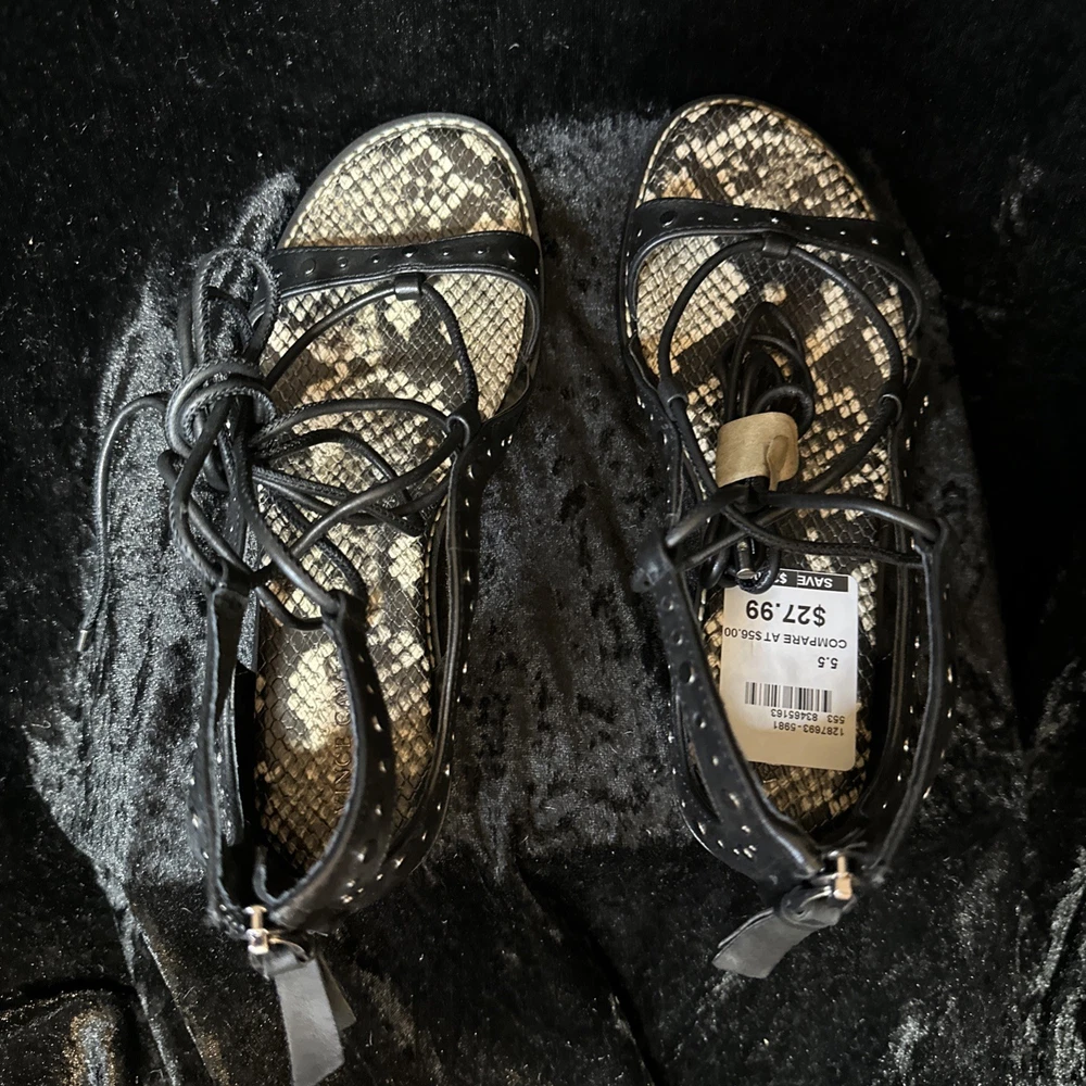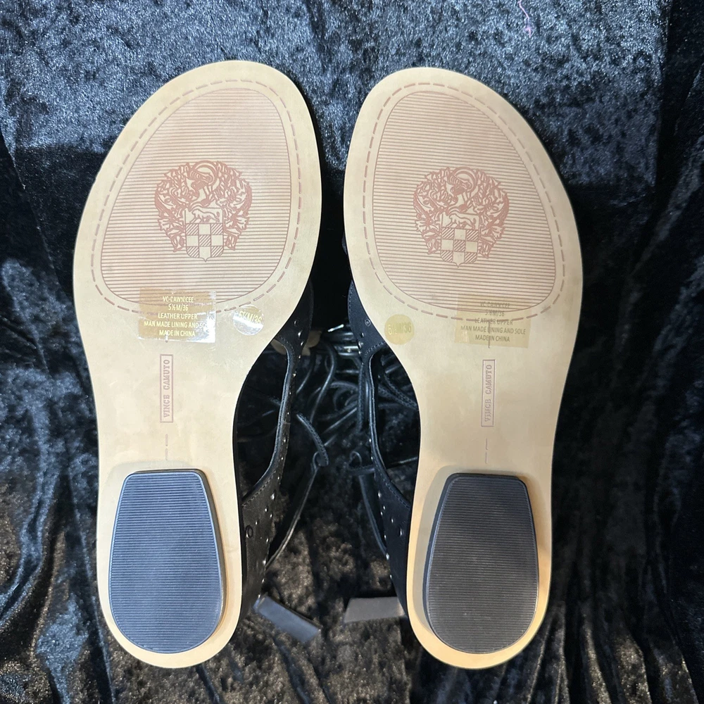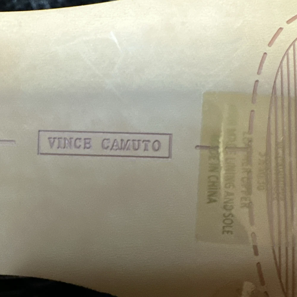 Elevate your shoe game with these black flats from Vince Camuto. The open toe design and tie closure provide a sleek and comfortable fit, perfect for any occasion. The leather lining and rubber outsole ensure durability and long-lasting wear. Studded accents and a zipper add a touch of edginess to these classic flats, making them perfect for both casual and formal events. These lightweight and comfortable flats are perfect for any season, with a solid pattern that matches any outfit. The medium width and leather upper material make these shoes a must-have for any stylish woman's wardrobe. Don't miss out on the opportunity to add these versatile Vince Camuto flats to your shoe collection.