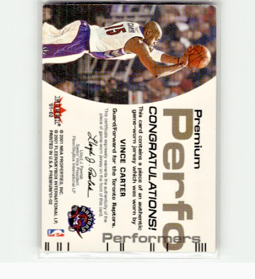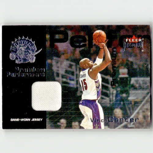 This rare and hard-to-find Vince Carter 2001-02 Fleer Premium Performers Jersey Card is a must-have for any serious collector of sports memorabilia. Featuring a piece of authentic jersey from the Toronto Raptors' star player, this single-insert card is an original and genuine item from the Fleer/Skybox manufacturer. With its "Piece of Authentic" and "Memorabilia" card attributes, this card is a valuable addition to any collection. The card is from the NBA league and the 2001-02 season, with the player's name, team, and country of manufacture all included in the card's attributes. Don't miss out on this opportunity to own a piece of sports history.