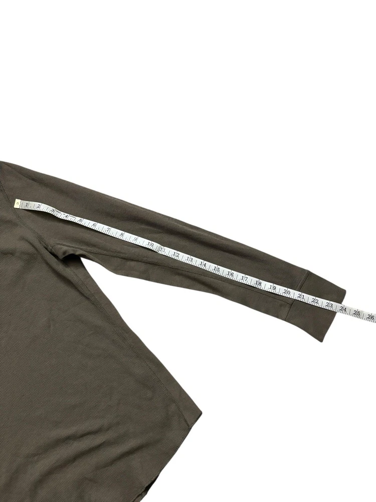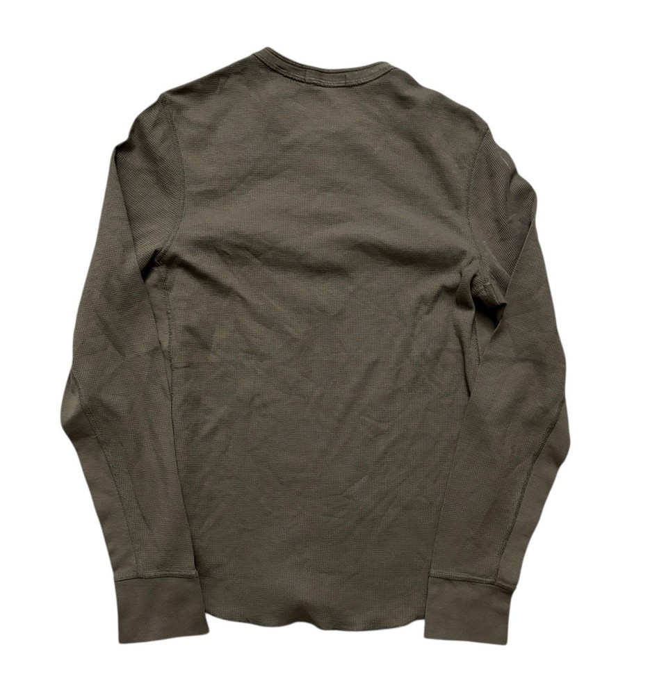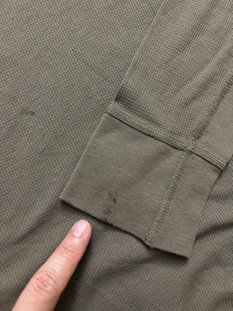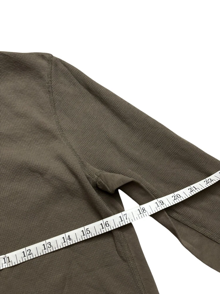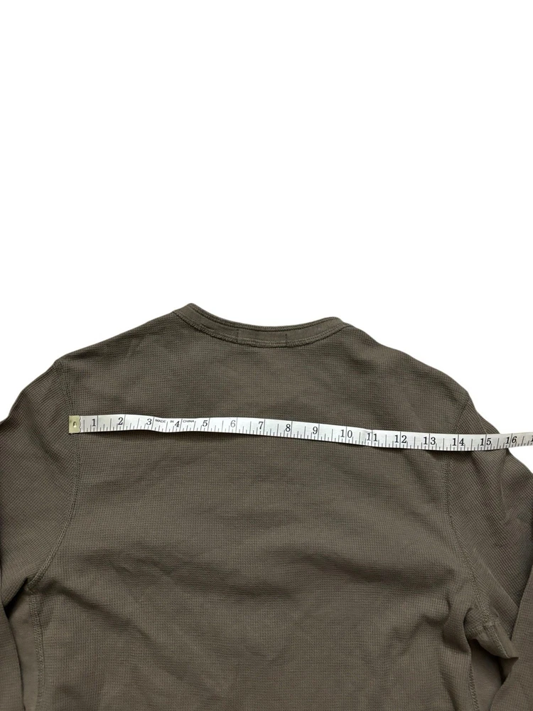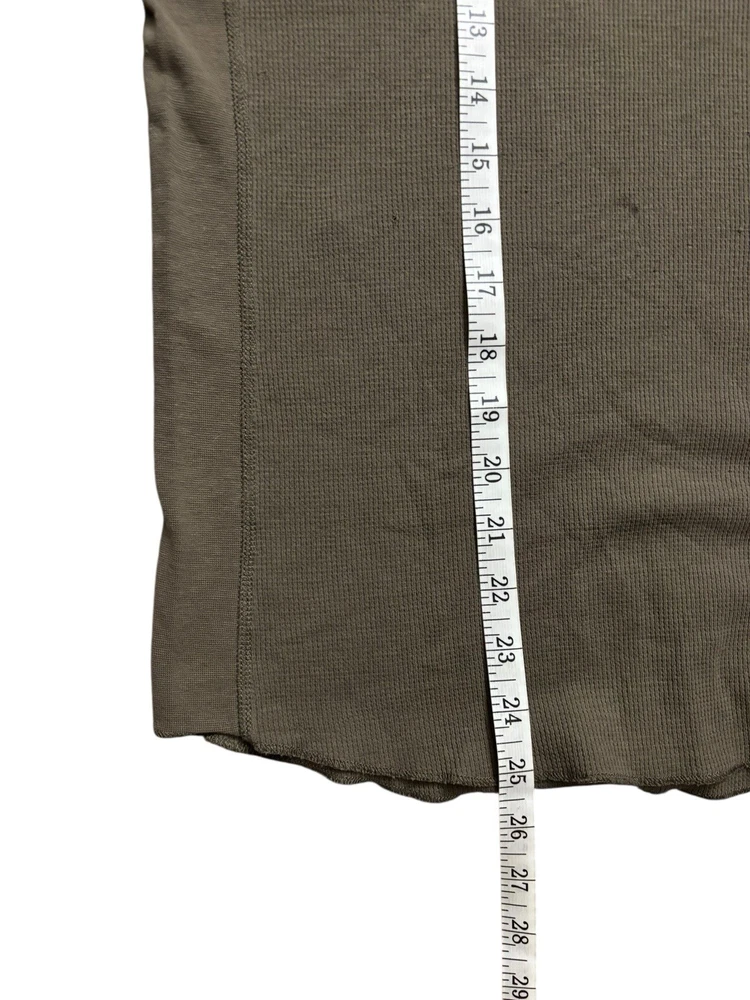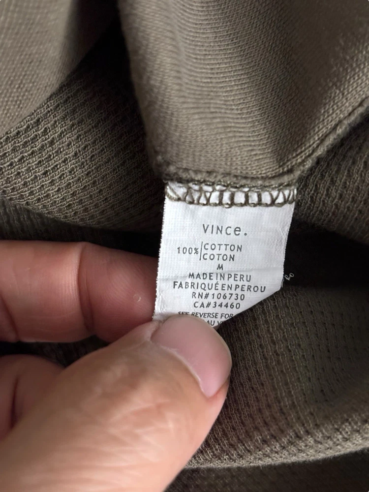 Has few stains (pointed out). The Vince Men's Medium Dark Olive Wafer Knit Henley Shirt is a stylish and versatile piece perfect for any season. Made from comfortable cotton knit fabric, this slim-fit shirt features a henley neckline and long sleeves, making it suitable for both casual and dressier occasions. The solid green color adds a touch of sophistication, while the designer brand and preppy theme ensure a high-quality and fashionable look. This shirt is machine washable for easy care and is ideal for men looking for a classic and well-designed addition to their wardrobe.