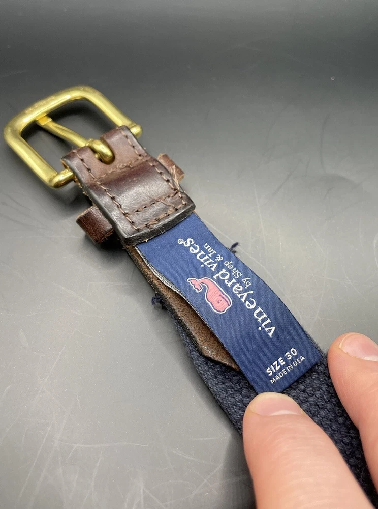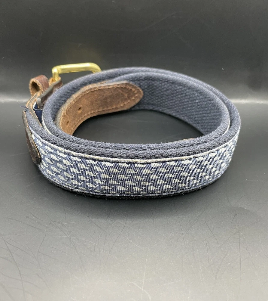 Elevate your style with this Vineyard Vines belt featuring a playful whale pattern. Made in the USA with high-quality materials including polyester, brass, leather, and cotton, this belt is perfect for any occasion. The multicolor design and classic style make it a great addition to any wardrobe. This men's belt has a 30-inch size and features a buckle closure with a braided/woven design. The logo accents and animal print pattern add a touch of fun to this classic piece. Whether you're hitting the golf course or adding some color to your everyday outfit, this Vineyard Vines belt is the perfect choice. Some wear overall good condition.
