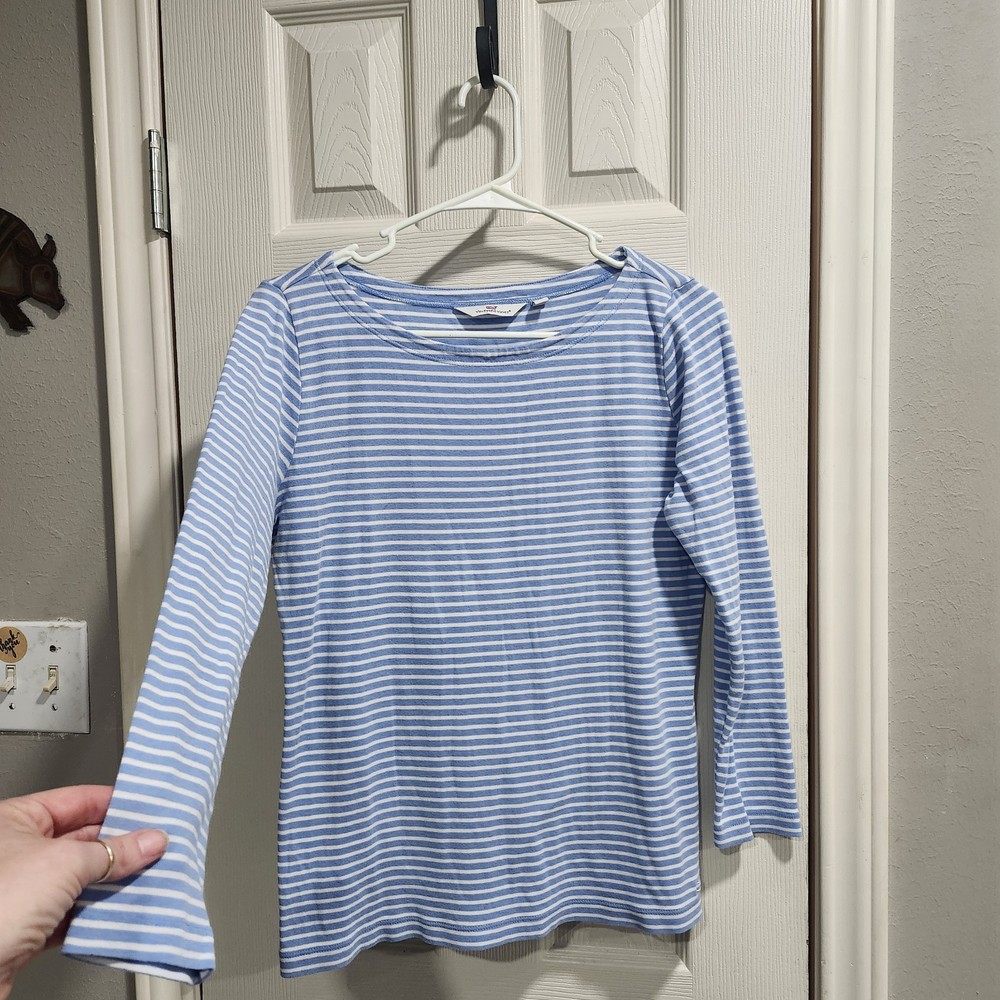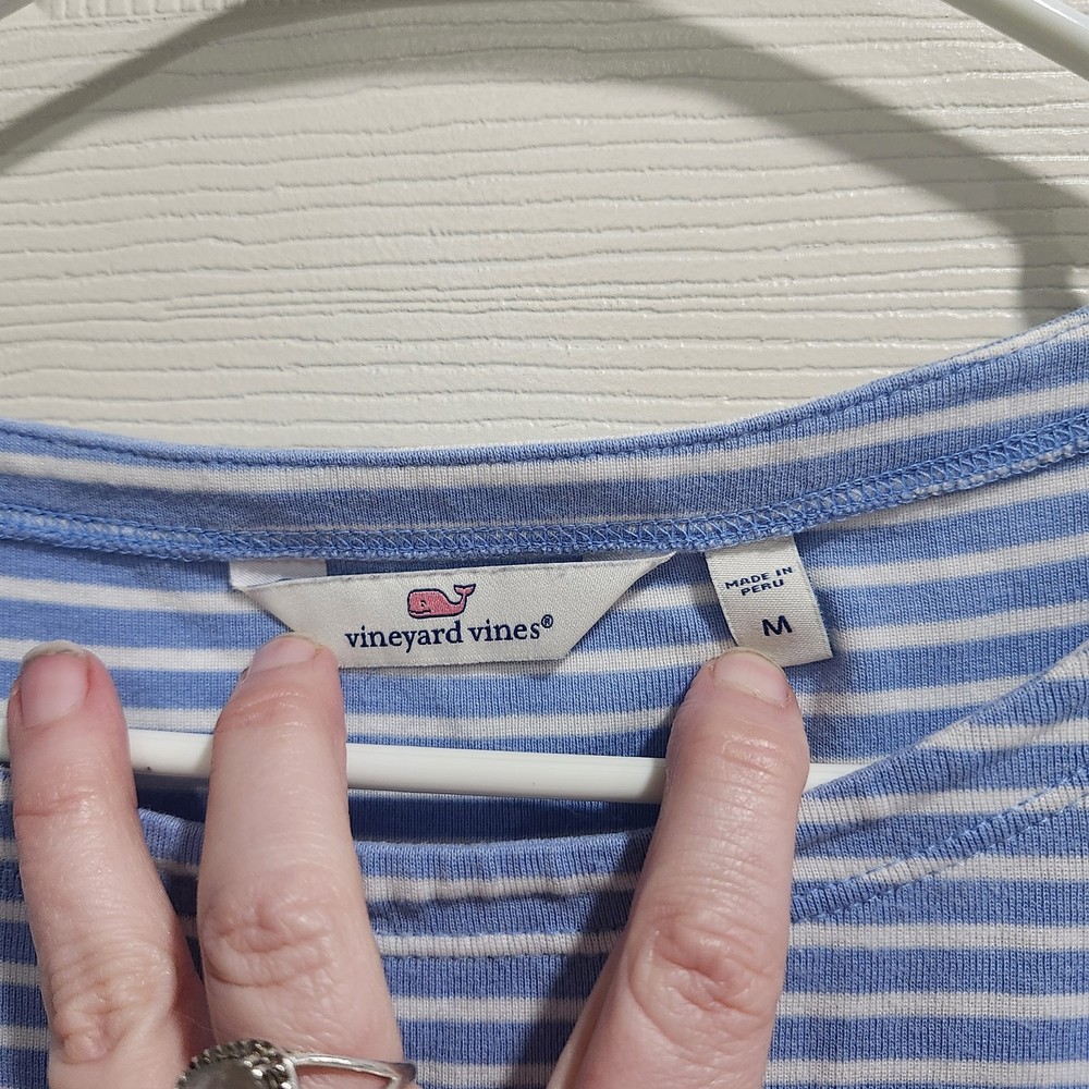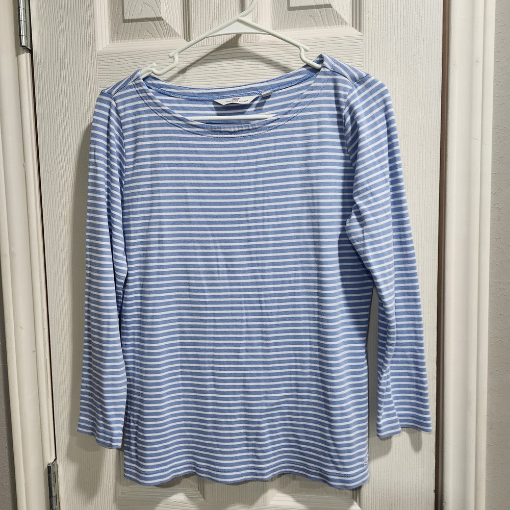 Vineyard Vines women’s long sleeve striped top in a soft blue and white colorway. Features a classic boat neckline, lightweight knit fabric, and a relaxed everyday fit. Finished with the signature Vineyard Vines whale logo embroidered near the hem. A timeless coastal-style piece that’s perfect for layering or casual wear year-round. Brand: Vineyard Vines Size: Women’s Medium Color: Blue & White Stripe Sleeve Length: Long Sleeve Neckline: Boat Neck Fabric: Soft knit (see tag photos) Made in Peru Condition: Pre-owned, gently worn. No holes, stains, or major flaws noted. Approximate Measurements (laid flat): • Length (shoulder to hem): 23 inches • Armpit to armpit (chest): 18.5 inches • Sleeve length (shoulder to cuff): 20 inches • Shoulder to shoulder: 14 inches Please compare measurements to your favorite top for best fit.