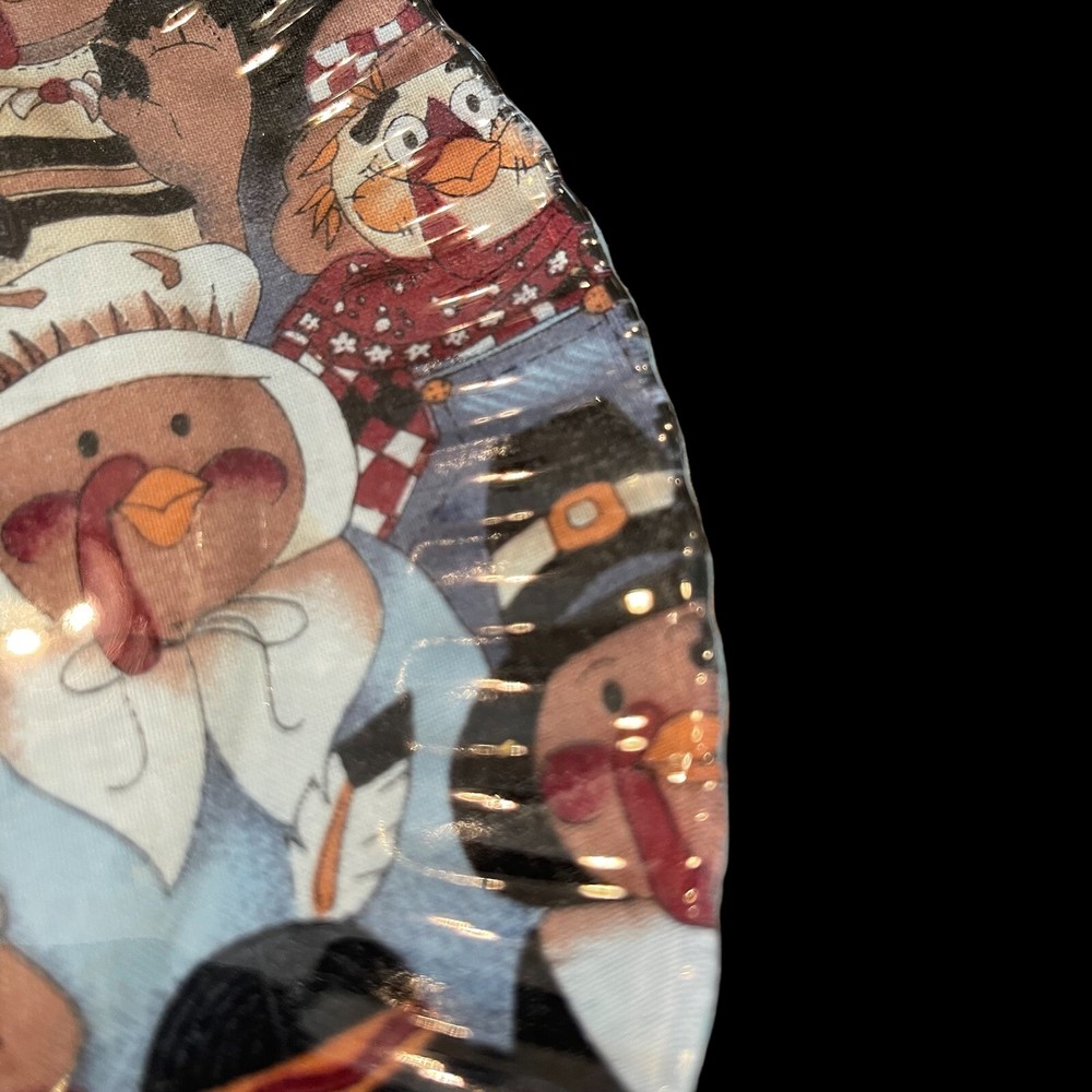 Vintage Clear Cased Glass Serving Plate Pilgrim Turkey Thanksgiving Pattern 10" 10" diameter. Clear glass with turkey pattern applied at back with a blue glitter backing. Scalloped rim.
