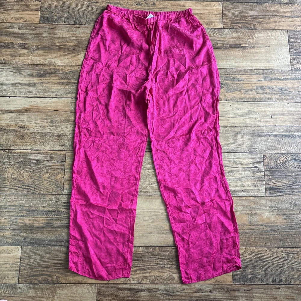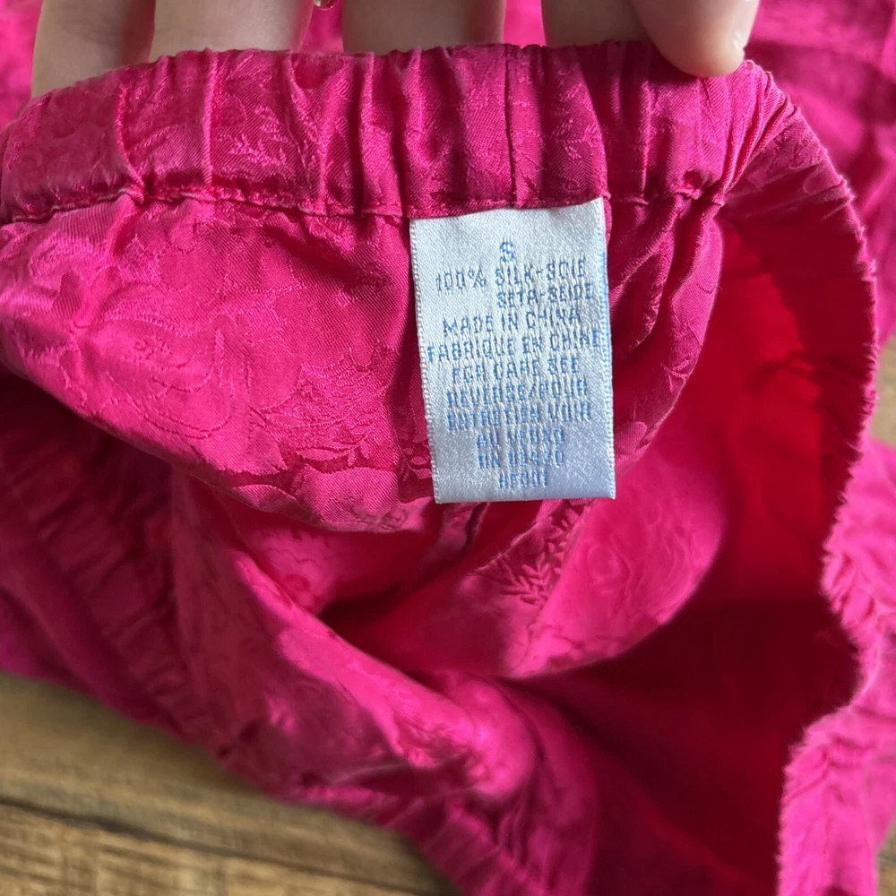 The product is a pair of vintage silk pajama pants for women in a size small. They feature a pink floral print design and are made from 100% silk material. The brand of the pajama pants is not specified. These stylish and comfortable pants are perfect for lounging at home or sleeping in luxury. The silk material adds a touch of elegance and the floral print adds a feminine touch to this classic piece of sleepwear.