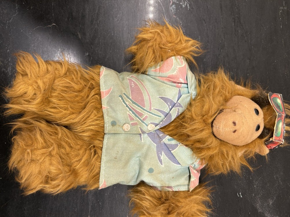 The product is a vintage 1980s Coleco hand puppet of the character Alf from the TV show "ALF." This plush puppet is 11 inches tall and features Alf wearing a Hawaiian shirt. The puppet is recommended for ages 6 and up, suitable for both boys and girls. It is a collector's item from the franchise "Alien" and is part of the ALF character family.