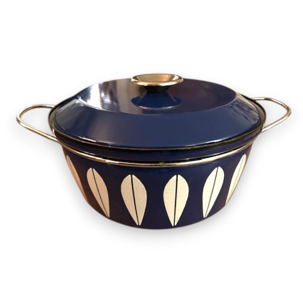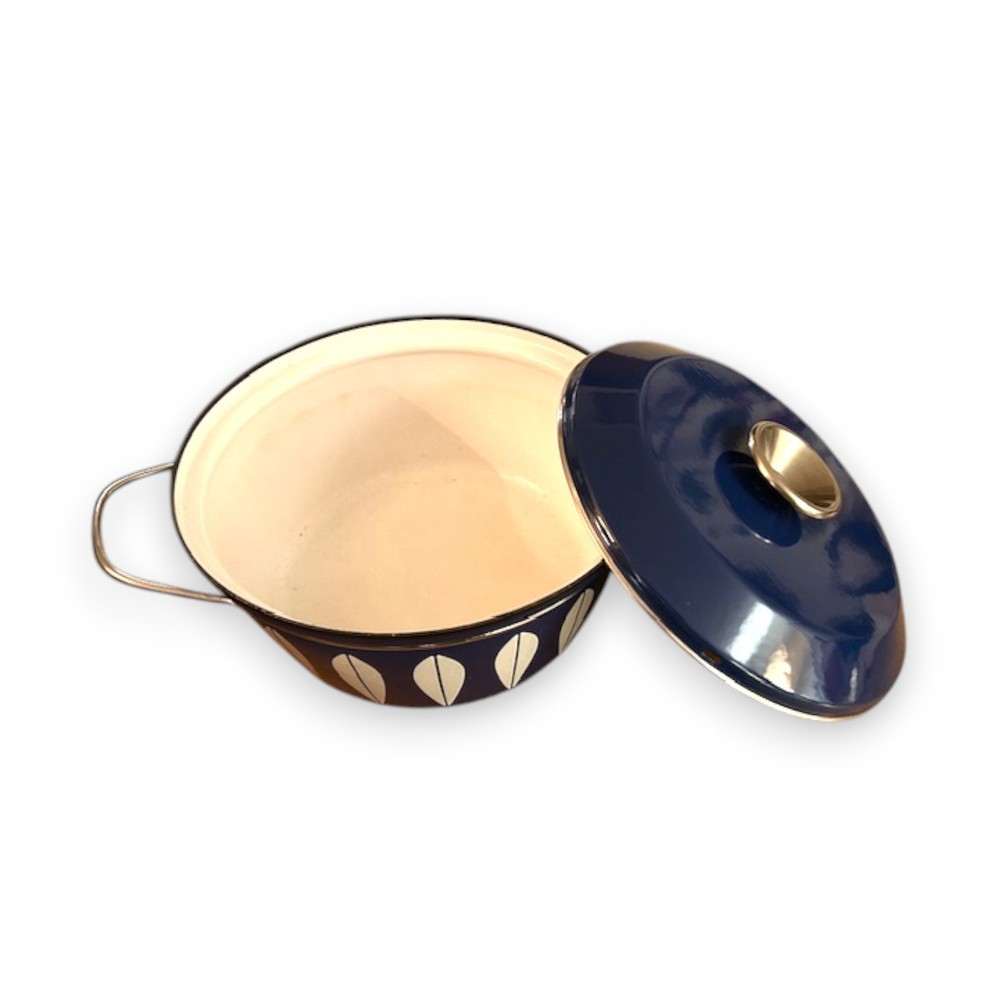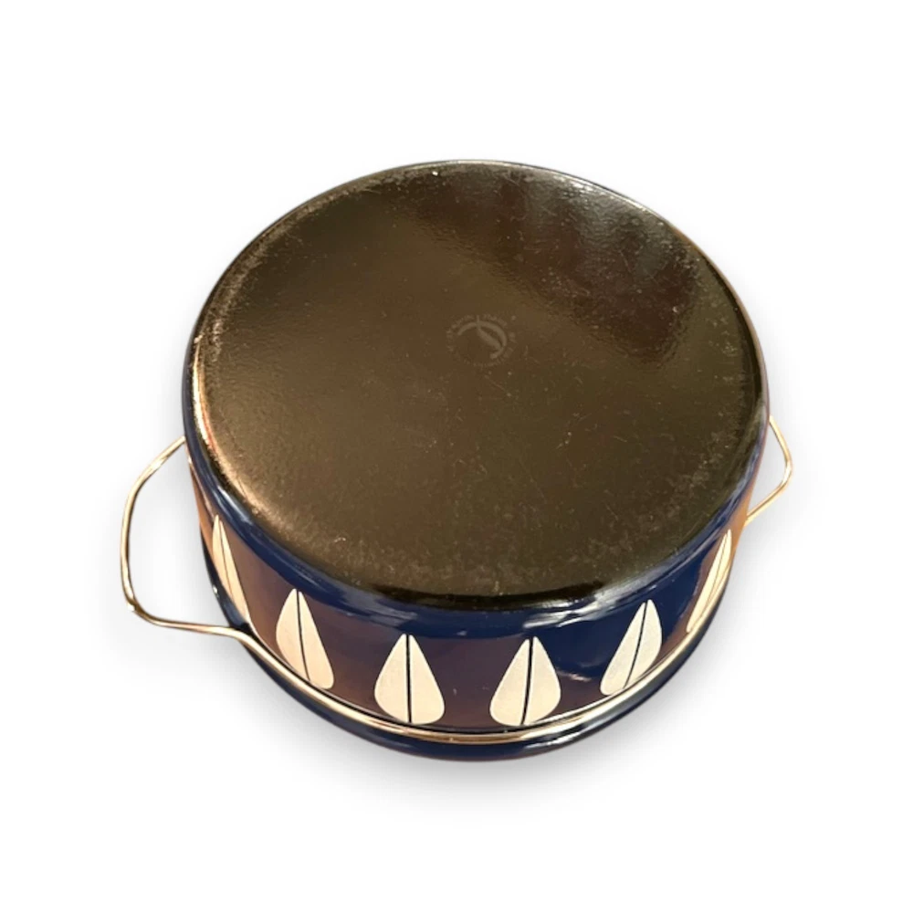 This vintage 11" Cathrineholm White Lotus on Blue Enamelware stockpot is a unique and collectible piece of cookware made in Norway. The round stockpot features a blue color with a white lotus design, adding a touch of retro charm to any kitchen. With a capacity of 8 quarts and compatibility with both electric and gas stoves, this two-piece set includes a lid and is perfect for any cooking enthusiast looking for a vintage addition to their collection. Exceptional condition.