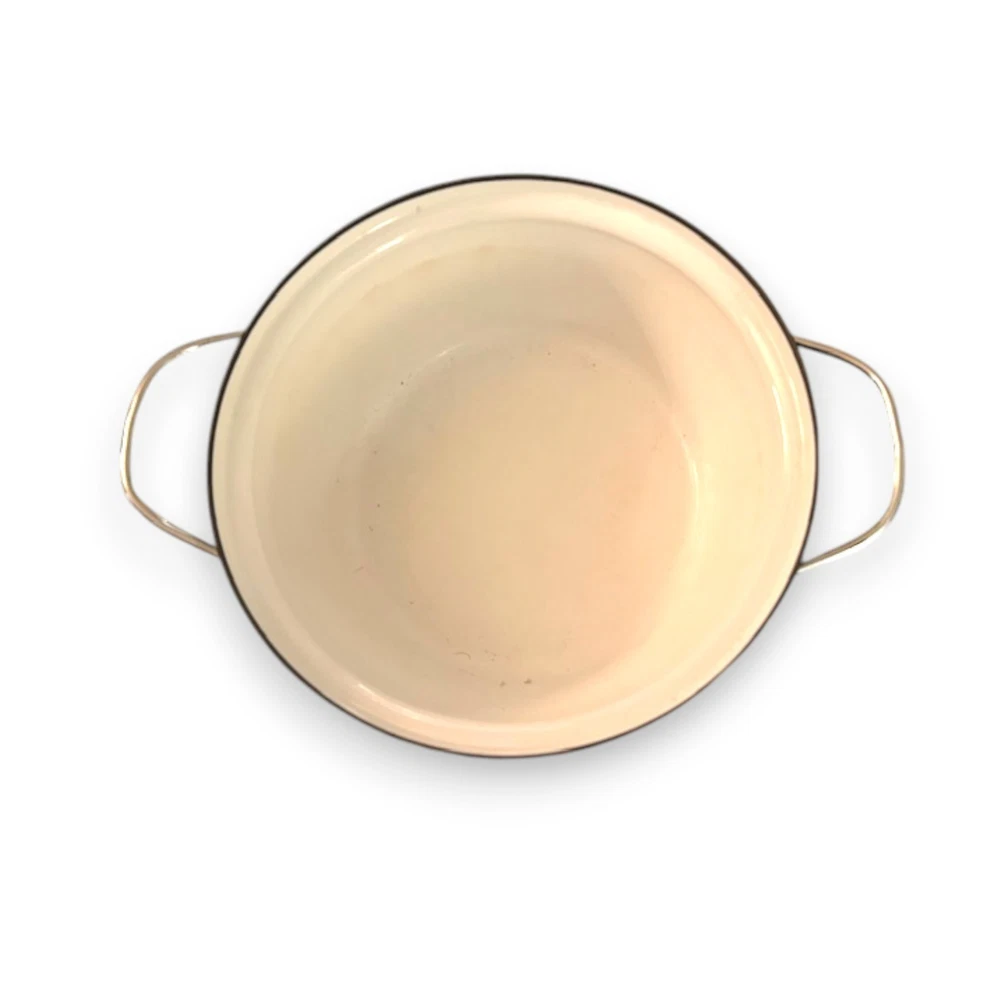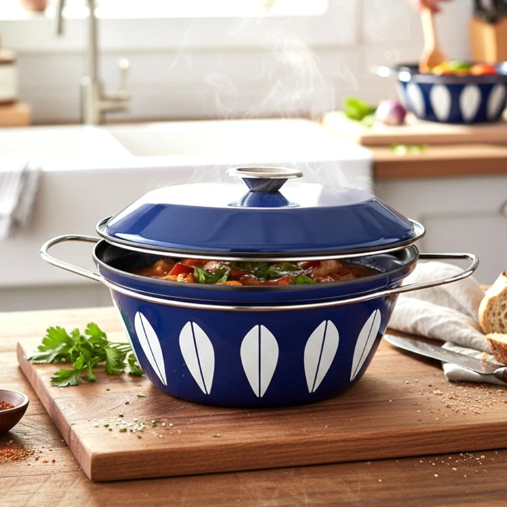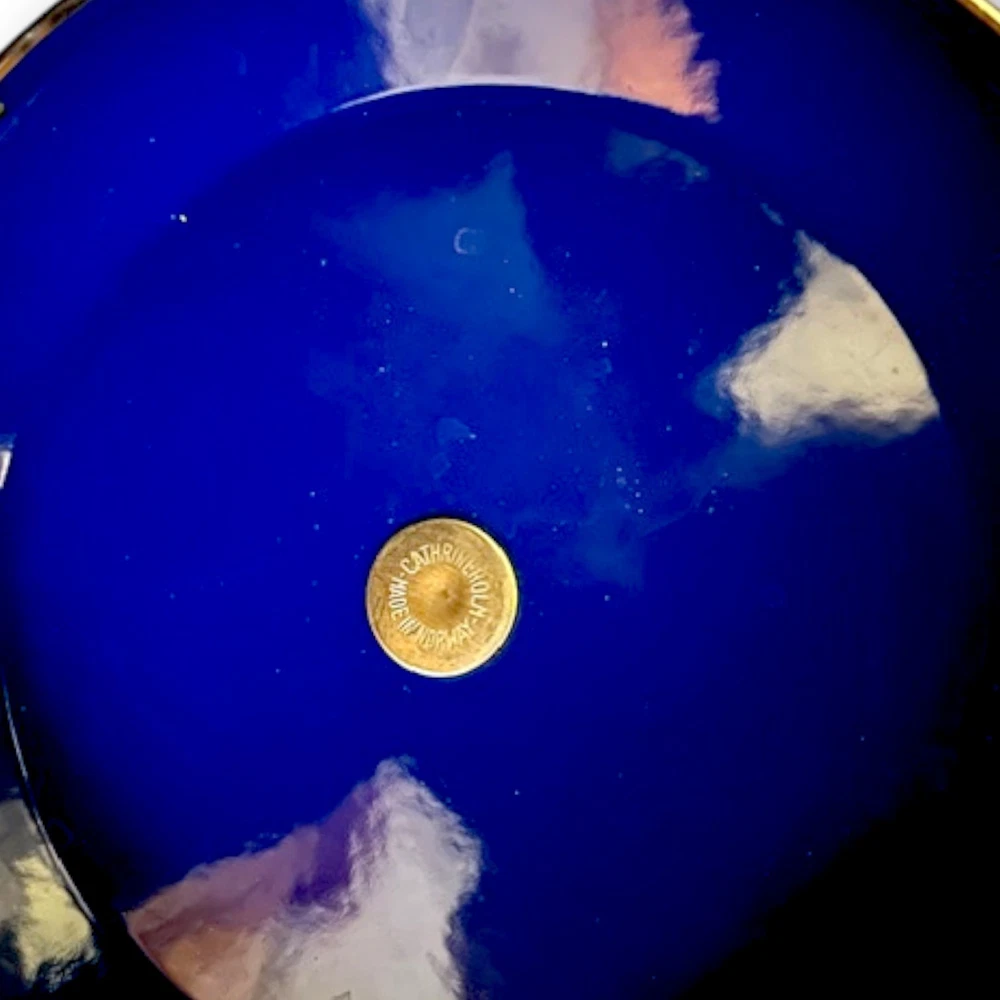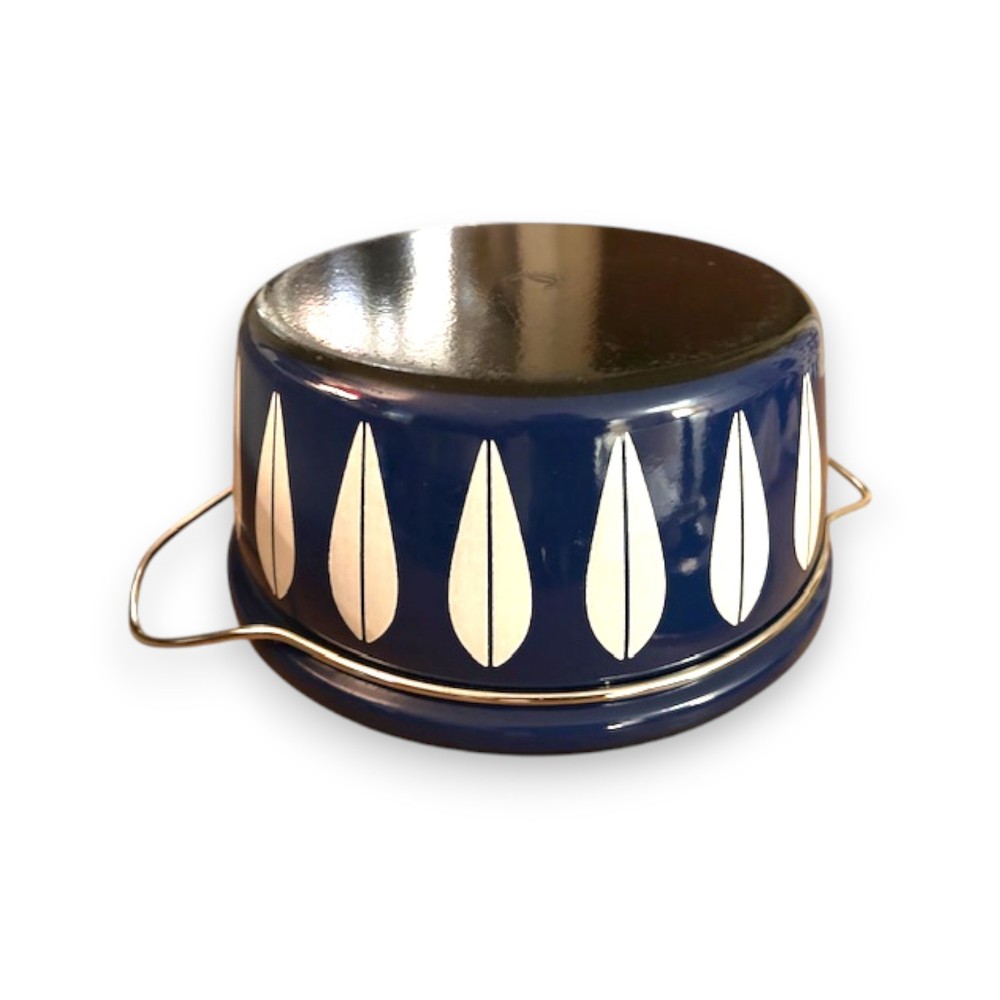 This vintage 11" Cathrineholm White Lotus on Blue Enamelware stockpot is a unique and collectible piece of cookware made in Norway. The round stockpot features a blue color with a white lotus design, adding a touch of retro charm to any kitchen. With a capacity of 8 quarts and compatibility with both electric and gas stoves, this two-piece set includes a lid and is perfect for any cooking enthusiast looking for a vintage addition to their collection. Exceptional condition.
