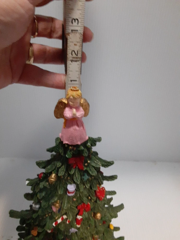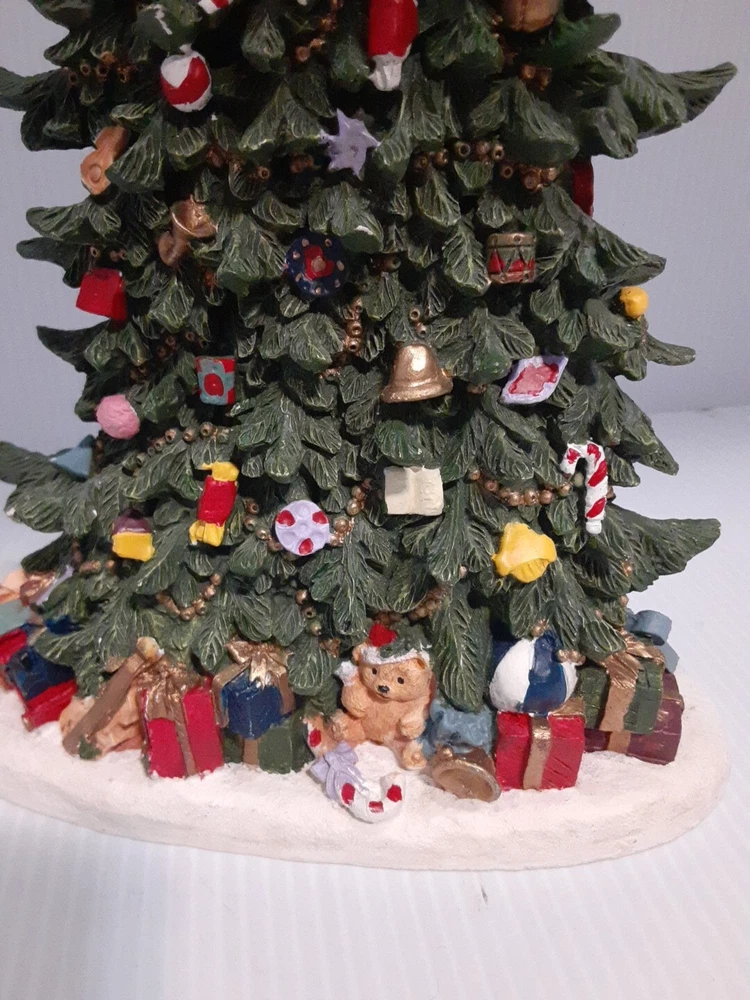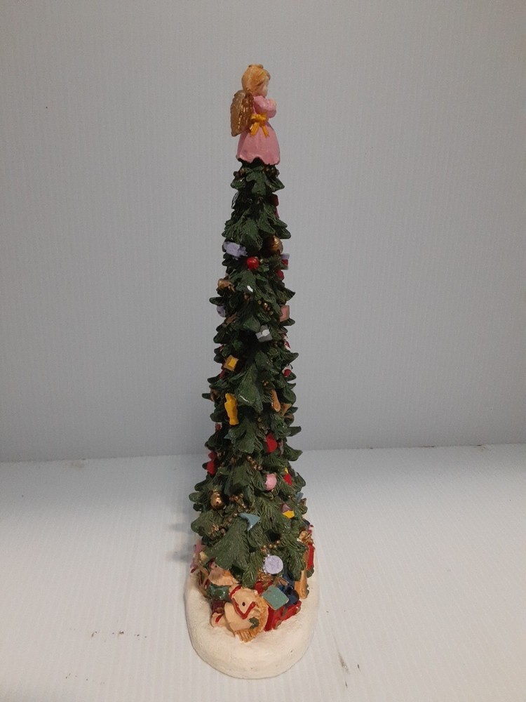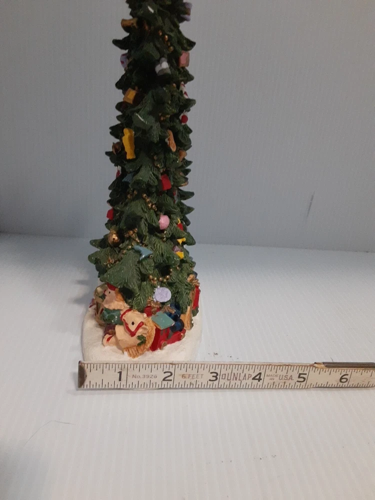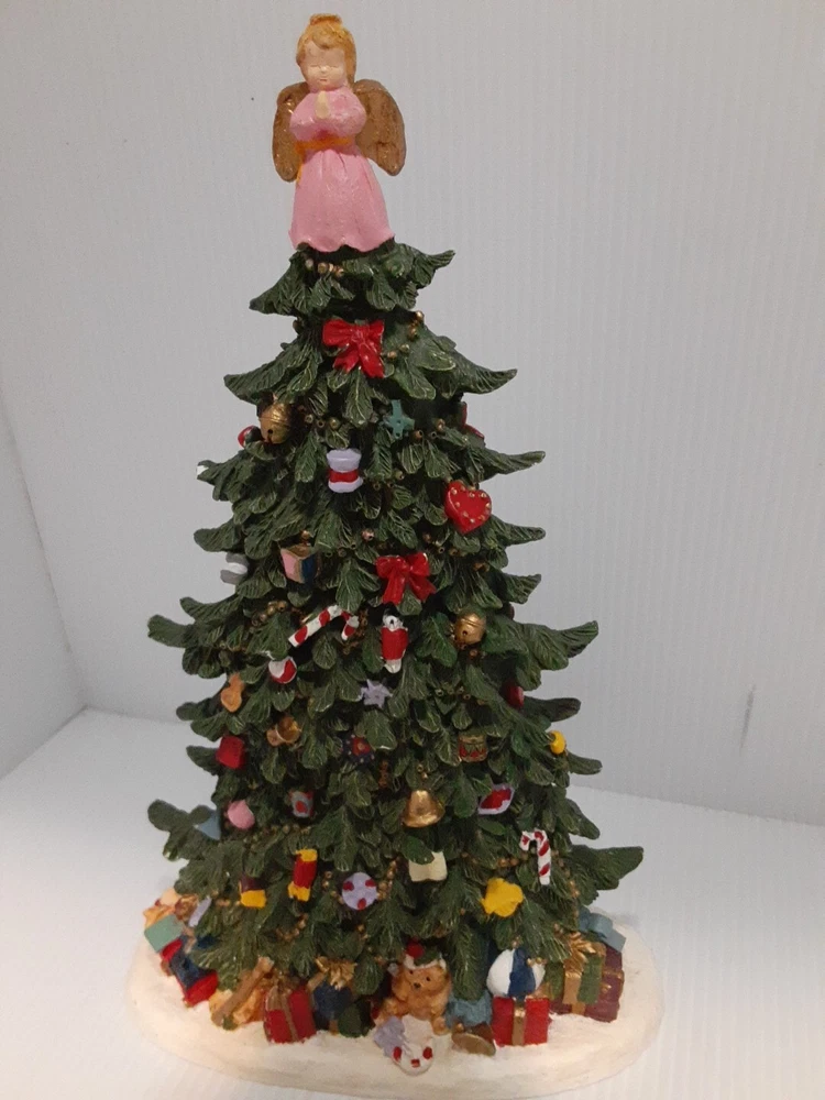 This vintage resin Christmas tree figurine stands at 11.5 inches tall and features a thin design. It is decorated with festive details, making it perfect for holiday decor. The tree is painted and crafted from resin in China, adding to its unique and collectible appeal. Ideal for adding a touch of nostalgia and Christmas spirit to any home, this tree figurine is a charming addition to any holiday decor collection.