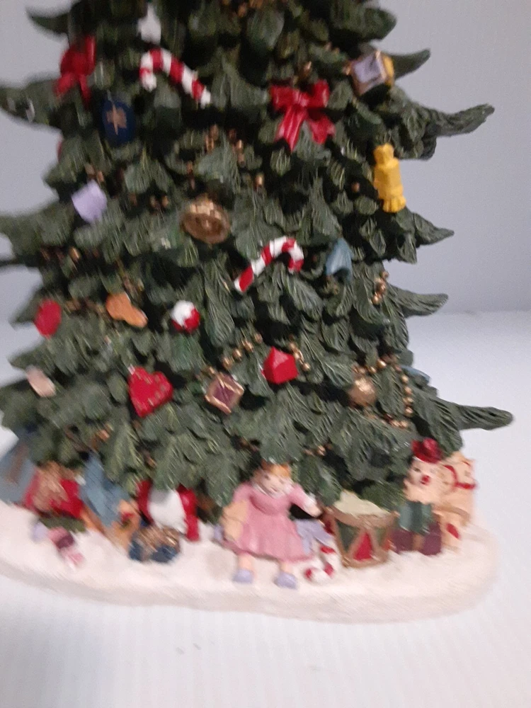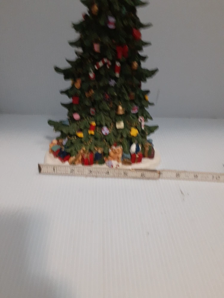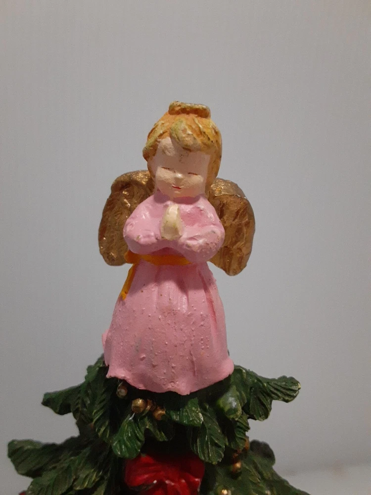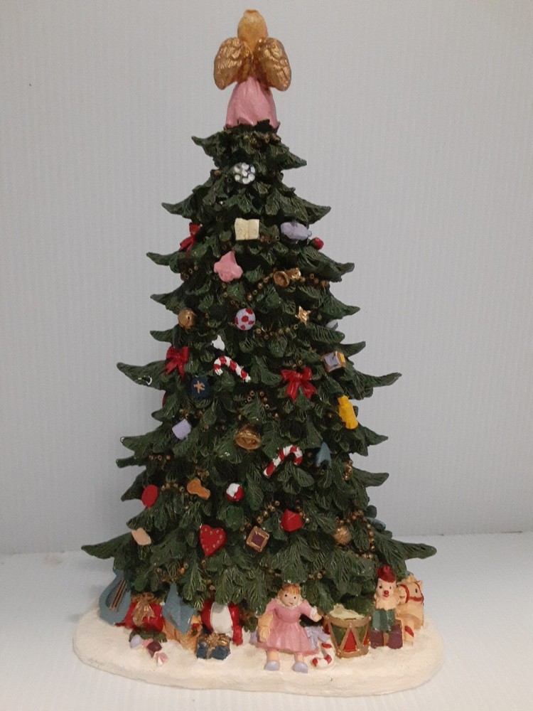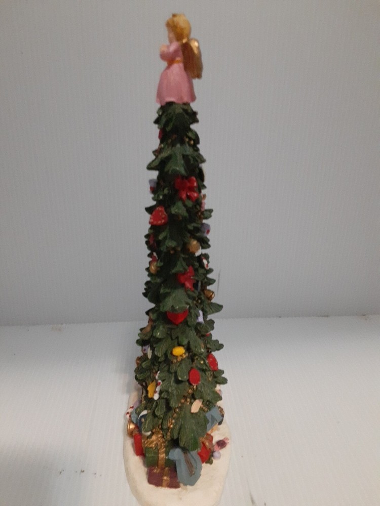 This vintage resin Christmas tree figurine stands at 11.5 inches tall and features a thin design. It is decorated with festive details, making it perfect for holiday decor. The tree is painted and crafted from resin in China, adding to its unique and collectible appeal. Ideal for adding a touch of nostalgia and Christmas spirit to any home, this tree figurine is a charming addition to any holiday decor collection.