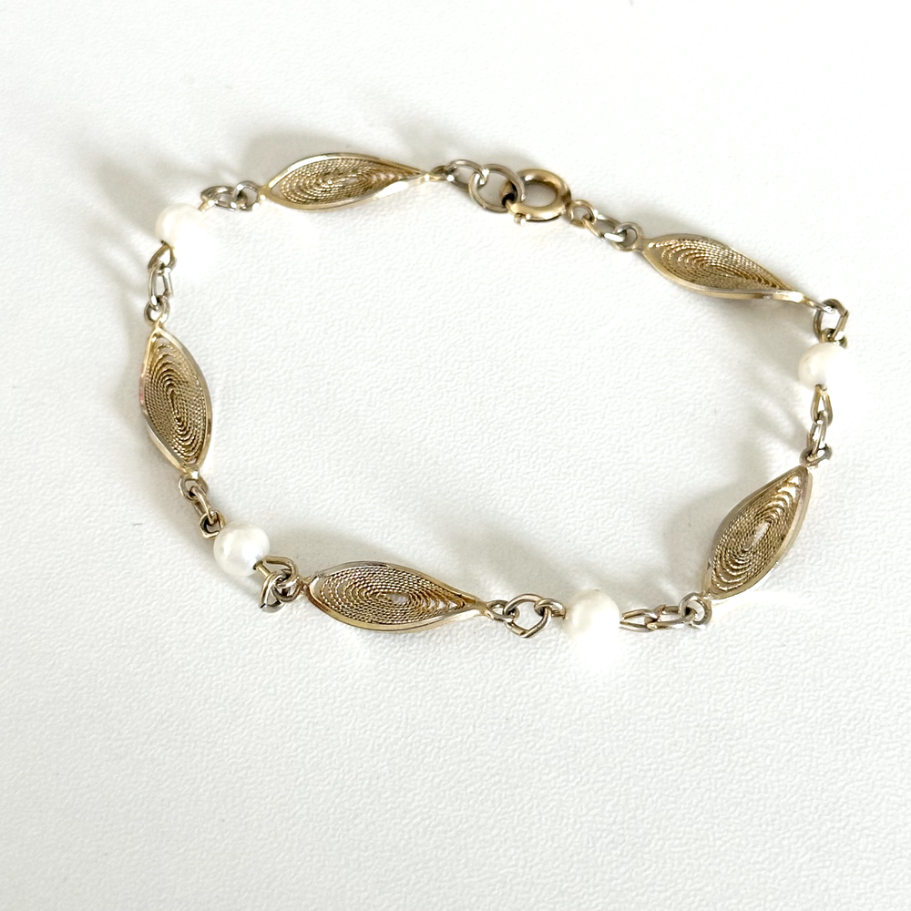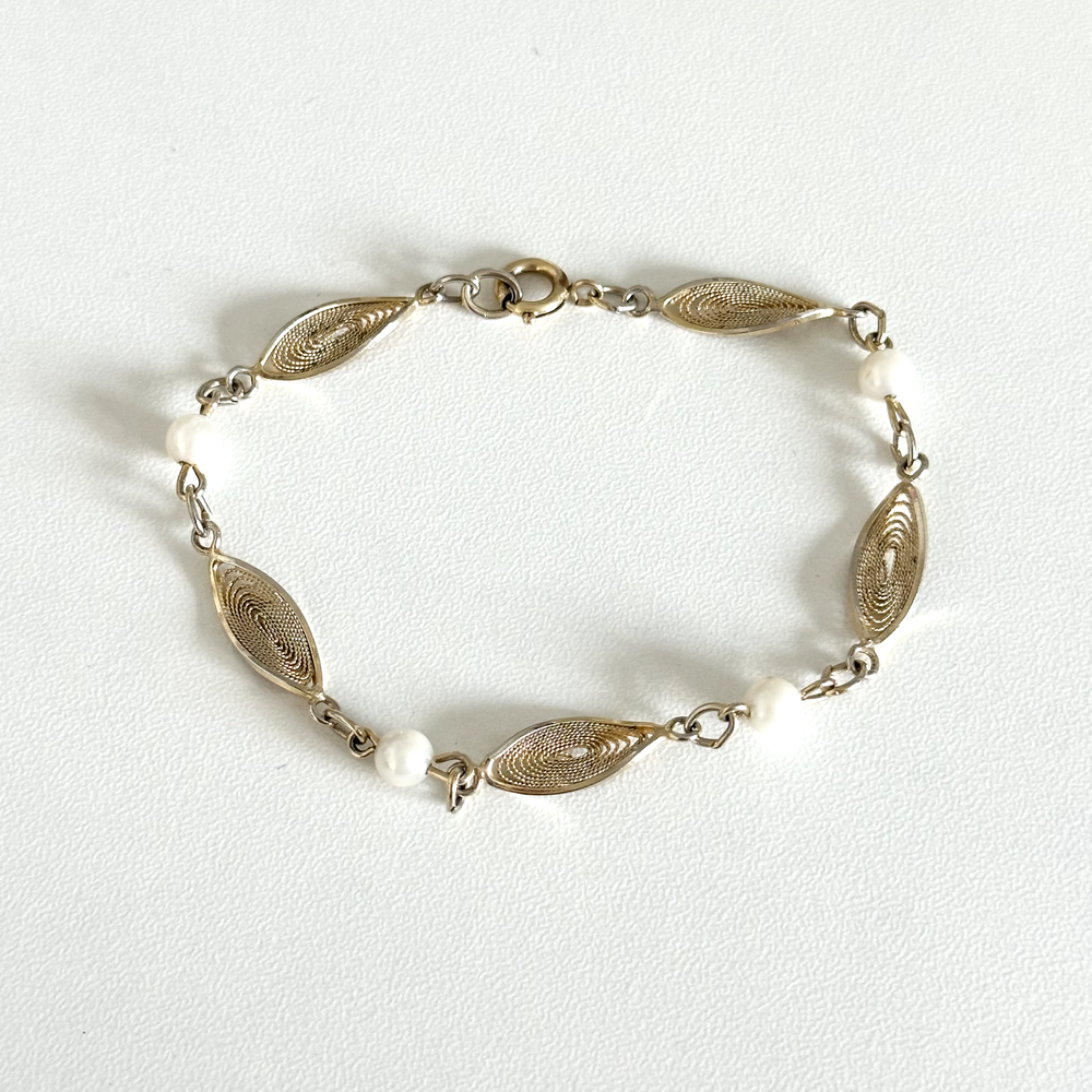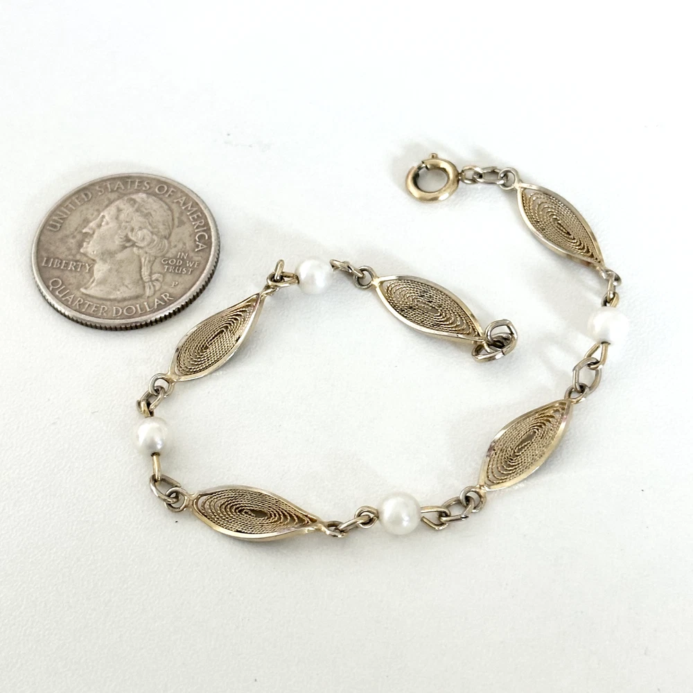 Lovely Vintage 12K Yellow Gold Filled Pearl Filigree Detail Chain Link Bracelet 7" Length: 7" Width: 6mm Pearl size: 5mm Signed: 1/20 12K GF Weight: 4 grams Very good vintage condition. - Fast shipping, I ship the same or next business day! I also combine shipping. - Thank you so much for shopping with me and please check out my other jewelry listings, I post new items daily!