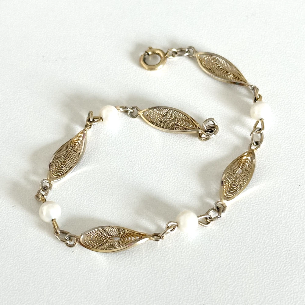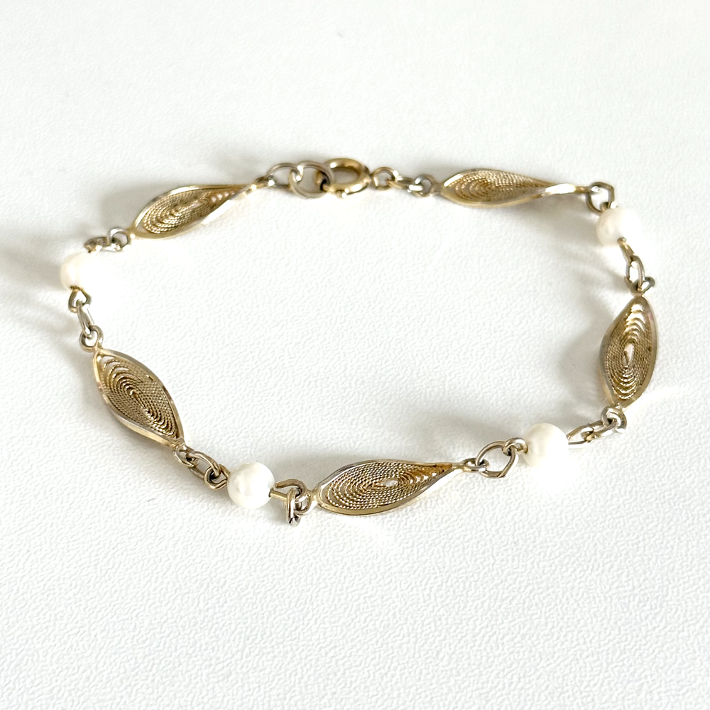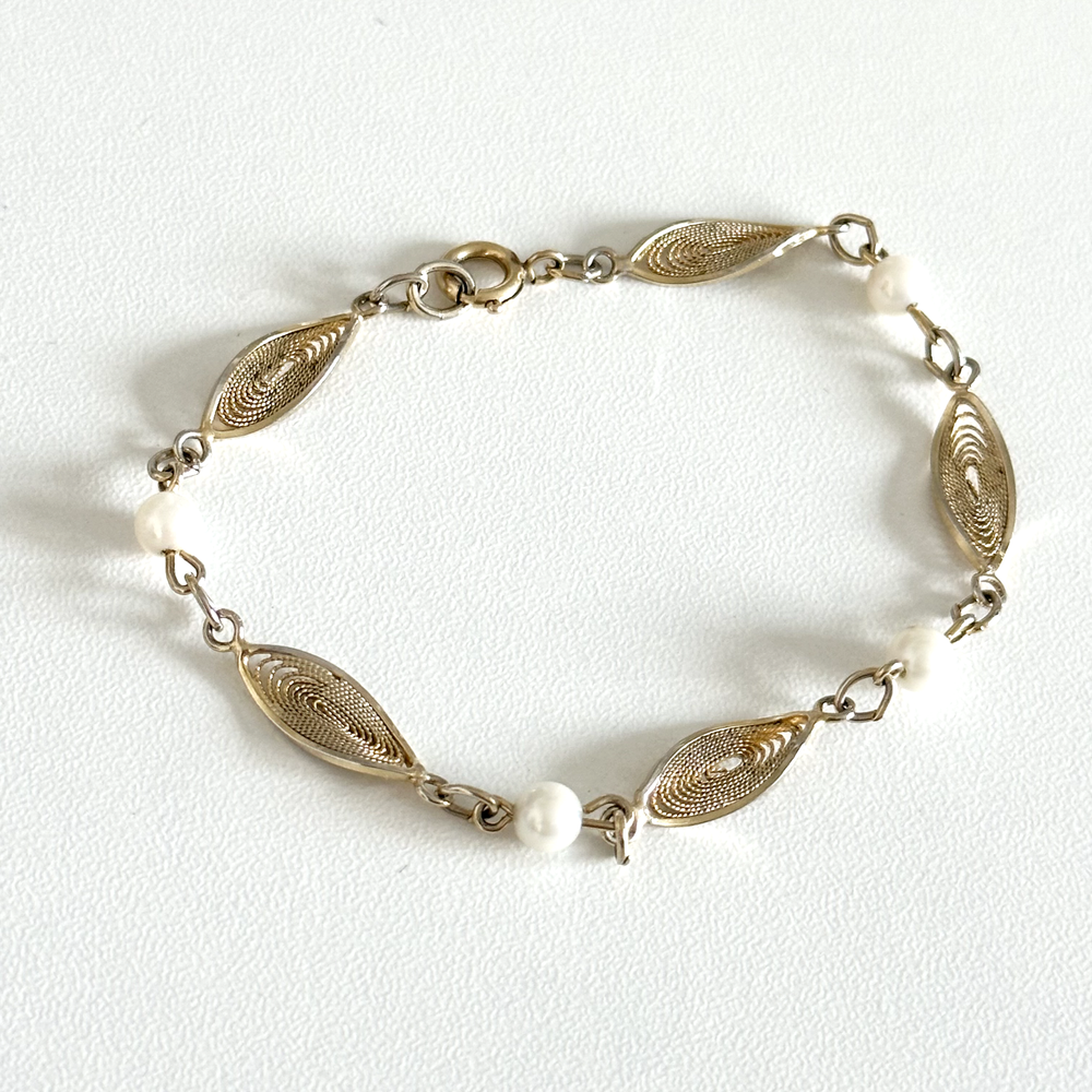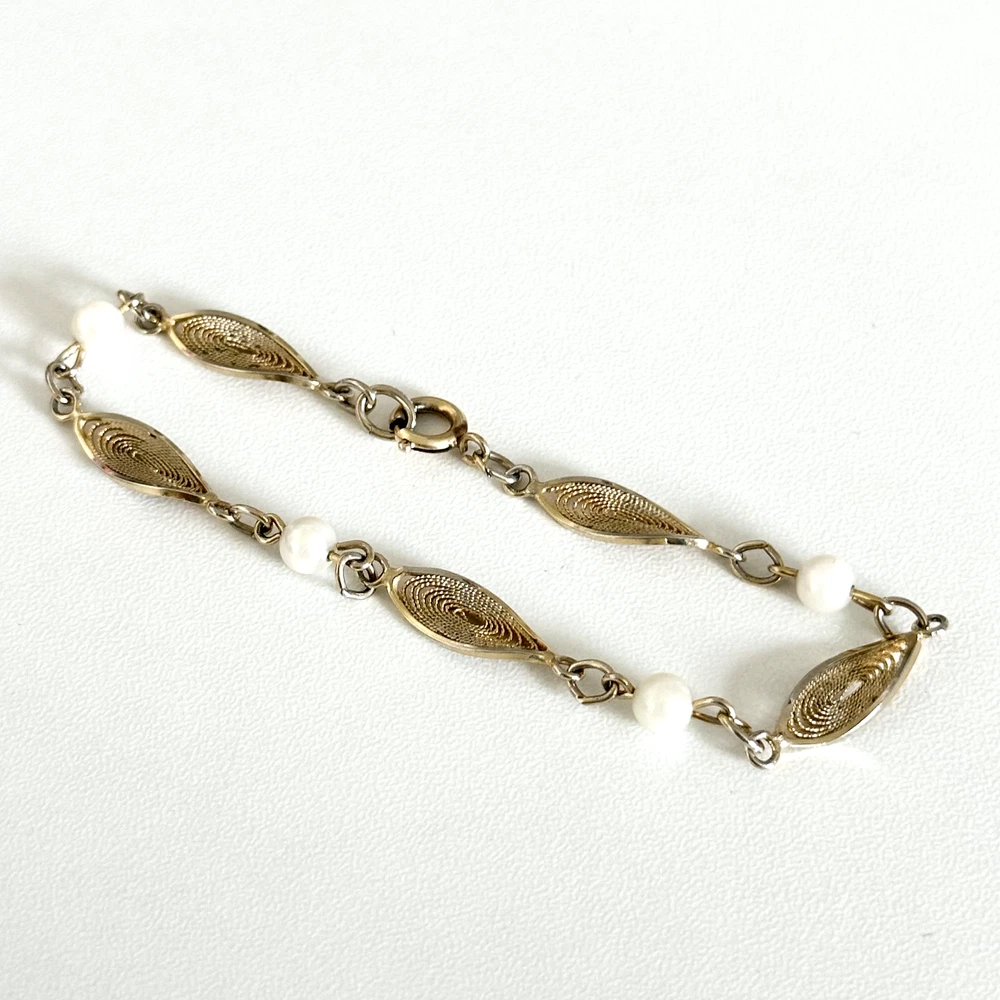 Lovely Vintage 12K Yellow Gold Filled Pearl Filigree Detail Chain Link Bracelet 7" Length: 7" Width: 6mm Pearl size: 5mm Signed: 1/20 12K GF Weight: 4 grams Very good vintage condition. - Fast shipping, I ship the same or next business day! I also combine shipping. - Thank you so much for shopping with me and please check out my other jewelry listings, I post new items daily!