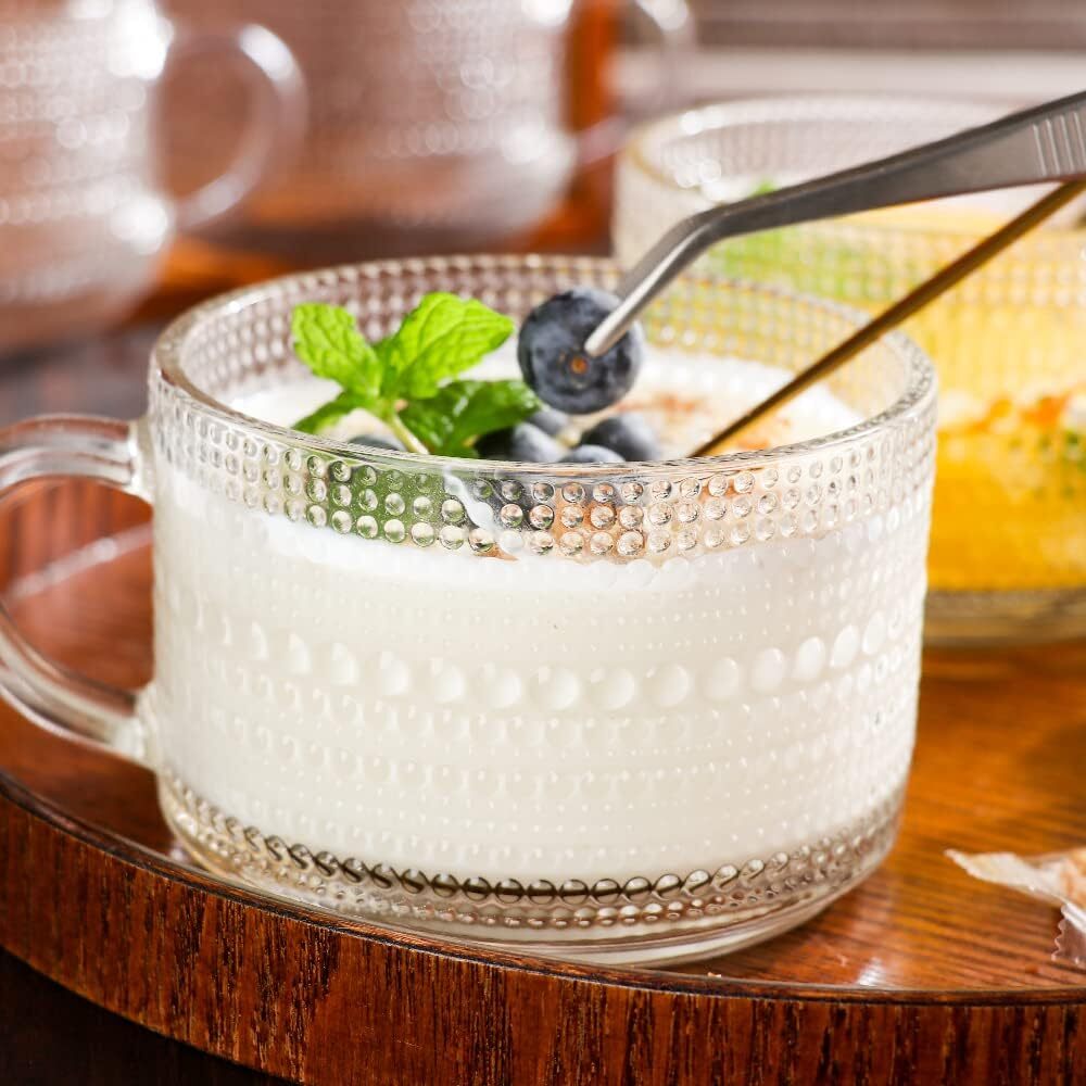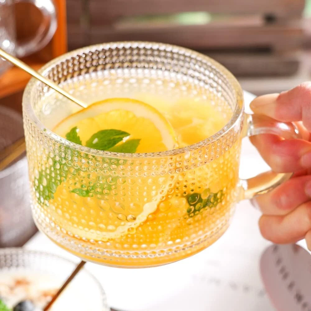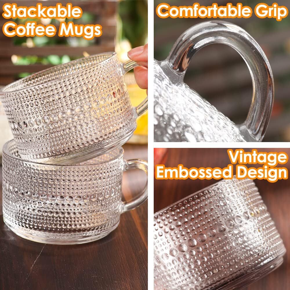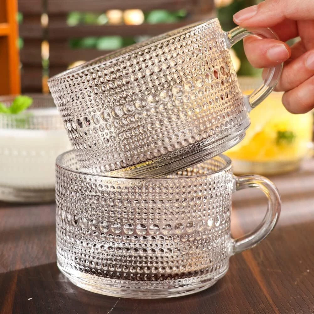 Love these vintage glass mugs! The embossed sunflower design adds a classy touch, and the 14 oz size is perfect for both hot and cold drinks. Super comfortable handle, stacks neatly, and looks great in any setting—morning coffee feels extra special now. Highly recommend!