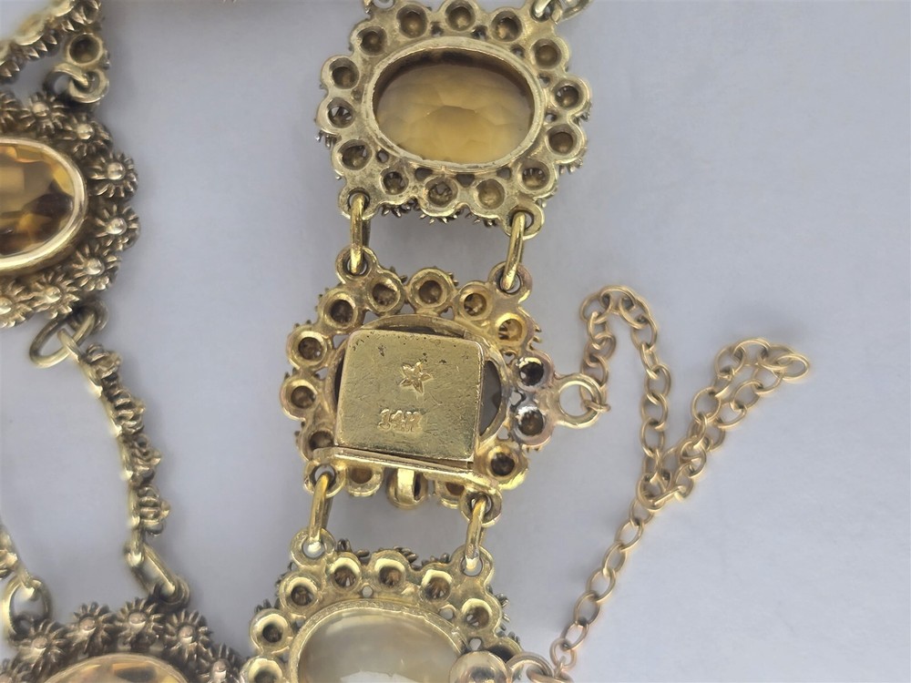 This 14k yellow gold citrine floral bangle measures 7" in wearable length and has a width of 14.7 mm. The back of the clasp is stamped 14K and features a safety chain. This has tested 13-14K Gold. Weight 17.5 G. HT2155 Item As Is. All stones not identified unless clarified above. All items are pre-owned and pre-loved. Stones may show minor nicks and abrasions or small signs of wear. Diamonds are graded using GIA standards by GIA Graduates. Diamond and gemstone weight is estimated by formula. The metal is stamped or identified by acid testing and/or XRF alloy analyzer gun. All items shipped USPS First Class, Signature Required Items over $1000 ship overnight, Signature Required Please message with any questions. We are available Monday through Saturday 10am to 6pm. Powered by SixBit's eCommerce Solution