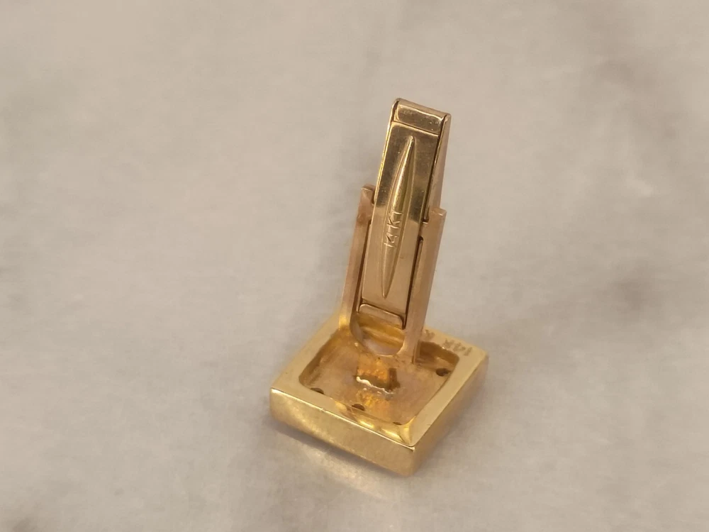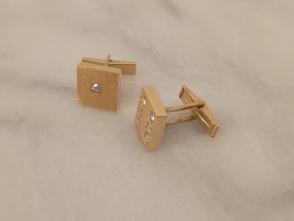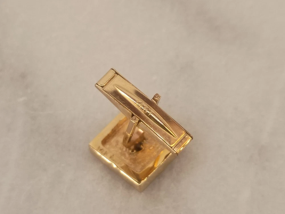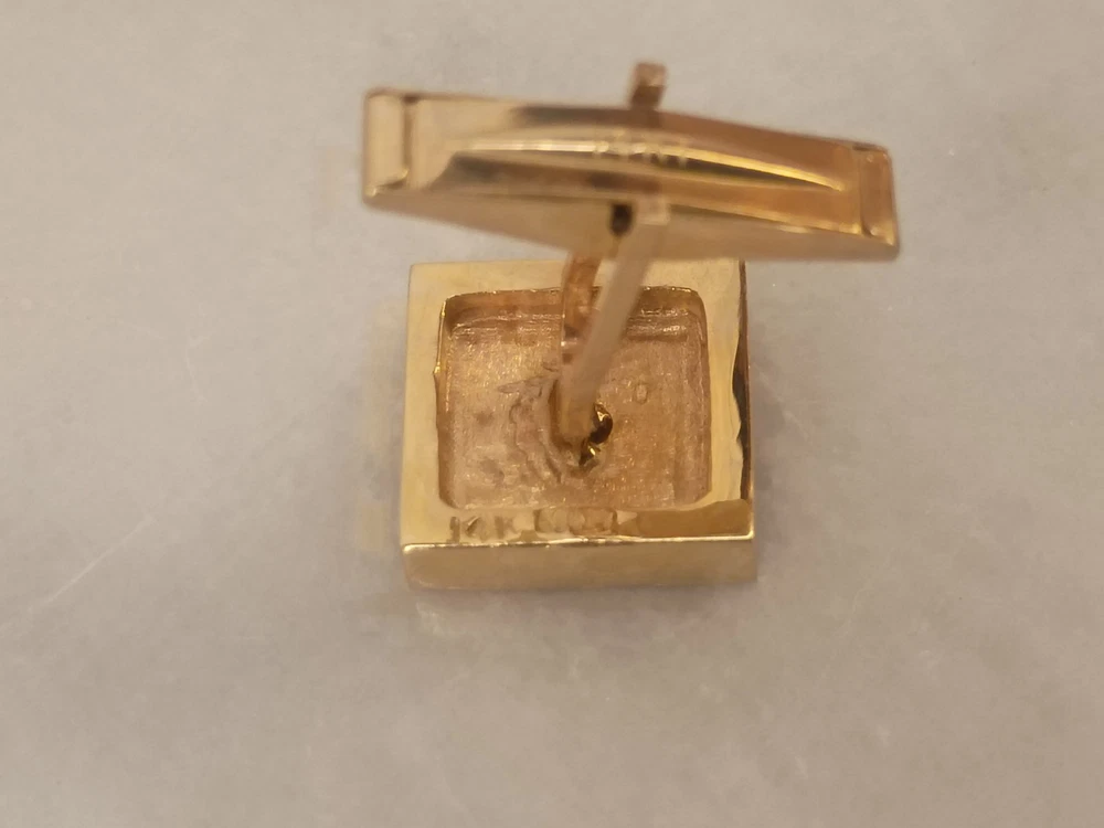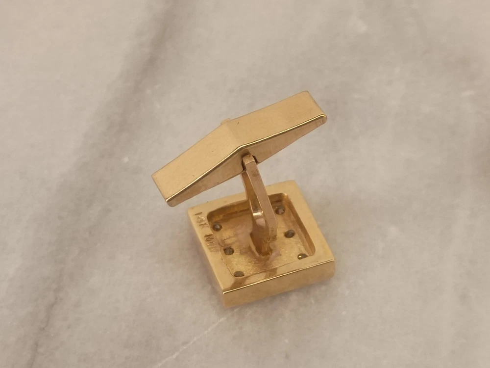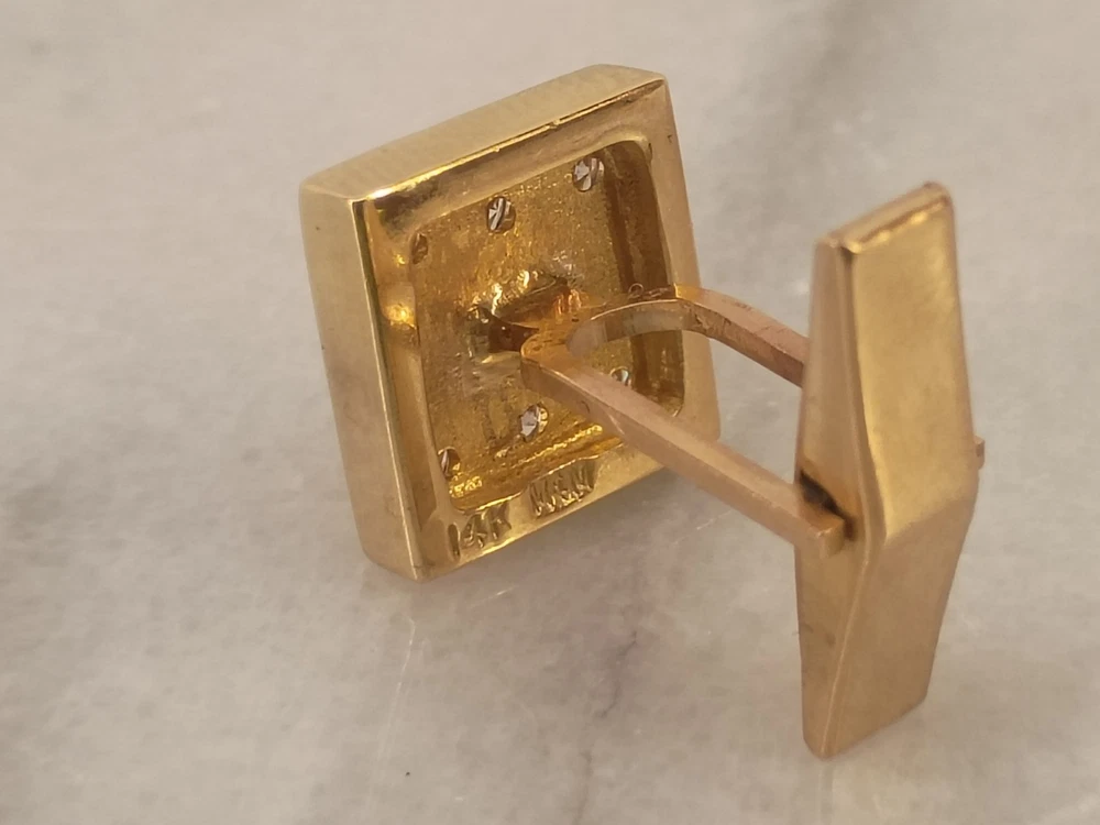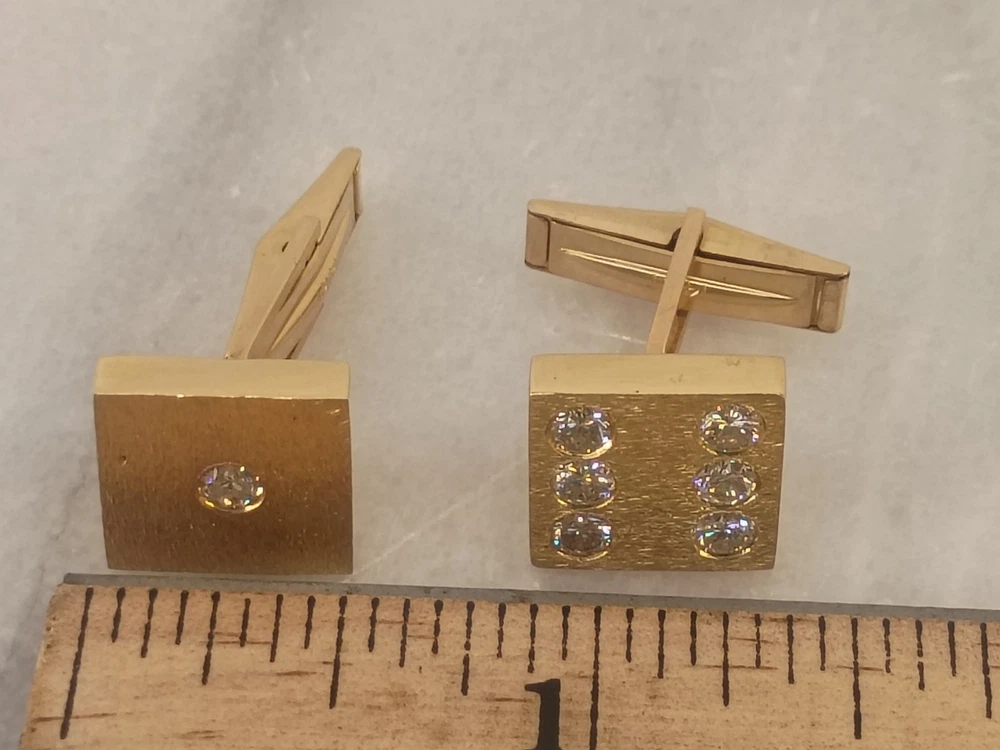 The product is a pair of vintage 14K solid yellow gold cufflinks shaped like dice, featuring a brand stamp of M&M and adorned with diamonds. These cufflinks are designed for men and are crafted with high-quality yellow gold, weighing 11.5g. The unique design and luxurious material make them a stylish and sophisticated accessory for formal occasions or to add a touch of vintage elegance to a tailored outfit. Thank you for visiting my listing today and thank you for your interest in this item! My goal is to have a pleasant transaction resulting in a satisfied customer. I hope any transaction between us leaves you with a feeling of confidence knowing you can trust me and the items I offer here. *Most if not all my listings are set to accept offers. Feel free to send an offer and I will be happy to consider it!! *Please contact me with any questions or concerns and I will be happy to help. *Always examine the photos carefully, and if in doubt, email me with any questions you may have. *Please note that condition statements are offered as a guide only. They will always be somewhat subjective and reflect our opinion, which may not necessarily agree with someone else's opinion. PLEASE READ: I aim to please and I want my buyers to have a positive transaction with me. If you have questions, concerns, or special requests related to any of my items I hope you will contact me so we can work them out to your satisfaction. I sell my items to give you a great item at a decent price while making a little profit at the same time. If you feel the item you are interested in is too pricey do not hesitate to send me a fair offer and I will consider it. My goal is to satisfy your needs and mine so both parties can benefit. SHIPPING: If you prefer a different shipping method or company please contact me and I will do all I can to make that happen. If you have concerns or requests about the packaging of your item contact me and I will do all I can to accommodate them. Shipping costs are based on location in each state or country, the costs always differ. After I have received your payment I will ship your item out within 3 business days or less excluding weekends and holidays. BEFORE PURCHASING & BIDDING: **Please see all the pictures. I do not have great photography skills but I try to get the most accurate photos I can. If you are unsure about something you see in a photo contact me so I can do what I am able to answer your concern about the item. **I cannot stress enough that if you have any questions or concerns please contact me before purchasing and bidding. Communication can solve so much. **As a customer myself, I understand the meaning of customer satisfaction and my goal is to have nothing but satisfied customers. If you are not unsatisfied with your purchase I ask that you please contact me so I can take care of your issue. My goal is for you to be 100% satisfied. INTERNATIONAL BUYERS WELCOMED - PLEASE NOTE: I welcome International buyers! Please be aware that any custom/duties/taxes that the parcel might incur once it is out of the USA are the responsibility of the buyer. Please check with your country's customs office to determine what these additional costs will be prior to bidding or buying. Please refer to the eBay Site Map for more information if needed.