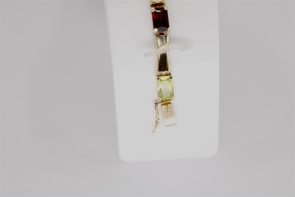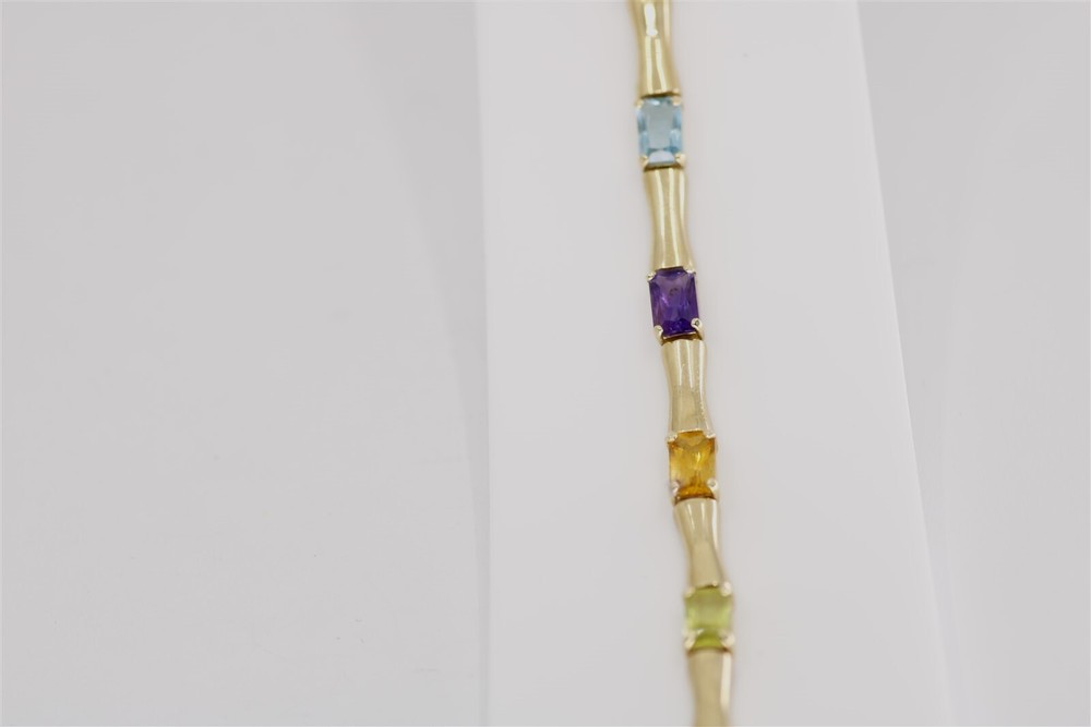 14K Yellow Gold Vintage 7.5 Inch Blue Topaz, Citrine, Garnet, Peridot & Amethyst Bracelet. This 7.5 inch rectangular bracelet features 2 blue emerald Topaz in a prong setting with an approximate stone width of 4.2 mm, and 2 orange emerald Citrine, 3 red emerald Garnet, 3 green emerald Peridot, and 2 purple emerald Amethyst. This bracelet has a width of 4.4 mm and a box clasp. There is a hallmark stamped, "14K". This bracelet has a total weight of 8 grams. ER010925 Item As Is. All stones not identified unless clarified above. All items are pre-owned and pre-loved. Stones may show minor nicks and abrasions or small signs of wear. Diamonds are graded using GIA standards by GIA Graduates. Diamond and gemstone weight is estimated by formula. The metal is stamped or identified by acid testing and/or XRF alloy analyzer gun. All items shipped USPS First Class, Signature Required Items over $1000 ship overnight, Signature Required Please message with any questions. We are available Monday through Saturday 10am to 6pm. Powered by SixBit's eCommerce Solution