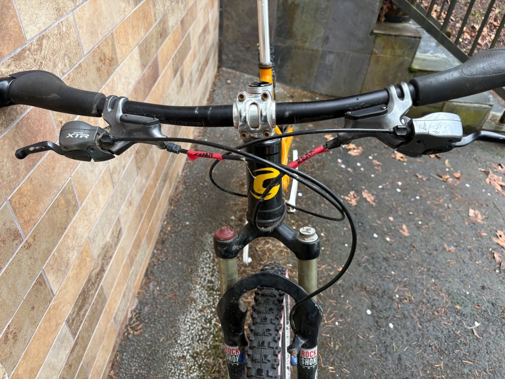 The Vintage 15.5” Cannondale JEKYLL Lefty Fork Full Suspensión Mountain Bike 26” is a classic piece of sporting goods, featuring a flat bar handlebar and 26-inch wheels perfect for off-road adventures. This mountain bike boasts a full suspension system, with both front and rear suspension, providing a smooth ride over rugged terrain. The bike is crafted from lightweight aluminum and equipped with 27-speed derailleur gears for easy and precise gear changes. With a unique color combination of yellow, red, and black, this vintage Cannondale JEKYLL model is a stylish and functional choice for any avid cyclist. Bike has been in storage for several years. One owner. Brakes need to be replaced, parts are included. Tires are original so need to be replaced. Fun project for someone with tools/time.