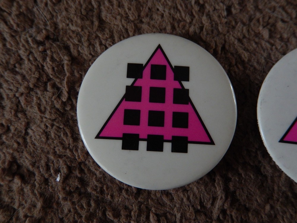This vintage pink triangle LGBTQ+ pinback button, measuring 1.75" in diameter, is a collectible item that represents LGBTQ+ pride. Made in the United States, this pin showcases a bold design and vibrant color scheme. It would make a great addition to any pin collection or could be worn as a statement accessory to show support for LGBTQ+ rights and visibility. THESE 2 PINS ARE IN VERY NICE VINTAGE CONDITION. THEY MEASURE 1 3/4'' IN DIAMETER. MARKED ON THE SIDE OF PIN ''NATIONAL FLAG AND BANNER CO., 913 ARCH ST., PHILA. PA. ESTATE SALE FINDS. MESSAGE ANY OTHER QUESTIONS AND THANKS FOR LOOKING