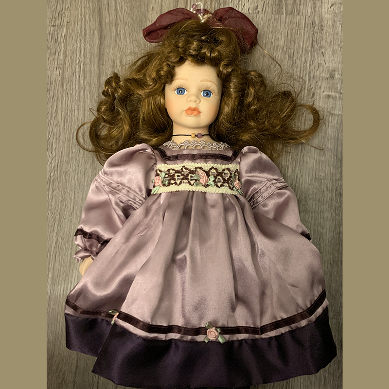 Vintage Porcelain Doll in Purple Satin Dress, 18” - Excellent Condition” Enhance your collection with this vintage porcelain doll, measuring 18 inches tall. This beautifully crafted doll features cascading curly brown hair adorned with a deep purple ribbon, striking blue eyes, and a charming expression. The doll is dressed in a luxurious purple satin dress with intricate lace and rosebud accents, paired with matching black lace-up shoes and black lace stockings. Condition: Preowned but in excellent condition, with no cracks, chips, or damage to the porcelain. The clothing is vibrant and free of stains. Please review all provided photos for a closer look at this elegant piece. Ideal for doll collectors or as a decorative addition to any room, this doll is sure to capture attention and admiration!