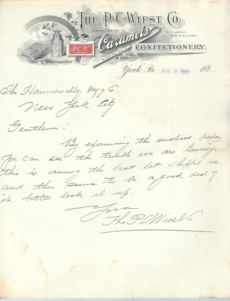 This is a lot of 5 letters to Hammerschlag Mfg. from various companies circa 1890's. Novelty Candy Company, Pittsburgh, PA - 1897. Three from P.C. Weist Co. York, PA - 1897, 1886, 1895. P.H. Wunderle Philadelphia, PA - 1894. Excellent condition - see scans. Free Shipping!! The American Caramel Company grew out of an industry established by Peter C. Wiest in 1867. He was a pioneer in the manufacture of caramels and soon developed a successful business. The American Caramel Company was created on March 28, 1889, when the Breisch-Hine Co. of Philadelphia and the P. C. Wiest Co. of York, Pennsylvania, merged. After acquiring the Lancaster Caramel Company in 1900, the American Caramel Company became famous by including baseball and other cards in with its candies. With the addition of the Lancaster Caramel Company, the American Caramel Company grew to control 90% of the caramel in the country. The American Caramel Company was one of the early businesses to issue of Baseball Cards with their product. In December 1928, The American Caramel Company shut down the York Plant, moving the candy making machinery to a more modern facility.