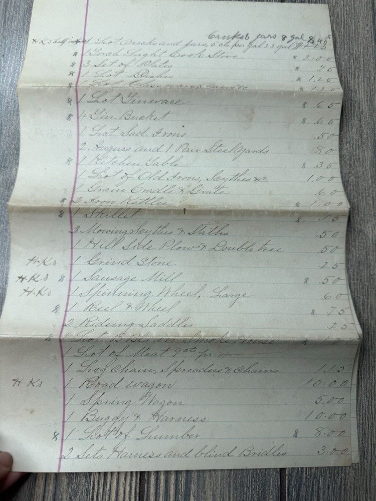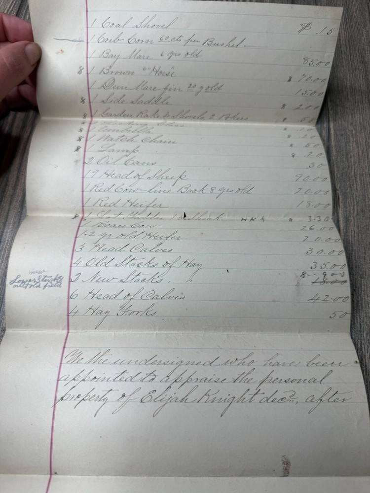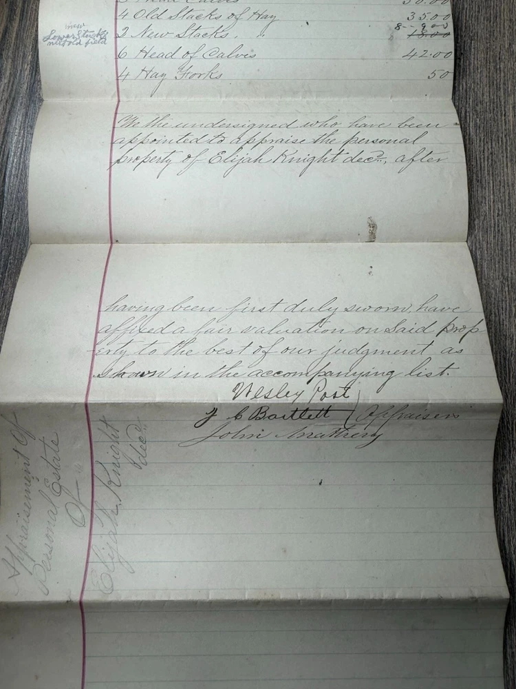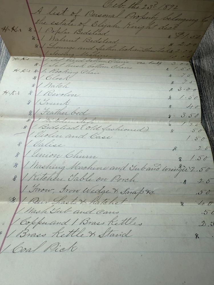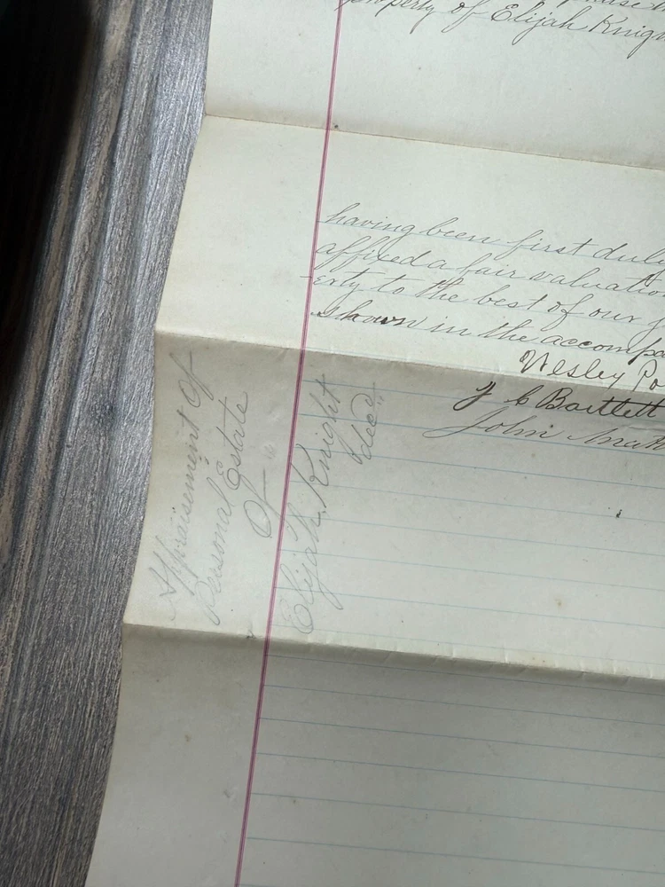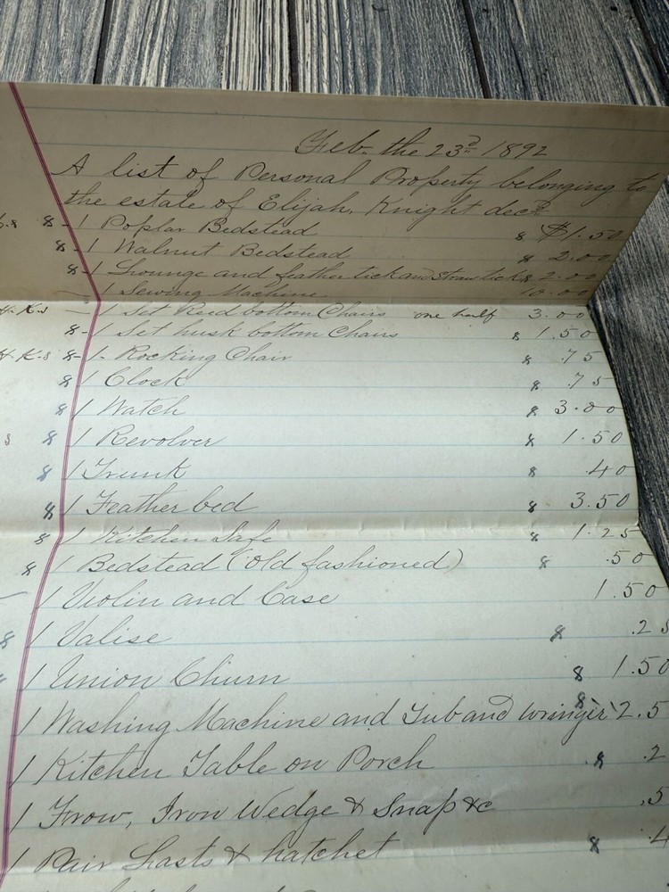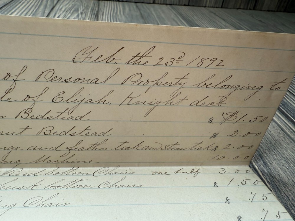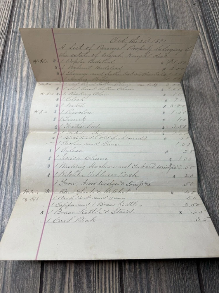 This 1892 handwritten estate inventory offers a detailed glimpse into the assets of Elijah Knight, dec'd, showcasing historical valuation and personal property documentation. • Authentic 1892 estate inventory • Handwritten details of personal property • Includes valuation of items • Unique historical document • Measures approximately 8.5" x 14" when unfolded Visible folds, light discoloration, and minor edge wear consistent with age. Approximate size when unfolded: 8.5 inches x 14 inches.