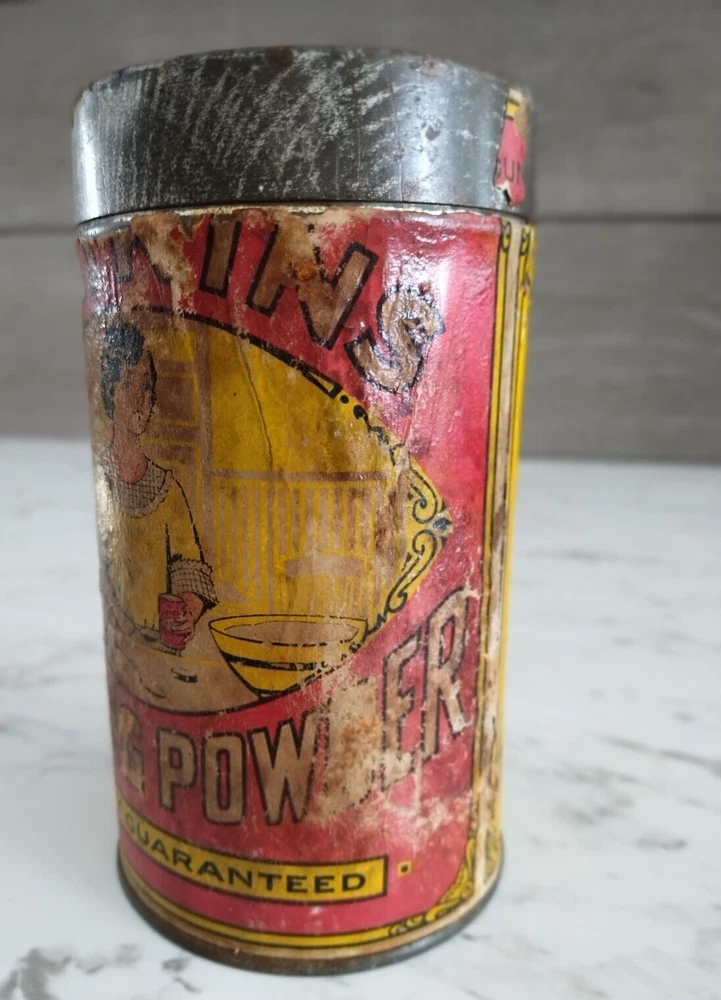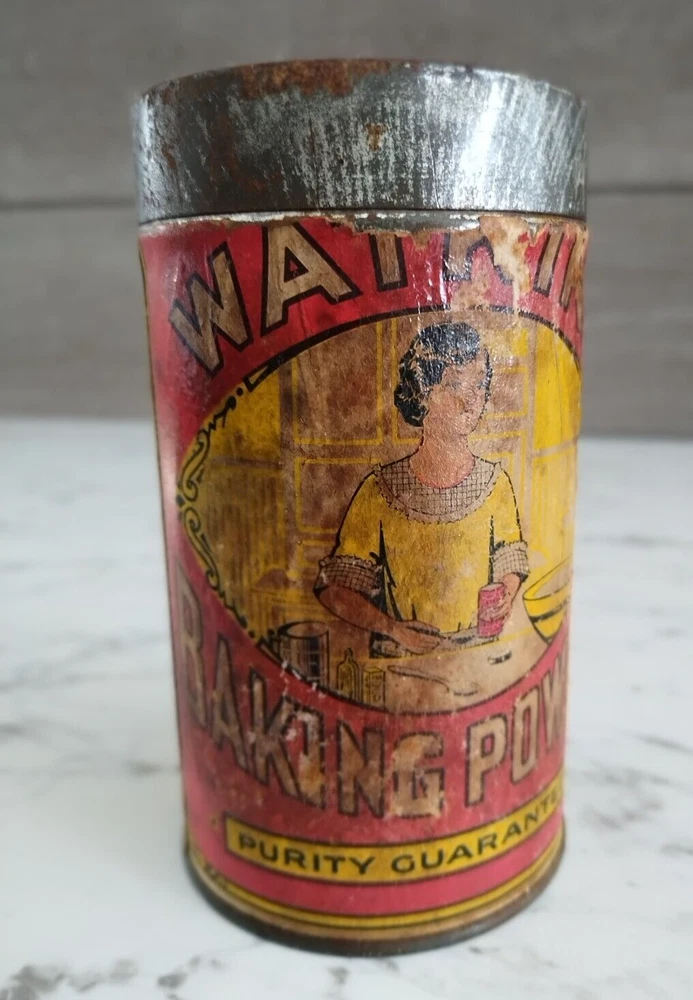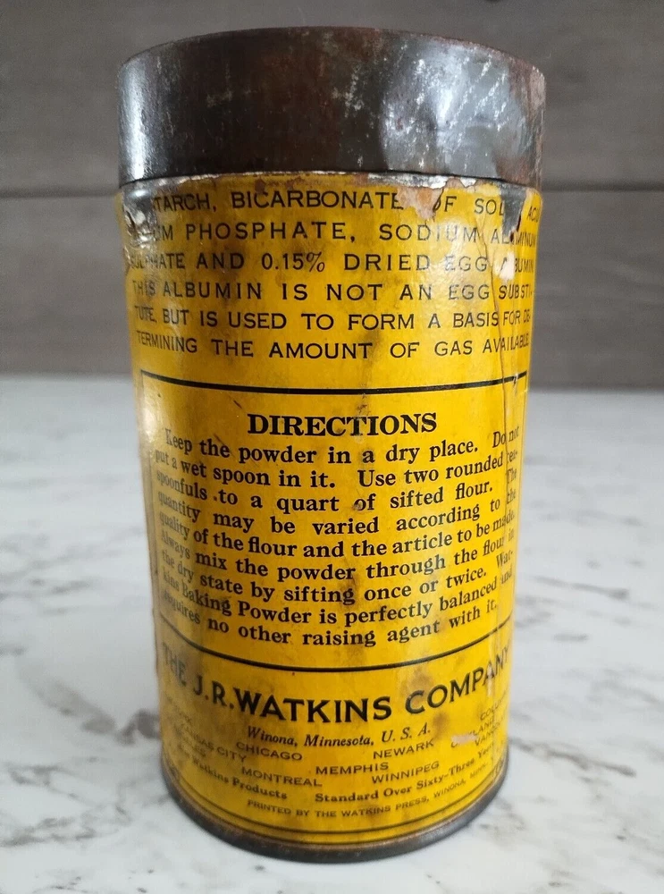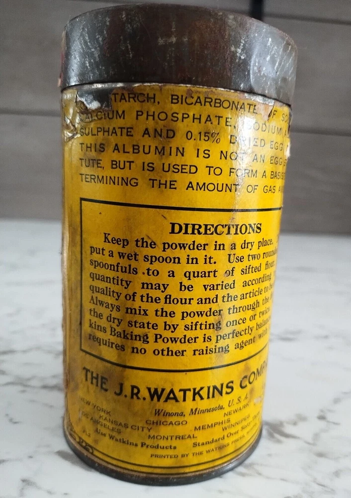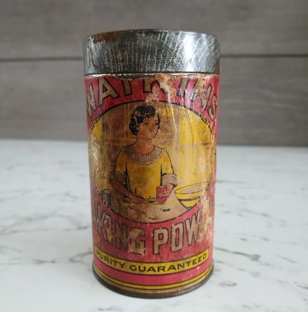Vintage 1900s Watkins Baking Powder 1 Lb Paper Label Tin Can w/Original Lid