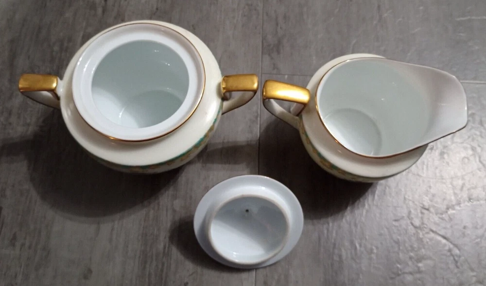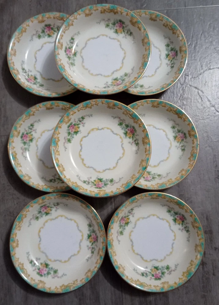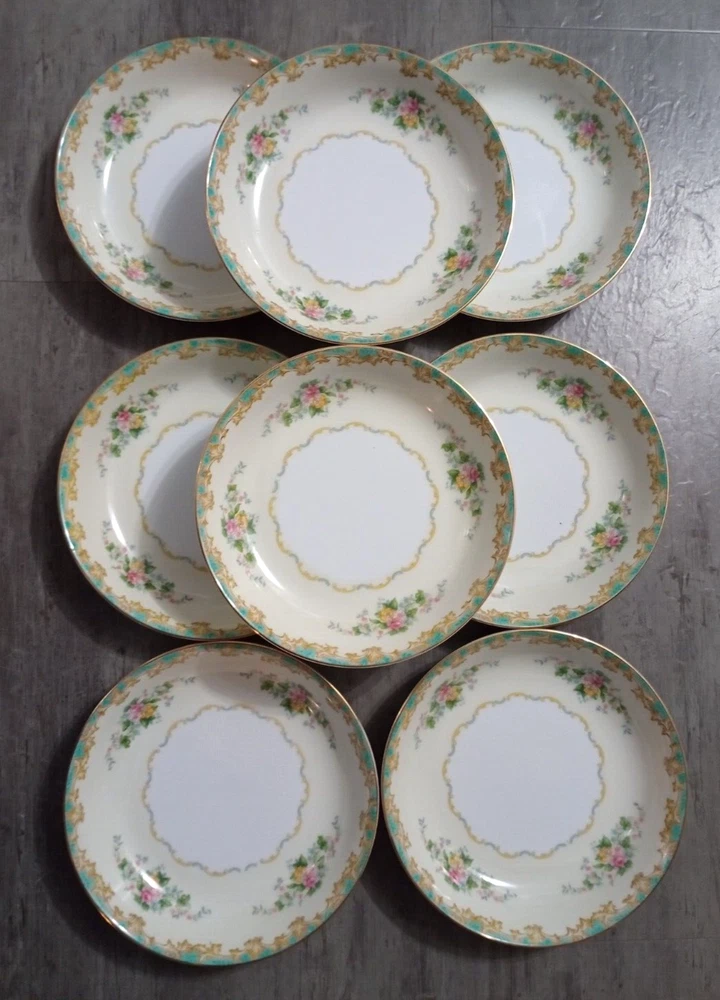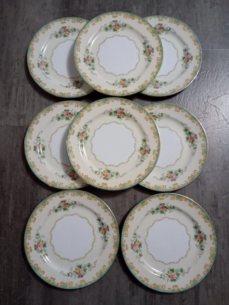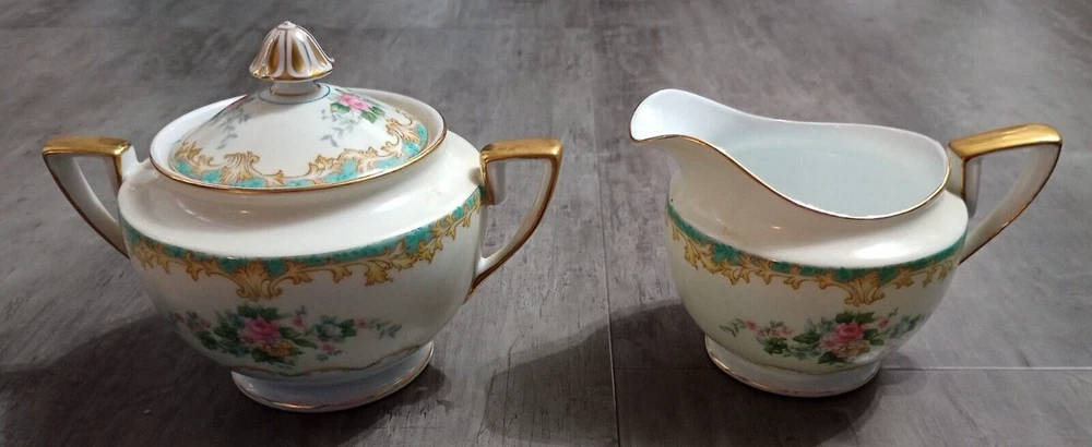 Vintage 1920's Noritake Morimura Adela China lot of 52 pieces. Green border, floral spray with gold trim 8 dinner plates(10 in), 8 salad plates(7 5/8 in), 8 soup bowls(7 3/8 in), 8 fruit bowls(5 1/4 in), 8 teacups, 8 saucers, platter(16 in), creamer(3 1/4 in), sugar bowl with lid(3 1/4 in) Beautiful china set in excellent condition!! No chips, cracks or crazing. It looks amazing! Please refer to photos as they are part of the description. Please ask if you have any questions. Payment is due within five days. Please look at the other items I have listed as I will combine shipping. Your item will be carefully packaged. If it arrives damaged, it is the buyer's responsibility to file a claim with the shipping carrier. Please do not leave negative or neutral feedback before contacting me with any issues as there is usually a solution to the problem. Returns will not be accepted after 30 days. Thanks for looking. DW