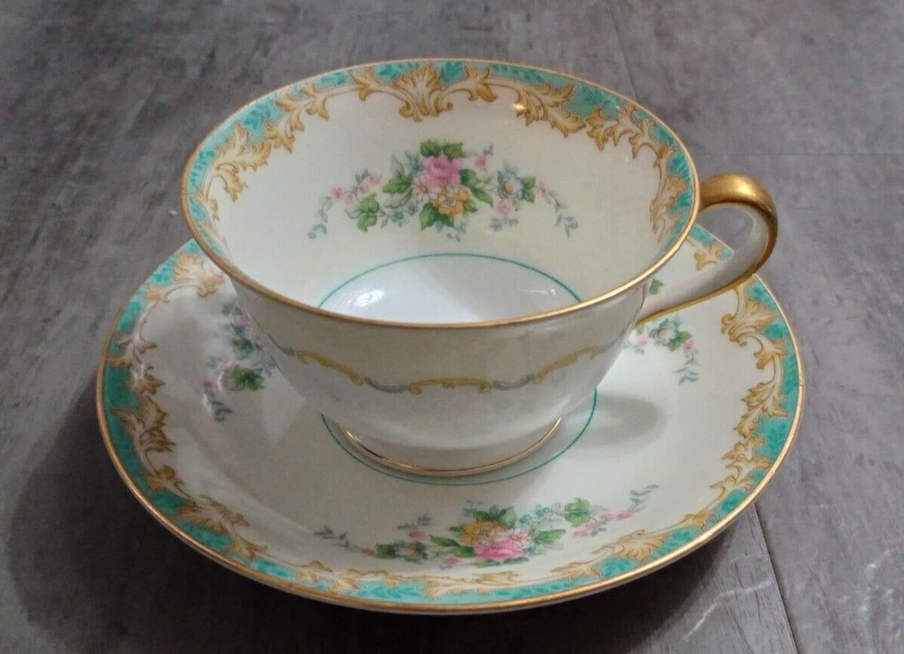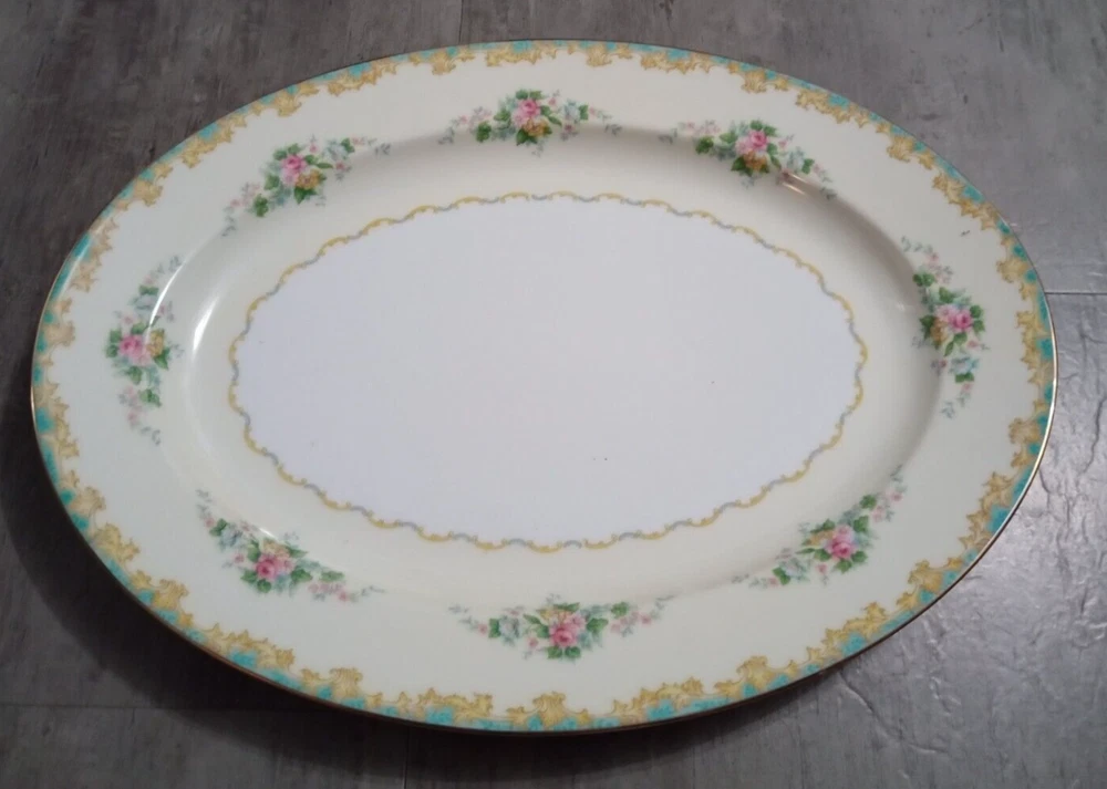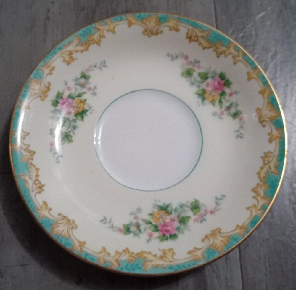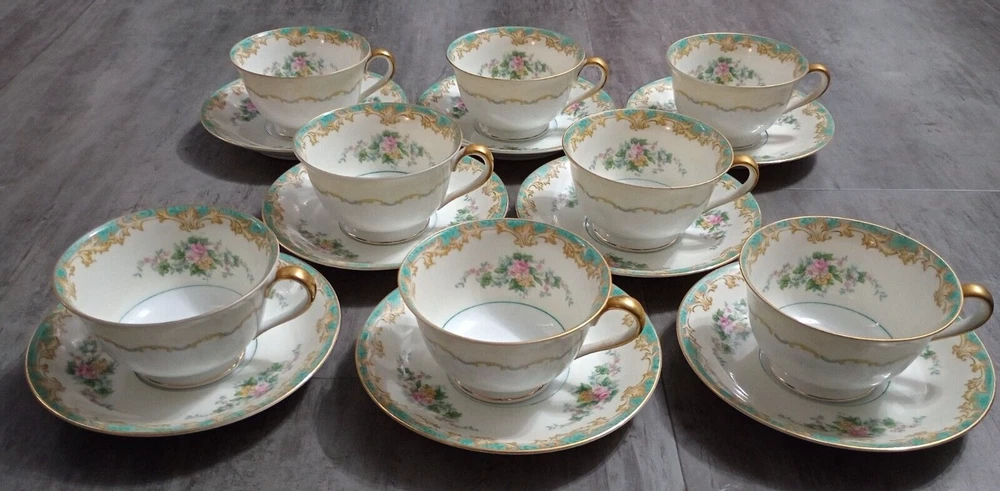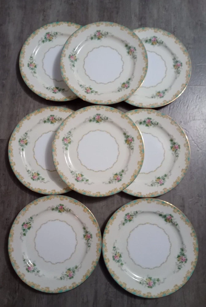 Vintage 1920's Noritake Morimura Adela China lot of 52 pieces. Green border, floral spray with gold trim 8 dinner plates(10 in), 8 salad plates(7 5/8 in), 8 soup bowls(7 3/8 in), 8 fruit bowls(5 1/4 in), 8 teacups, 8 saucers, platter(16 in), creamer(3 1/4 in), sugar bowl with lid(3 1/4 in) Beautiful china set in excellent condition!! No chips, cracks or crazing. It looks amazing! Please refer to photos as they are part of the description. Please ask if you have any questions. Payment is due within five days. Please look at the other items I have listed as I will combine shipping. Your item will be carefully packaged. If it arrives damaged, it is the buyer's responsibility to file a claim with the shipping carrier. Please do not leave negative or neutral feedback before contacting me with any issues as there is usually a solution to the problem. Returns will not be accepted after 30 days. Thanks for looking. DW