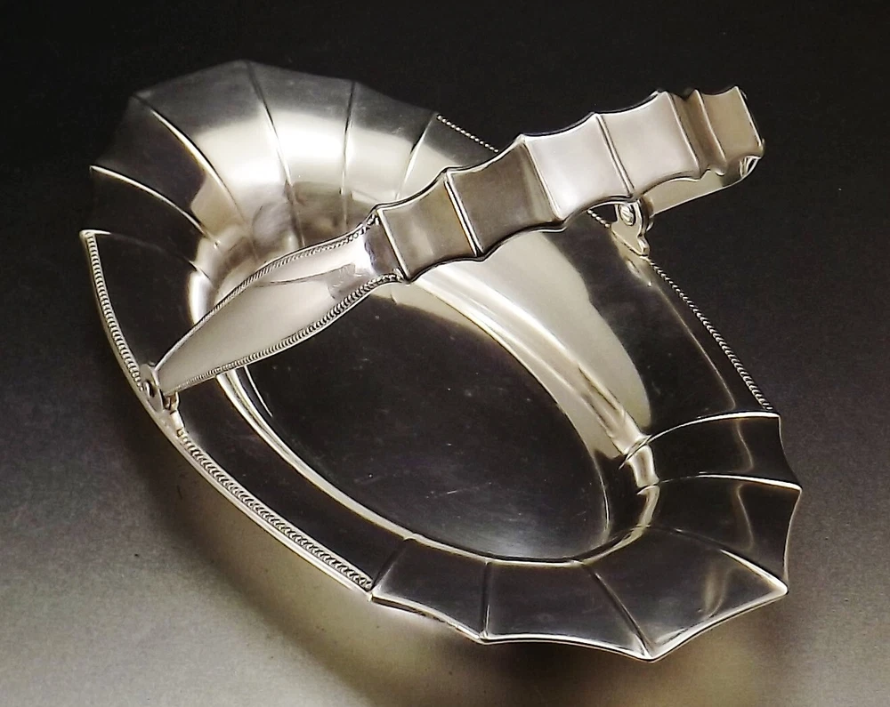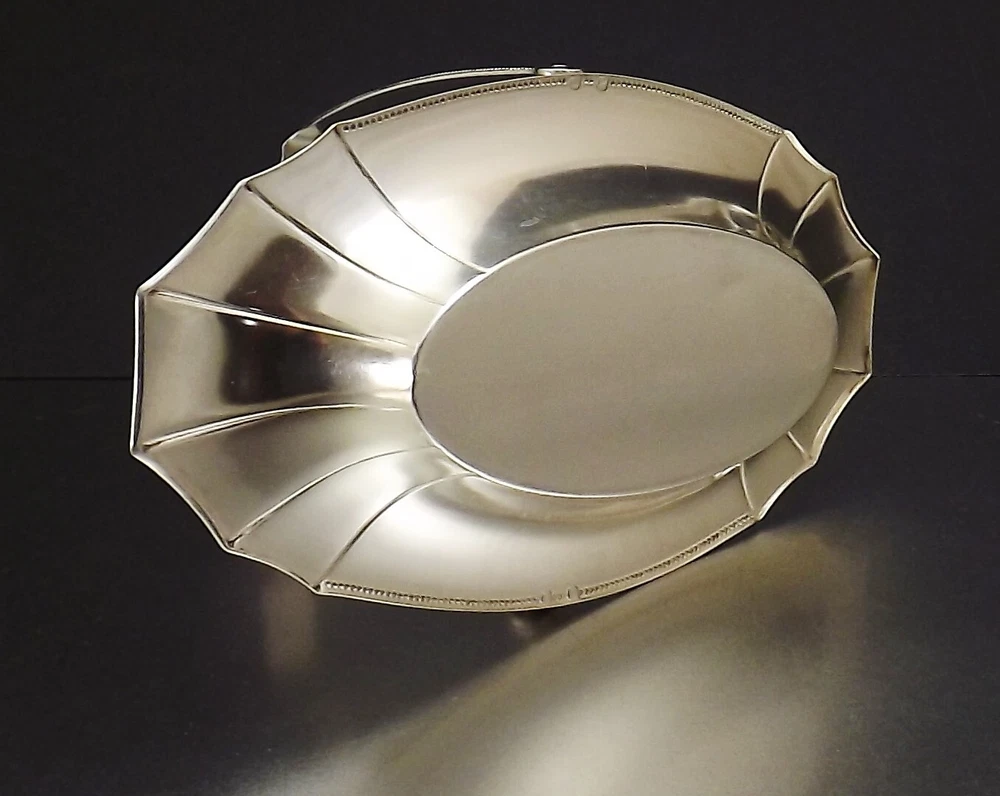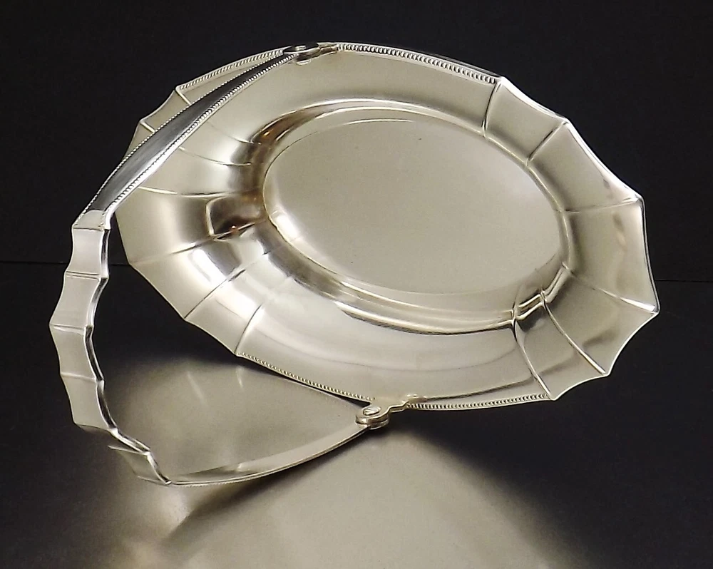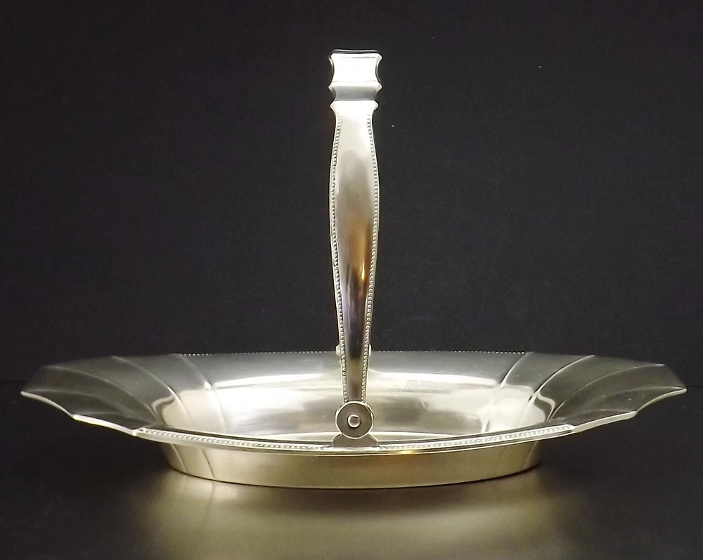 Petite coupe Art Déco. *** En métal argenté . *** Orfèvrerie WMF en Allemagne. *** Epoque années 1920. *** Dimensions : longueur 210mm, largeur 120mm, hauteur 135mm. Poids : 180 grammes. Description : Petite coupe à anse panier Art Déco en métal. De forme ovale avec anse mobile et décor de perles. Orfèvrerie Allemande WMF. Poinçons et marquages : Poinçons de l'orfèvrerie WMF avec le kangourou. Etat : En parfait état, (voir photos).