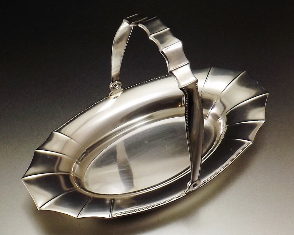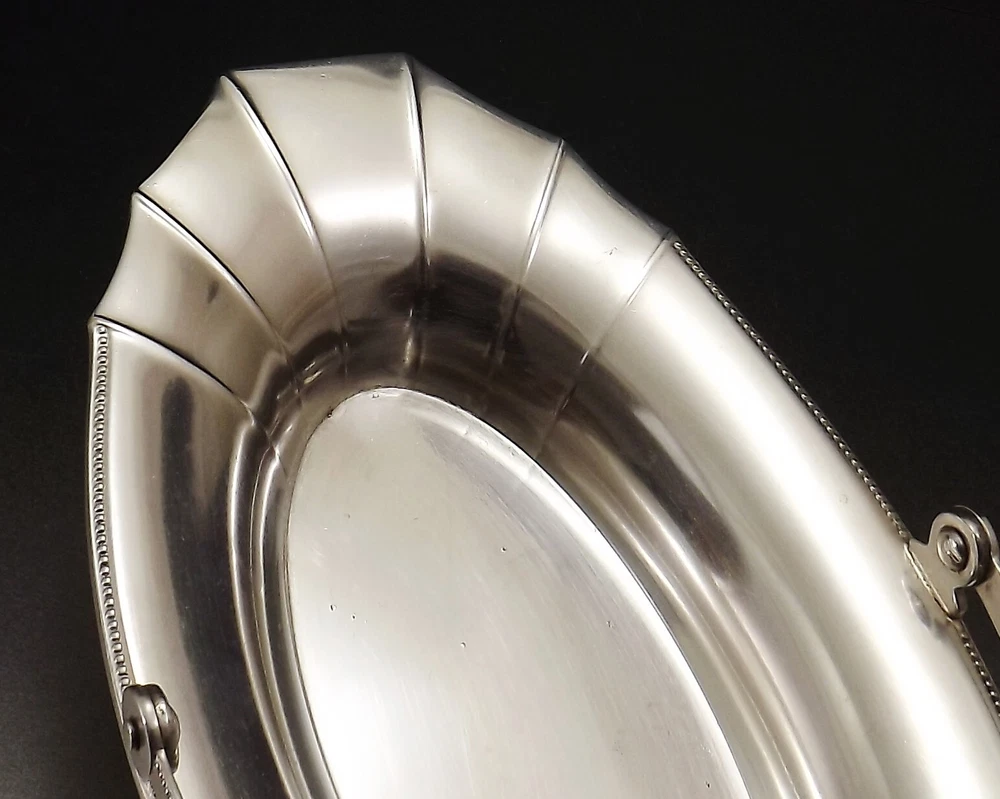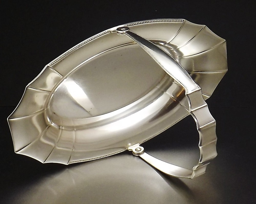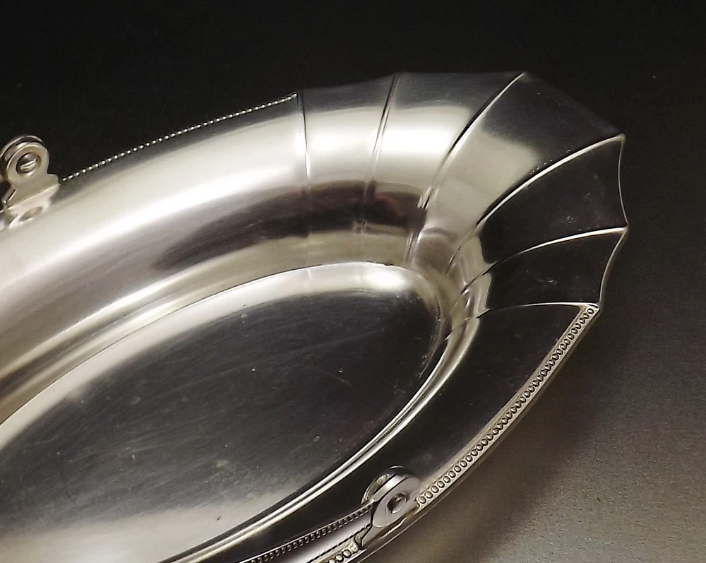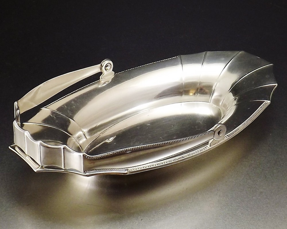 Petite coupe Art Déco. *** En métal argenté . *** Orfèvrerie WMF en Allemagne. *** Epoque années 1920. *** Dimensions : longueur 210mm, largeur 120mm, hauteur 135mm. Poids : 180 grammes. Description : Petite coupe à anse panier Art Déco en métal. De forme ovale avec anse mobile et décor de perles. Orfèvrerie Allemande WMF. Poinçons et marquages : Poinçons de l'orfèvrerie WMF avec le kangourou. Etat : En parfait état, (voir photos).