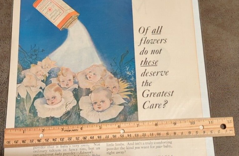 Vintage 1921 JOHNSON'S Baby Powder Art Decor Ephemera Lady's Home Journal Ad. This ad is in pretty good shape considering age. It has been protected in a sleeve and board since it was purchased 20 years ago. There are no tears or creases. Please see the photos for reference. All of my items are carefully packed for shipping, no matter their value - $5 items are wrapped with the same care as a $200 item. My goal is to have your purchase arrive safely. Large, heavy and fragile items are harder to use combined shipping with but just ask if you would like to purchase more than one item and I am more than happy to do so if feasible. Measurements are approximate or as close as I can get. Also, the color you see many not be the exact color depending on your computer or phone settings. Unpaid items will result in the buyer being blocked from further purchases. Please remit payment right away so we can get your item shipped out quickly.