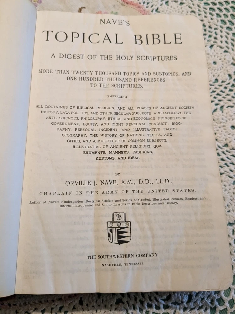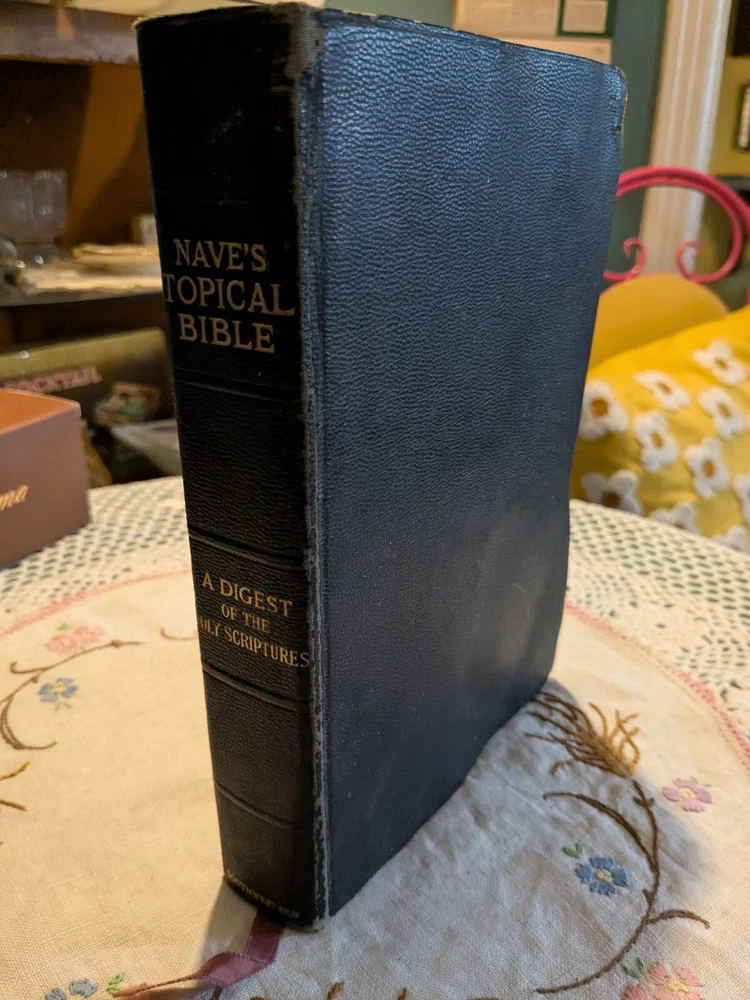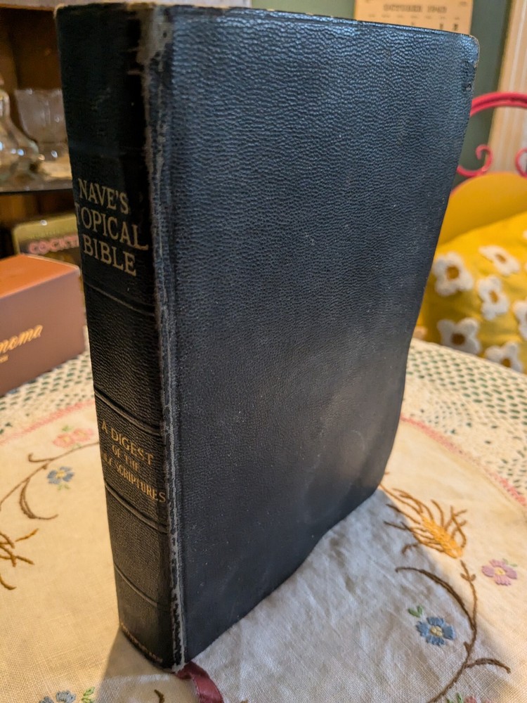 Intended Audience: Adults, Young Adults Publisher: Southwestern gtin13: Does not apply Language: English Type: Prayerbook Signed: No Subjects: Religion & Beliefs Narrative Type: Nonfiction Topic: Bible Book Title: Naves Topical Bible Subject: Religion & Spirituality Original Language: English Features: Leather Bound Genre: Religious & Spiritual Format: leather Publication Year: 1921 ISBN: Does not apply Country/Region of Manufacture: United States Special Attributes: Thumb Indexed, Vintage Author: Orville J. Nave
