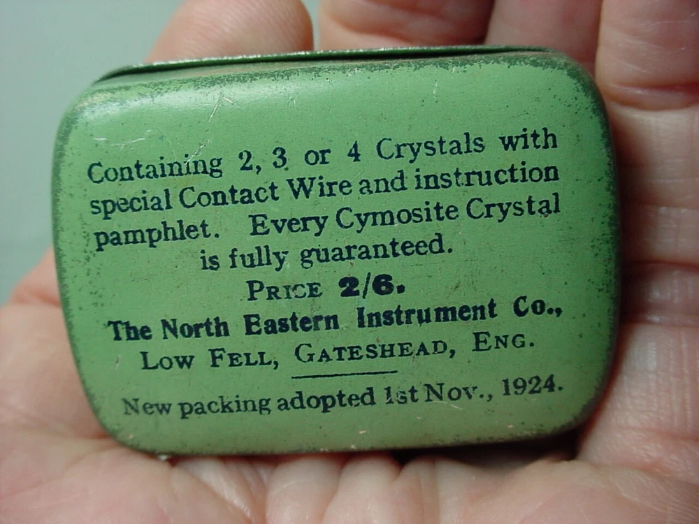 Here is an old empty CYMoSITE detector crystal tin container. It is about 1-7/8"x 1-1/8"x 5/8". It has wear.