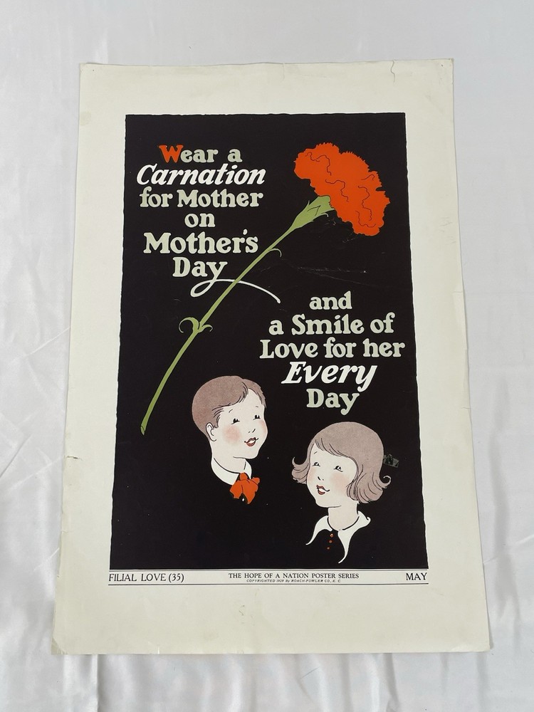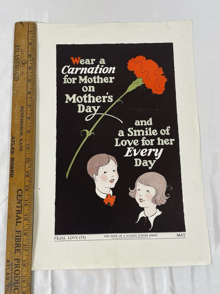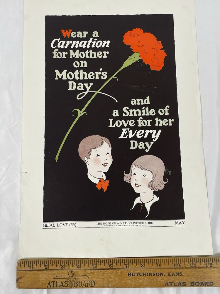 Great Condition This product is a collectible propaganda poster from the United States during World War I (1914-18). The poster features a carnation and the words "Mothers Day 1929 - Hope of a Nation". It is an original piece and was created to promote a poster art collection. The poster falls under the Militaria theme and is a unique piece of history from the WW I era.