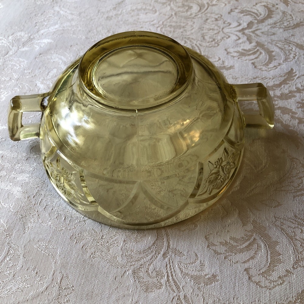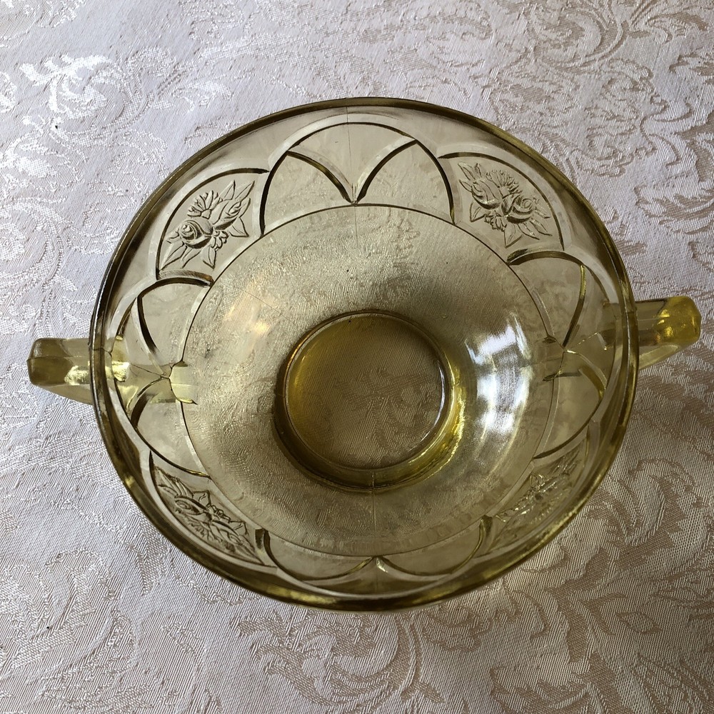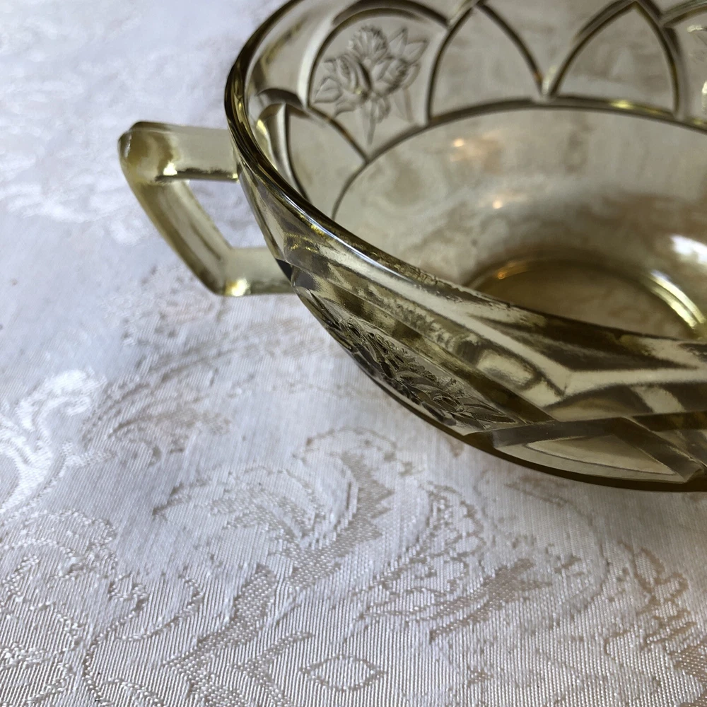 Vintage Amber Federal Glass Dutch Rose Double Handled Bowls from the 1930s. This set includes three round bowls with a diameter of 4.75 inches and a height of 2.25 inches. Made of pressed glass, each bowl features the Dutch Rose pattern and handles. Ideal for all occasions, these bowls should be hand washed. A charming addition for collectors of early 20th-century glassware. Nice vintage glassware