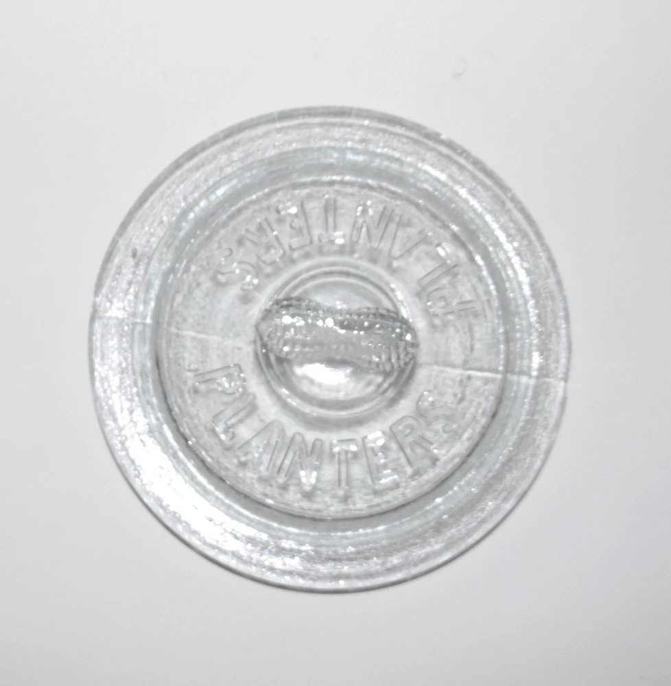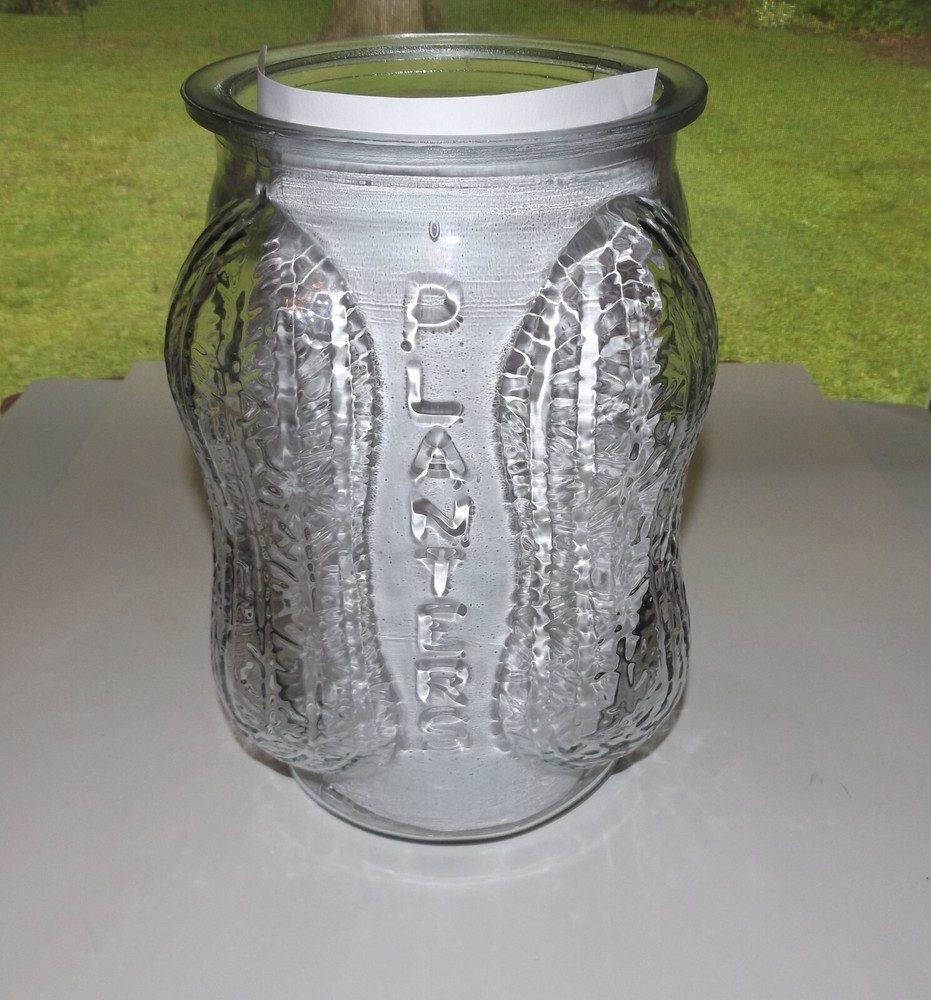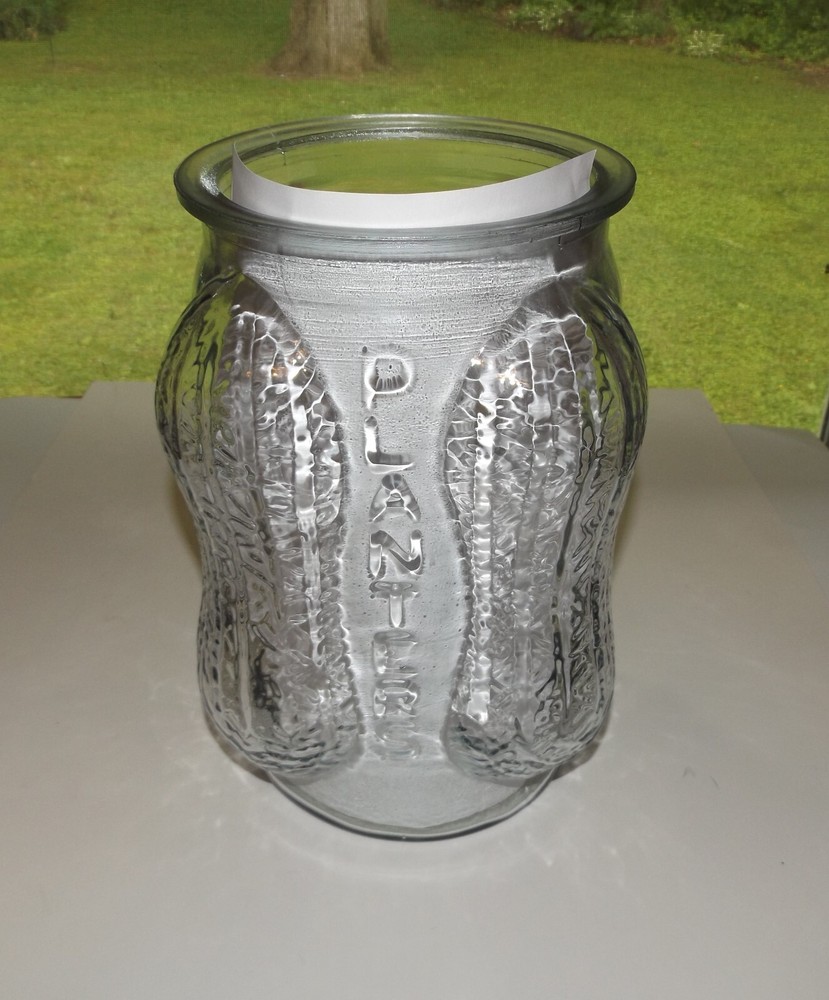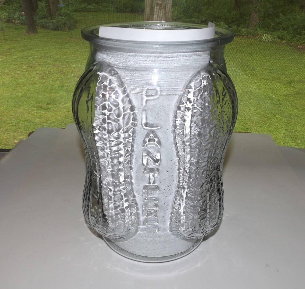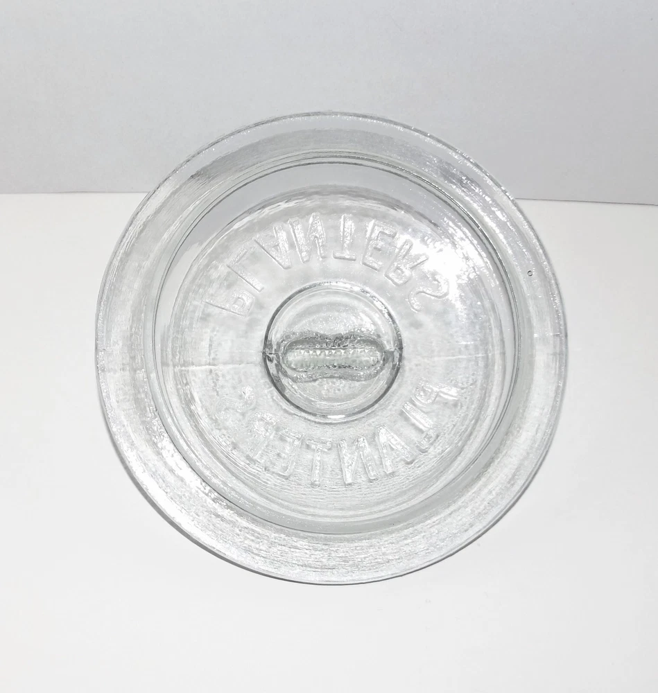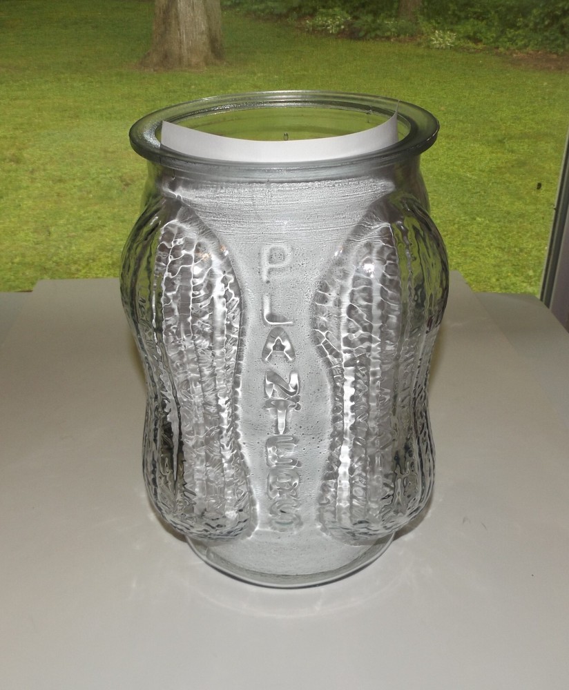 1930s/40s Planters Peanut Clear Glass Counter Jar w/Lid 4 Peanut Shaped Corners Original Planters Peanut collectible counter display jar. Clear glass jar with peanut shell designed corners and PLANTERS logo vertically embossed on each side. Lid has peanut handle and PLANTERS impressed on underside. Made in USA embossed on bottom. Measures approximately 14” high with lid x 8” wide. In very good condition. White paper placed behind logos on each side to highlight; paper not included. One flaw noted: small glass chip inside rim. Selling as is. Use pictures as part of description. Weighs just under 8 lb before packing. Will be double boxed for added protection.