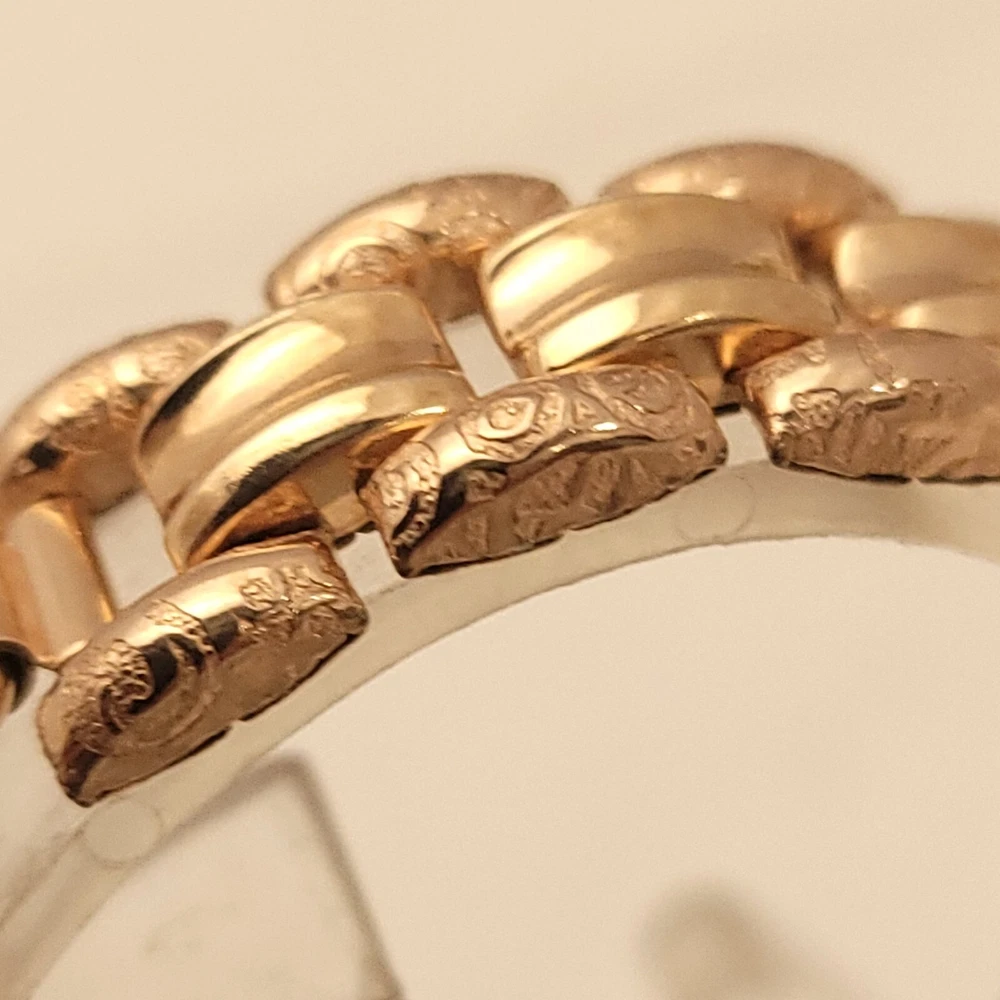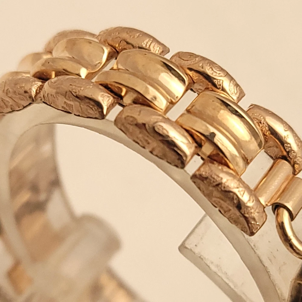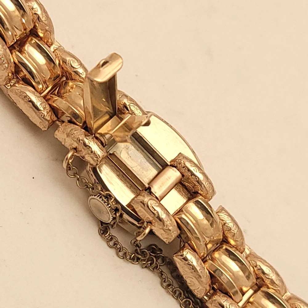 THIS IS A STUNNING 1940S HIGH GRADE SWISS LADIES COCKTAIL WATCH WITH A GORGEOUS MATCHING FACTORY ENGRAVED 1/10 12K GOLD BAND. A BEAUTY ON THE WRIST! THIS HIGH QUALITY SWISS BEAUTY IS RUNNING STRONG AND ACCURATE, WINDING SMOOTHLY AND SETTING PROPERLY, KEEPING FINE TIME. YOU'RE GOING TO LOVE TO STRAP ON THE GORGEOUS MATCHING ROSE GOLD BRACELET THAT IS FACTORY ENGRAVED. IT REFLECTS THE LIGHT WITH EVERY TWIST AND TURN OF YOUR WRIST. THIS IS A HIGH QUALITY BRACELET MADE OF 1/10 SOLID 12 KARAT GOLD. SHE WILL FIT A 6 INCH WRIST COMFORTABLY. THE DIAL IS ROSE GOLD COLOR DISPLAYING A TWO-TONE EFFECT WHEN ANGLE FROM SIDE TO SIDE. I HAD A DIFFICULT TIME GETTING A GOOD PICTURE OF THE DIAL, WHICH IS TRULY BEAUTIFUL. HER BOLD BLACK HANDS ACCURATELY DISPLAY THE PASSING TIME TO THE ARABIC BLACK HOUR NUMERALS WHICH ARE FRAMED BY A FULL TRACK OF MINUTE MARKERS. POWERING THE HANDS IS A HIGH-GRADE SWISS MADE GLYCINE 17 RED RUBY JEWELED MOVEMENT. EACH OF THE RED RUBY JEWELS ACT AS BEARINGS TO REDUCE FRICTION IMPROVING ACCURACY AND ENSURING LONGEVITY. HER MOVEMENT IS CLEAN, RUNNING STRONG AND ACCURATE. Somebody is going to be very pleased when they place the winning bid. _____________________________________ Take a few minutes and read some of the tens of thousands of positive feedback that we have received from our users here at Decowatches and our sister site Decowatchesparts and you will understand why buying a watch from us is an enjoyable and safe experience! Our shipping fee ensures that this watch is carefully packaged, has door to door tracking and comes with a three-month service warranty for your added piece of mind satisfaction and convenience! We are pleased to say that we are now shipping twice a week, either Wednesday or Thursday and Saturdays. Good luck to you all! If you enjoy collecting vintage watches as much as I do, after you place your winning bid, click on save seller next to our username. Then you can easily check back often as I will be listing a few magnificent vintage mens watches this week and every week. This week we will have a bunch of magnificent and rare watches listed.
