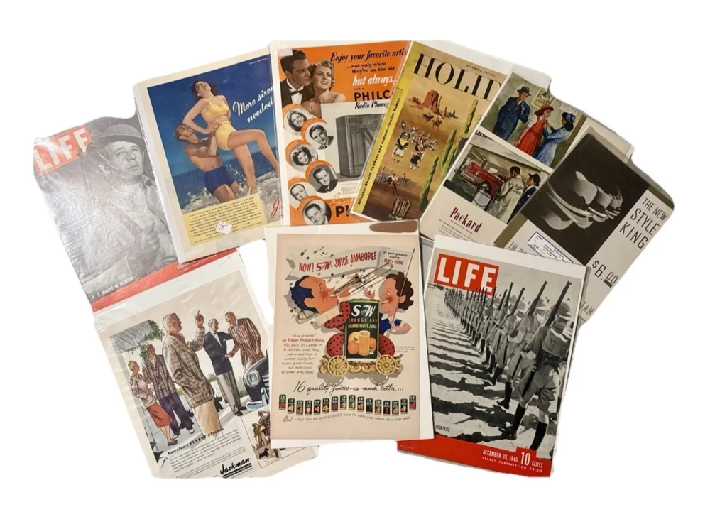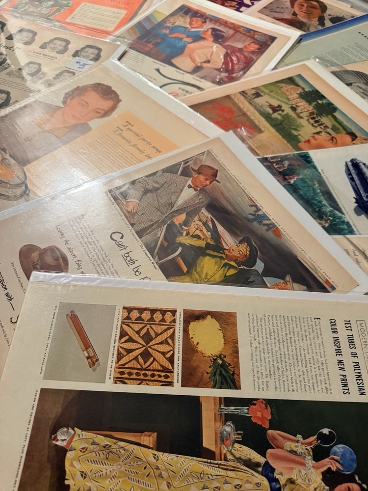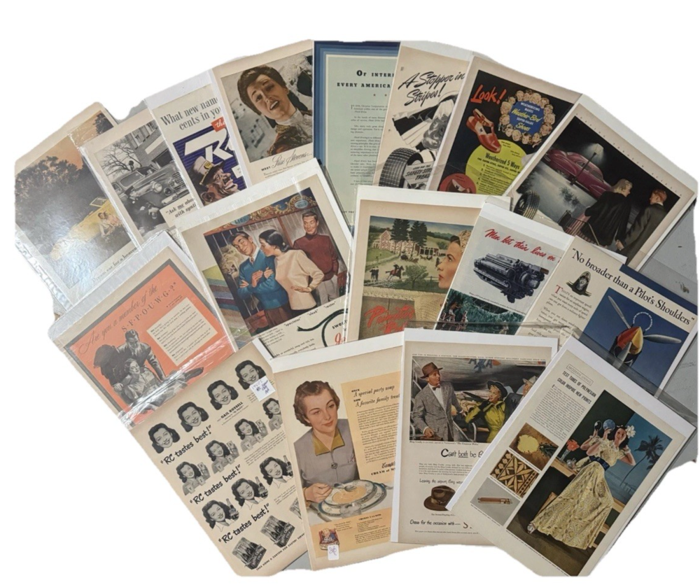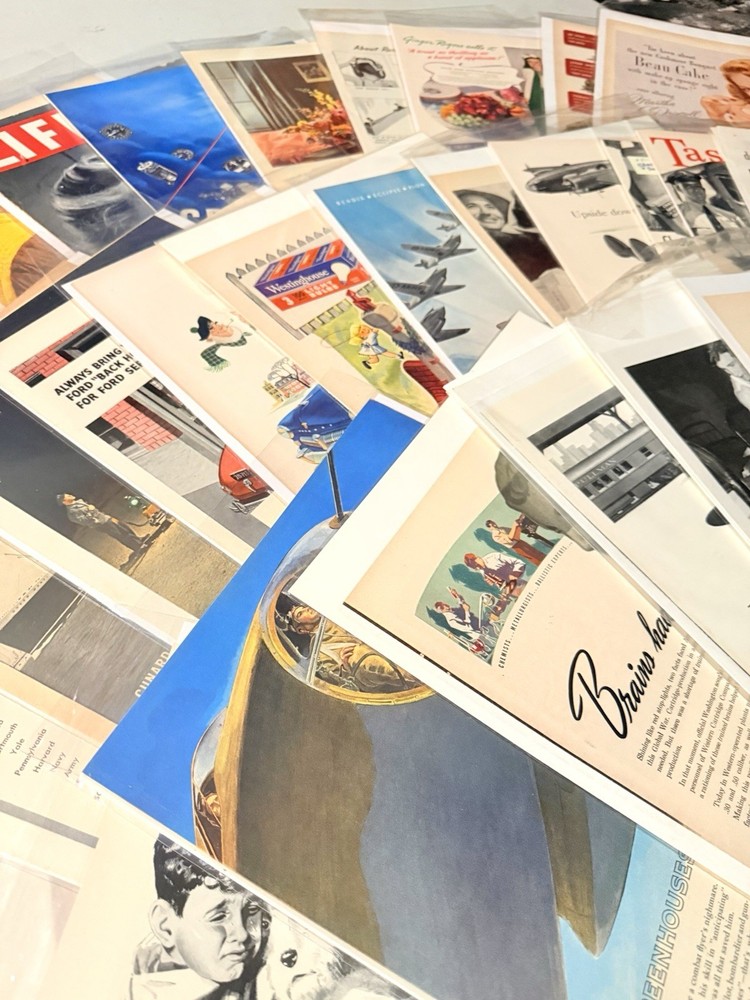 Item Identification • Type: Vintage print advertisements and graphic arts ephemera collection • Quantity: Fifty-six total pieces • Contents: Fifty-five original vintage print advertisements and one countertop printer’s sample advertisement • Format: Complete two-page spreads with printed content on both front and back (print ads) • Era: Mid 20th century • Decades Represented: 1940s–1950s • Country of Origin: United States • Advertising Subjects: Mid-century Americana, fashion, food and beverage branding, Hollywood film promotion, aviation and military imagery, automotive design, lifestyle and consumer culture • Printer’s Sample: Wheelwright Ionic Blank paper stock sample by Henry Lindenmeyr & Sons • Sample Specifications: 10-ply white paper, 22 x 28 size, 133-screen halftone • Ink & Press (Sample): Sigmund Ullman Essyew Walnut ink, Sleight’s Gold Ink, printed on a Universal Press • Original/Reproduction: Original vintage pieces, not reproductions • Storage: Individually sleeved for protection • Vintage Status: Vintage originals ITEM DESCRIPTION This estate-curated collection presents a visually rich archive of mid-century American advertising and print culture, spanning the 1940s and 1950s. The fifty-five print advertisements are complete two-page spreads with printed content on both front and back, offering a fuller and more immersive presentation than the single-page pulls commonly found on the market. Subjects range from iconic food and beverage branding and fashion illustration to Hollywood film promotion, aviation, military imagery, automotive design, and domestic Americana, capturing the optimism, design language, and consumer energy of the era. The inclusion of a vintage countertop printer’s sample advertisement adds depth and credibility to the collection, providing insight into professional paper stock, ink usage, and halftone printing techniques used during the period. Together, the pieces form a cohesive and highly displayable archive suited for framing, interior décor, studio reference, graphic design inspiration, or serious ephemera collecting. All advertisements are original vintage examples and are individually sleeved to preserve condition and presentation. FAST SHIPPING WITH EXTRA CARE • Every order is video recorded during packing and unpacking to ensure authenticity • Tamper-proof seals applied where applicable for added buyer protection • Eco-conscious shipping with recycled materials when possible • Estate Curated items, including high-end collector pieces to everyday essentials • Extensive selection of action figures and collectible toys, from pristine original packaging to vintage and antique finds • Visit our eBay preferred vendor store, Hampton to Hampton: https://www.ebay.com/str/hamptontohampton