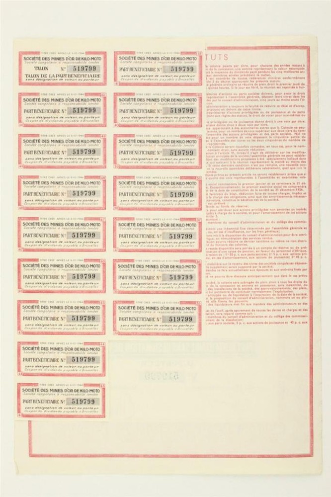 Vintage Paper 1944 KILO MOTO Belgian Congo Gold Stock Coupon Mining Certificate Vintage Paper 1944 KILO MOTO Belgian Congo Gold Stock Coupon Mining Certificate Click images to enlarge Description We are listing a number of new items this week. Please check out our other listings. We are happy to combine shipping whenever possible to save you money. Vintage Paper 1944 KILO MOTO Belgian Congo Gold Stock Coupon Mining Certificate. Several uncut coupons on back. Obsolete country. We try to examine all pieces closely and note any issues. Please ask any questions prior to bidding to ensure you are satisfied with your purchase. We are a registered eBay trading assistant and are bonded through BUY SAFE. Bid with confidence. Flat rate shipping in the US is $4.00 Payment Payments are accepted through PayPal. In the future eBay managed payments will be added. CUSTOMS/DUTY - INTERNATIONAL CLIENTS ONLY : In January 2008, eBay issued instructions to sellers so that all buyers from outside the USA would be fully and uniformly informed regarding customs and taxes on items coming from the USA. The text and format are mandated by eBay. Import duties, taxes and charges are not included in the item price or shipping charges. These charges are the buyer's responsibility. Please check with your country's customs office to determine what these additional costs will be prior to bidding/buying. These charges are normally collected by the delivering freight (shipping) company or when you pick the item up, do not confuse them for additional shipping charges. We do not falsely lower merchandise values or mark items as "gifts" - US and International government regulations prohibit such behavior. Requests to do so will be forwarded to eBay's fraud department. Our international clients are very important to us. Please let us know if you have any questions. Shipping We ship by USPS mail only unless special arrangements are made. We ship the next business day after payment is made/cleared. Weekends and holidays are not business days. Please make sure that Paypal and eBay have your correct address and PO box if necessary. If you are an international client, please make sure we have a valid address for you in English to avoid shipping delays. We only ship to verified confirmed addresses. INTERNATIONAL CLIENTS: Please note that delivery times are ESTIMATES. First class international mail can take 2-6 weeks for delivery depending on delays in customs. There is very limited tracking on first class air mail. PRIORITY MAIL international does include tracking and insurance. Terms of Sale We offer a no hassle 30 day return policy. We refund the purchase price only, not the shipping, unless we have made an error. Please ask all questions prior to bidding. PLEASE NOTE: If an item has been misrepresented in error, or you are unhappy for any reason, please contact us directly through eBay messages only, not regular email PRIOR to opening a case for FAST resolution of your concerns. Please allow us a minimum of 24 hours to respond to your concerns. About Us Thank you for visiting AJ's Antiques and Art Gallery, LLC. We are a family owned antiques appraisal and consulting service located in Philomath, Oregon. Shop securely. We are bonded through BUY SAFE and are a registered trading assistant on eBay. We do not share your information with any third parties. Contact Us Please use eBay messages to contact us for fast resolution of your concerns. We try to respond to all messages within 24 hours. On weekends and holidays our offices are closed. Pictures sell! Auctiva offers Free Image Hosting and Editing. 300+ Listing Templates! Auctiva gets you noticed! The complete eBay Selling Solution. Track Page Views With Auctiva's FREE Counter