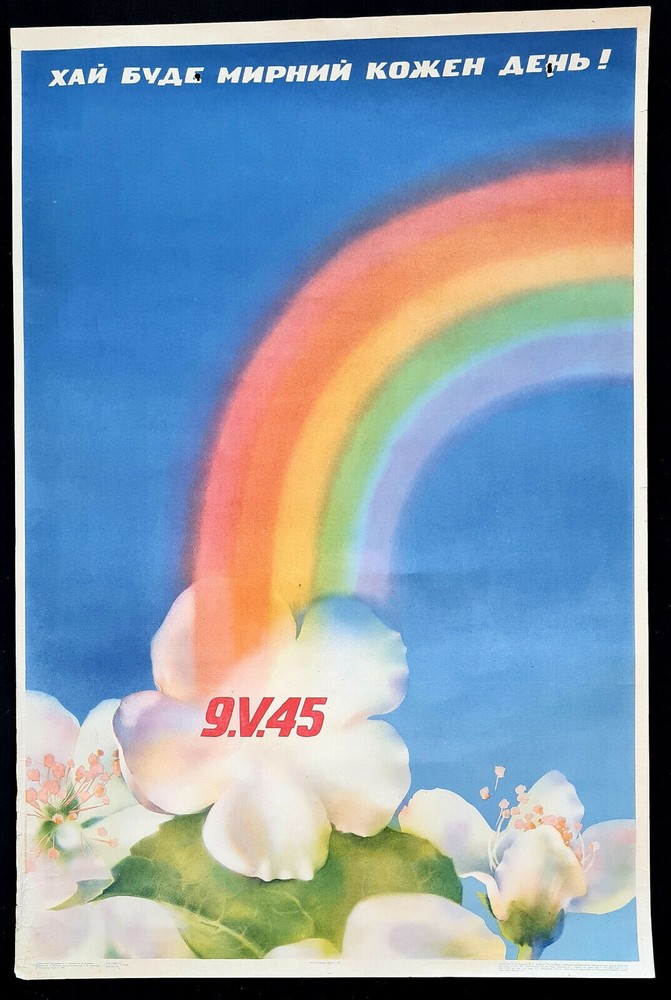 Original slogan on the poster: ХАЙ БУДЕ МИРНИЙ КОЖЕН ДЕНЬ! 9.V.45 Literally English translation of the main: LET IT BE EVERY DAY PEACEFUL! 9.V.1945 POSTER ARTIST: MINENOK S.P. PRINT YEAR: 1987 SUBJECT: PEACE LANGUAGE: RUSSIAN PRINT RUN: 86.000 PUBLISHED BY: "POLITIZDAT UKRAINY", KIEV SIZE: IN: 24 x 36 ¼ = CM: 61 x 92 CONDITION: FLAT, GOOD Description & Historical Background — — — — — — — — — — — — — — — — — — — — — — — — — — This vibrant Soviet poster was created in 1985 by Ukrainian artist Minenok S.P. to commemorate Victory Day on May 9, 1945 —the end of World War II in Europe. The central element of the design features a blossoming white flower and a radiant rainbow emerging from it, symbolizing hope, peace, and renewal in the wake of wartime devastation. The bold red inscription 9.V.45 refers to May 9th, 1945, the day Nazi Germany capitulated to the Soviet Union. The poster was issued in the Ukrainian SSR and reflects both local cultural aesthetics and a broader Soviet message of peace and remembrance. It is part of a period in the mid-1980s when Soviet poster design became more poetic and symbolic, emphasizing emotional resonance over ideological slogans. ✯ Style — — — — — — — — — — — — — — — — — — — — — — — — — — This poster exemplifies lyrical socialist realism , with soft airbrushed gradients and harmonious composition. The natural imagery—blossoms, rainbow, and sky—express a hopeful postwar vision. Designed to evoke emotional optimism, it reflects a shift in 1980s Soviet graphic design toward more peaceful and symbolic themes, especially in commemorative works. ✯ Artist — — — — — — — — — — — — — — — — — — — — — — — — — — Minenok S.P. Biographical details on S.P. Minenok remain scarce, but he was an active artist in the Ukrainian Soviet Socialist Republic during the 1980s. His work often appeared on celebratory and environmental posters, marked by gentle color palettes and themes of peace, beauty, and social unity. ✯ Condition — — — — — — — — — — — — — — — — — — — — — — — — — — Very good vintage condition. Some minor creasing and light edge wear consistent with age. Colors remain strong and well-preserved. Please review the provided photos for exact condition details.