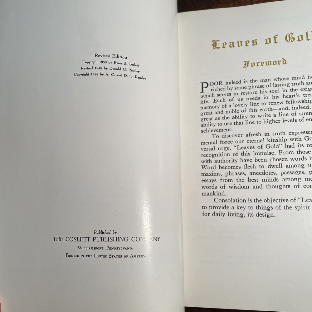 This vintage hardcover book, titled "Leaves of Gold," is a collection of memorable phrases and prayers from various authors. It was originally published in 1948 by The Coslett Publishing Company and is now available in a revised edition. The book is perfect for young adults and adults who are interested in religious and spiritual topics. The book features faux leather binding and large print, making it a great addition to any collection. It is written in English and contains a variety of short stories that are sure to inspire readers. This book is a must-have for anyone who is looking for a unique and meaningful gift.